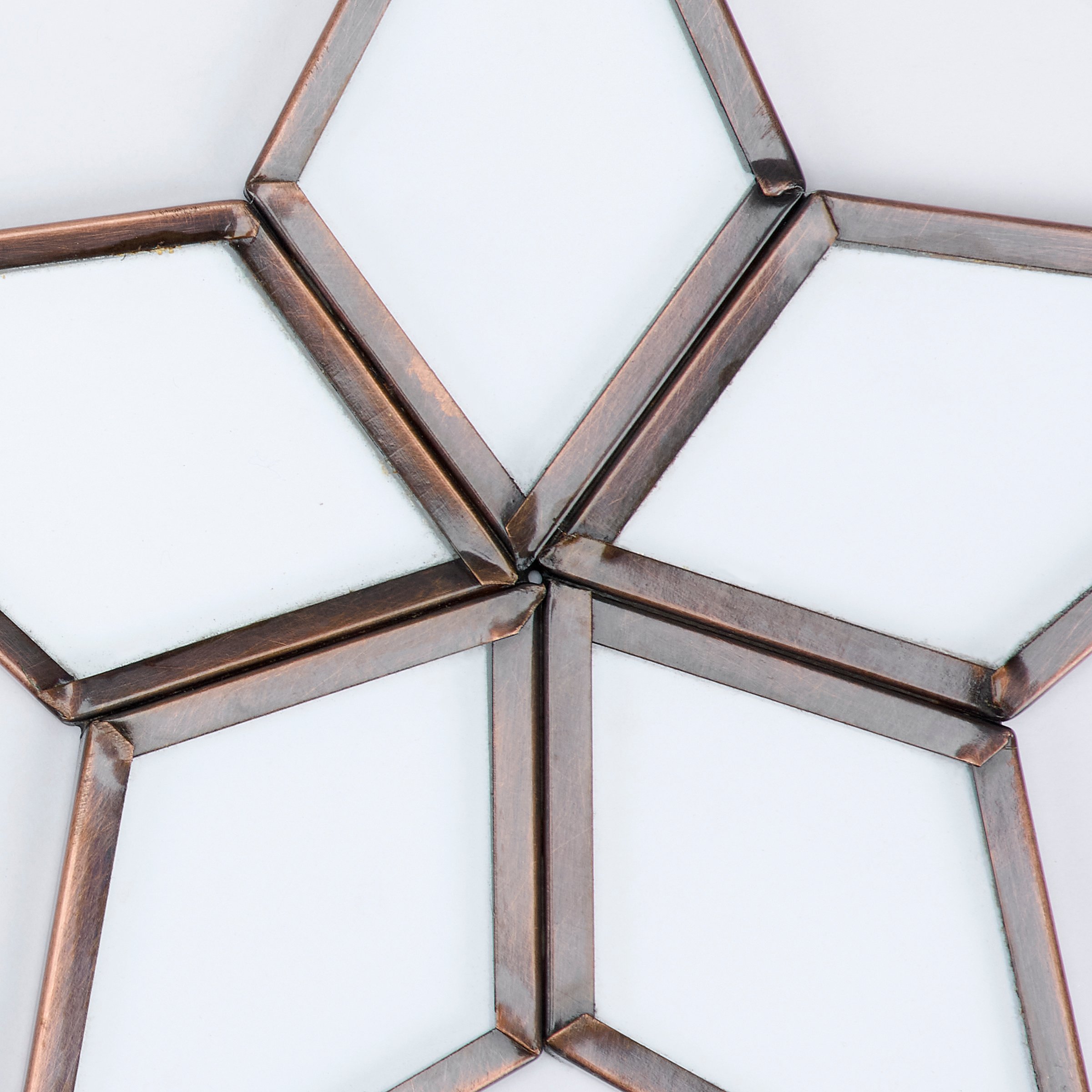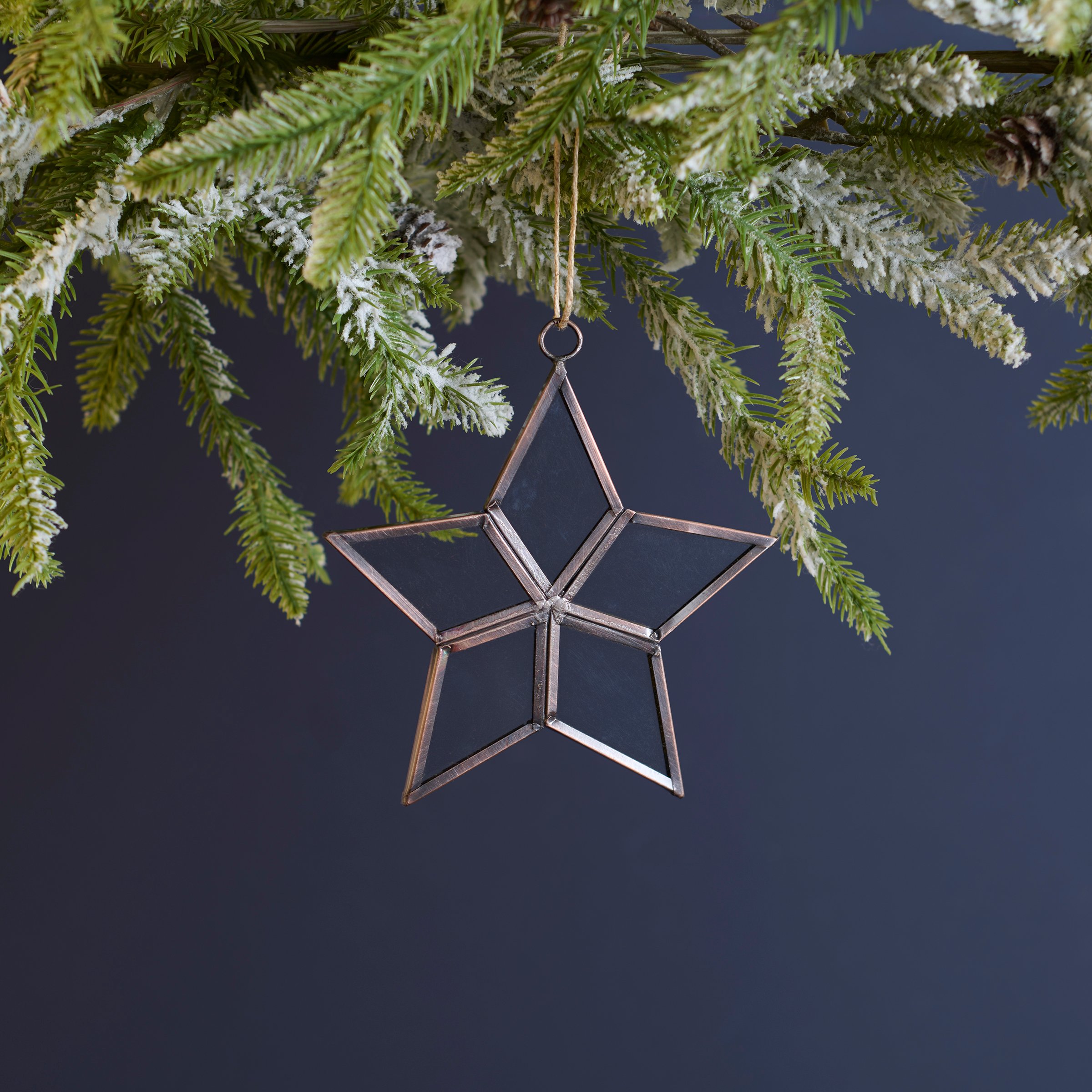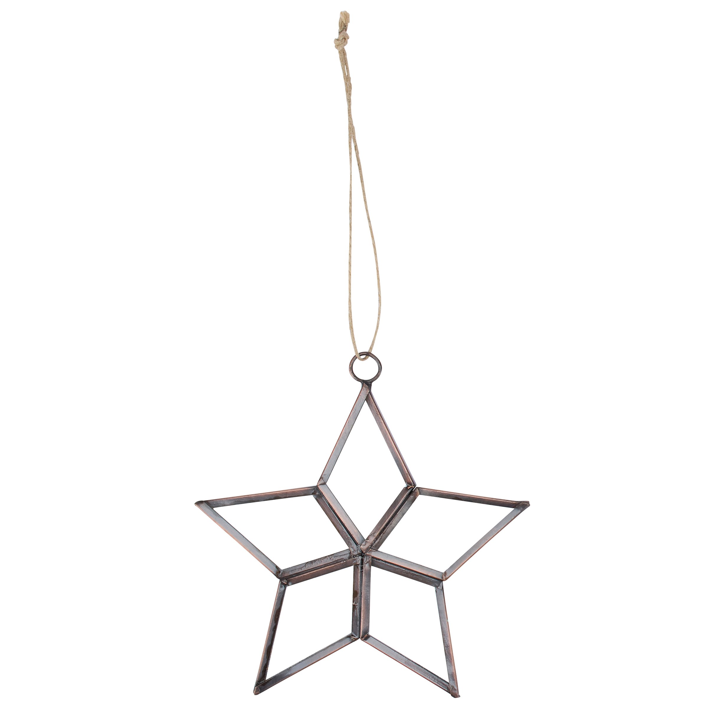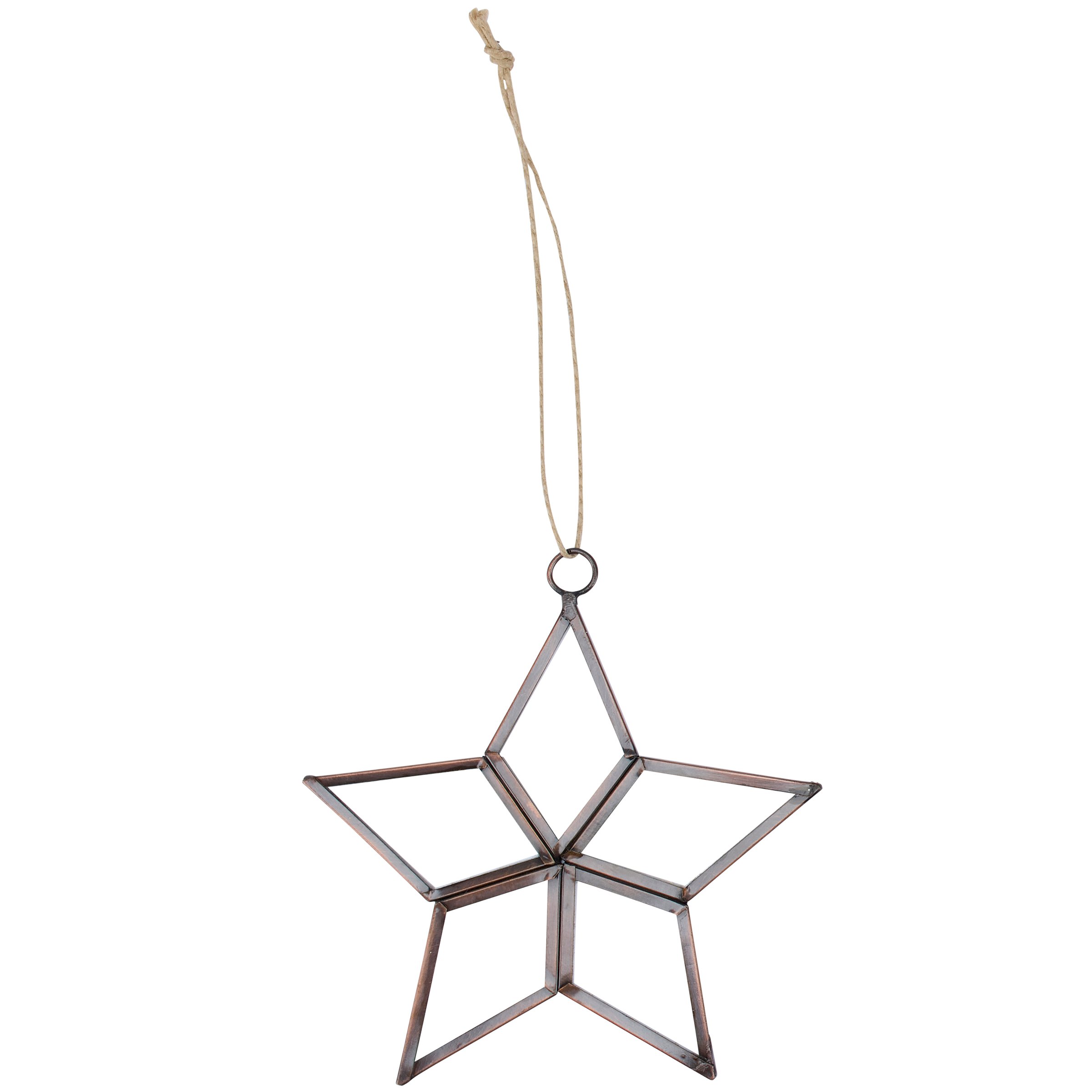 An ornament from our v featuring a star inspired design made with rustic metal lined glass shapes. Our glass Clear Star ornament is ready to hang for display via the included top loop and string hanger. A vintage home accent perfect for a Christmas tree or for gifting.