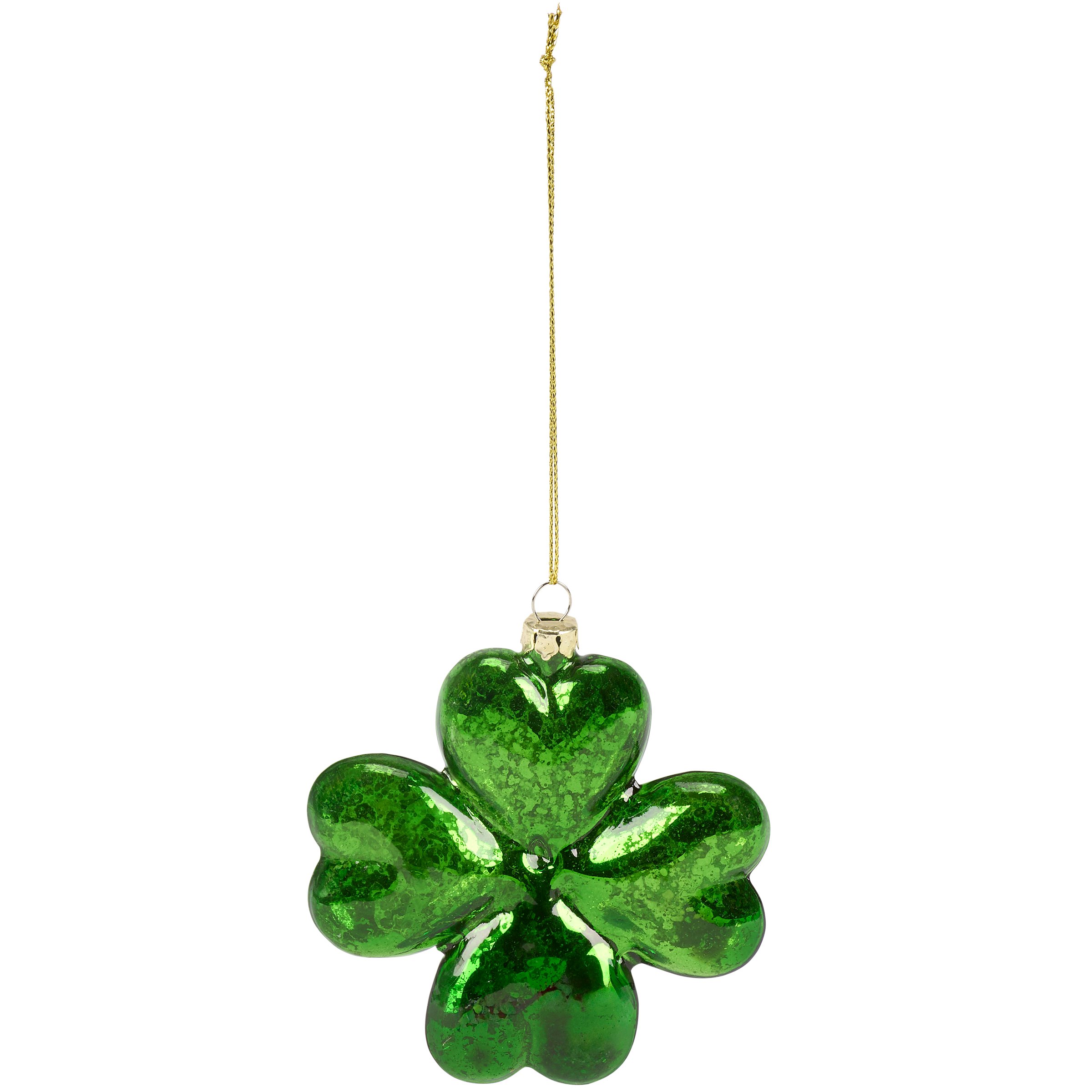 A glass ornament from our St. Patrick's Day Collection displaying a shamrock design with green glass and distressed details. Our glass Shamrock ornament is ready to hang for display via the included top loop and string hanger. A vintage style gift perfect for adding personality to a Christmas tree or for seasonal St. Patrick's Day displays.