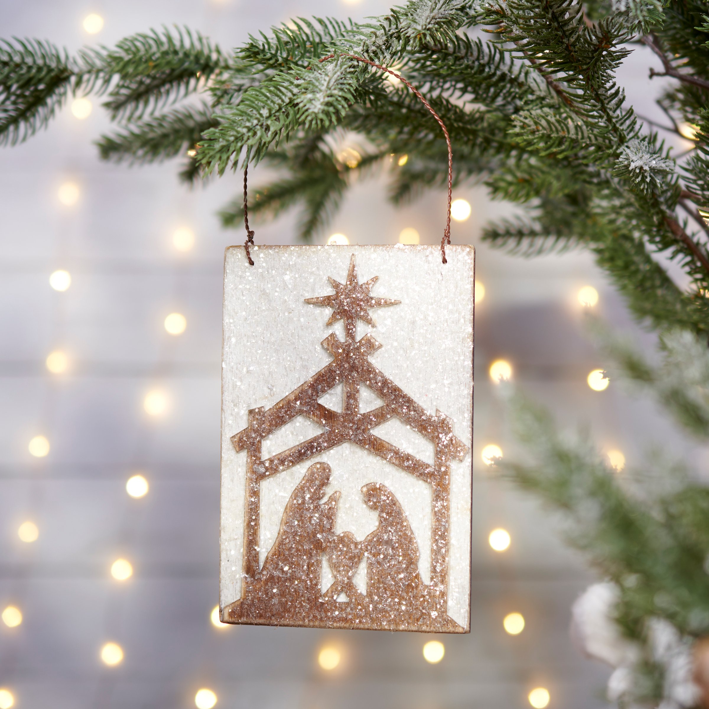 A wooden ornament from our Christmas Collection displaying an embossed nativity design with mica coating for a frosty appearance. Seasonal ornament features distressed details with coordinating natural wood on the sides and back. Our Holy Night ornament is easy to hang for display via attached twisted wire hanger. A rustic nativity-themed ornament perfect for seasonal display.