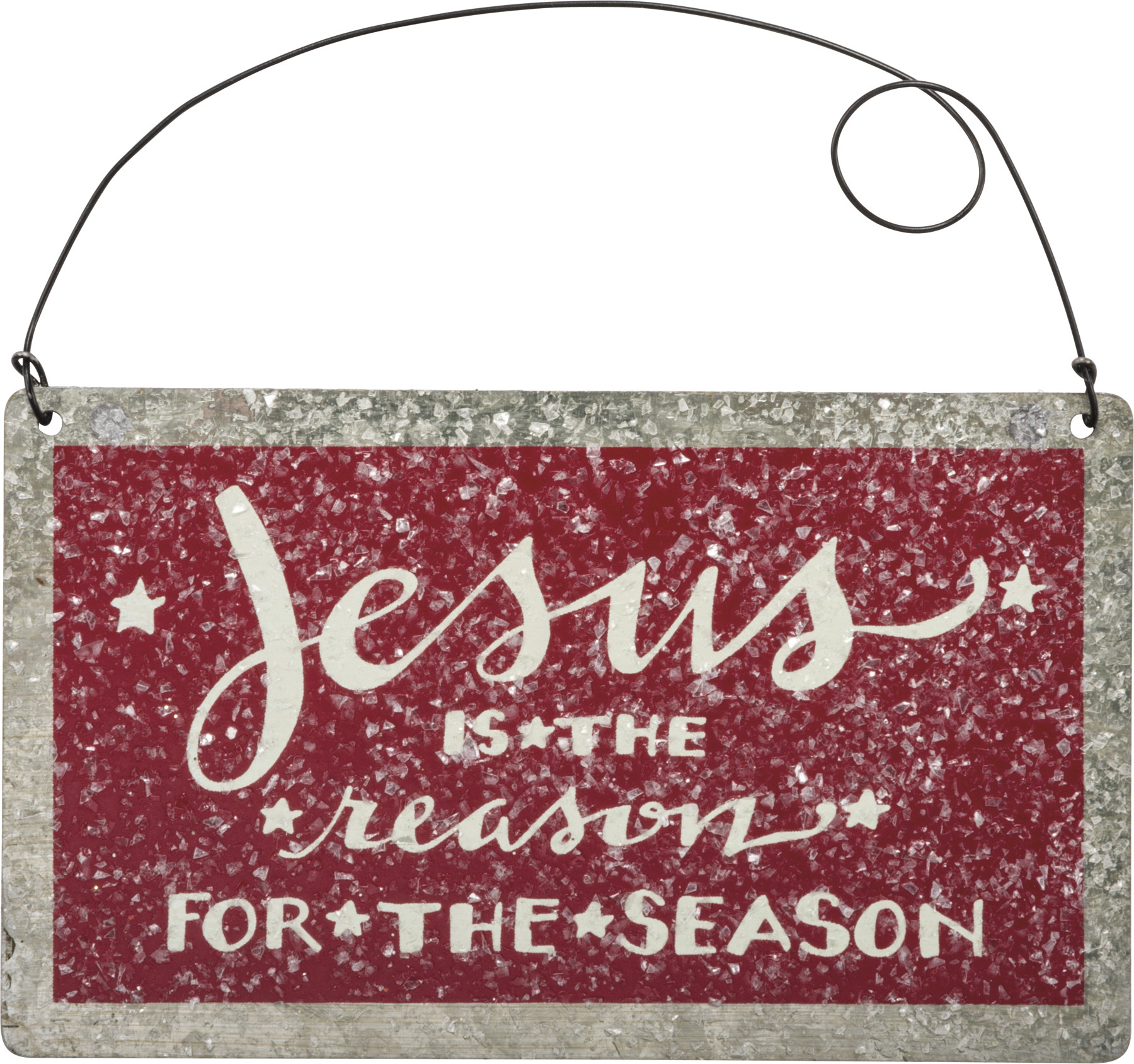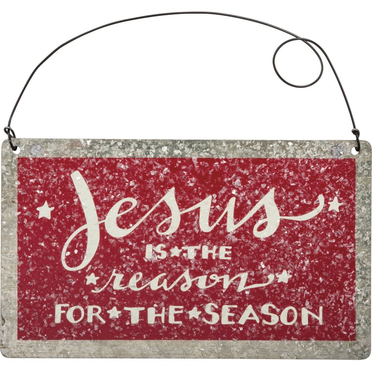 A tin ornament for Christmas featuring a hand lettered "Jesus Is The Reason For The Season" sentiment, textured coating for snowy effect, and dimensional star accent. Contains a twisted top wire loop for easy hanging.