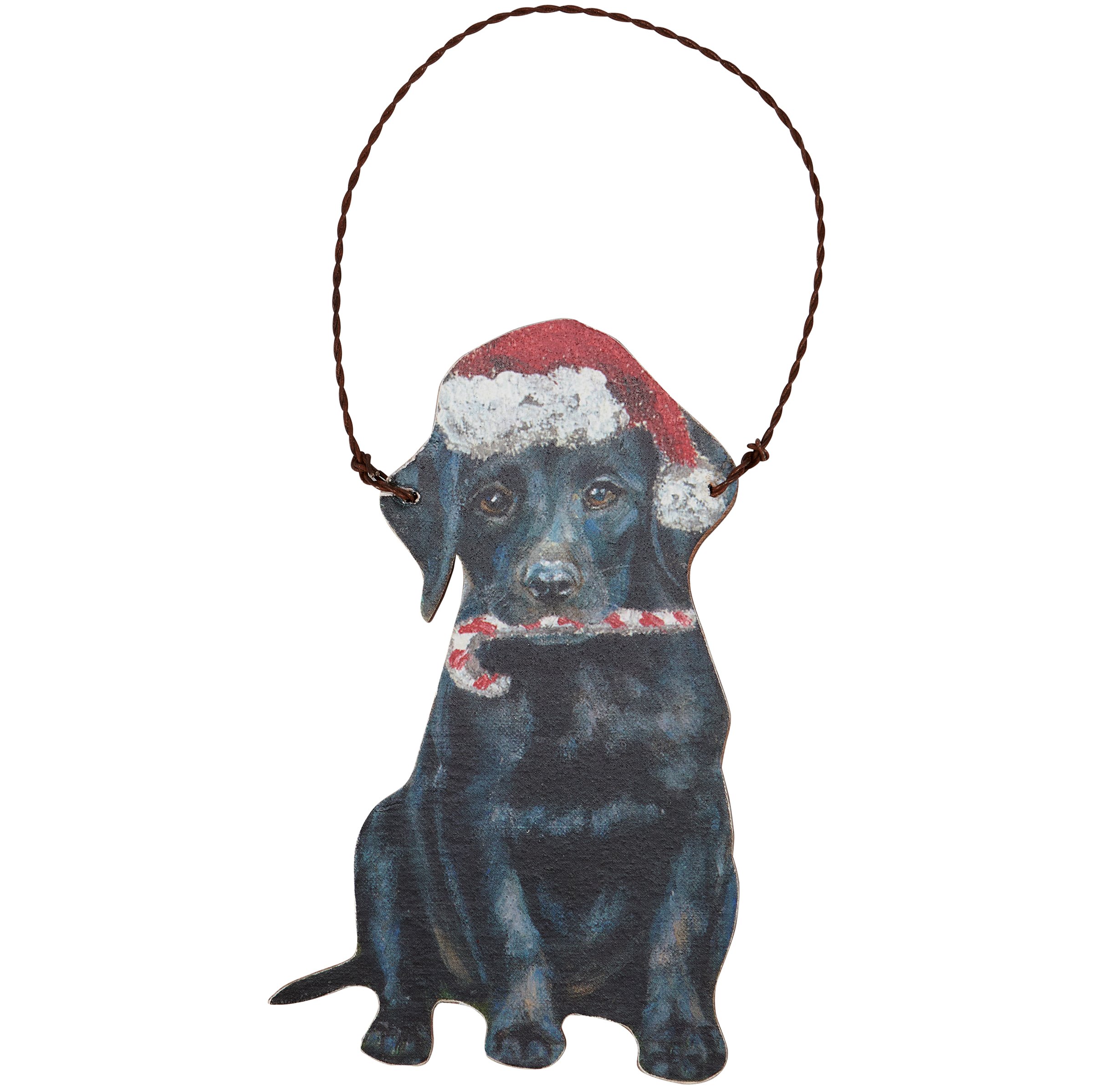 A wooden ornament from our Christmas Collection cut in the shape of the displayed holiday dog design featuring a charming black labrador wearing a Santa hat with a candy cane in its mouth. Design is replicated from original artwork painted onto burlap canvas, giving the art a unique depth and texture. Seasonal ornament features distressed details with coordinating natural wood on the sides and back where it can be personalized with owner's pet name and details. Our Black Lab Candy Cane ornament is easy to hang for display via attached twisted wire hanger. A fun holiday gift combining a love of Christmas and pets.