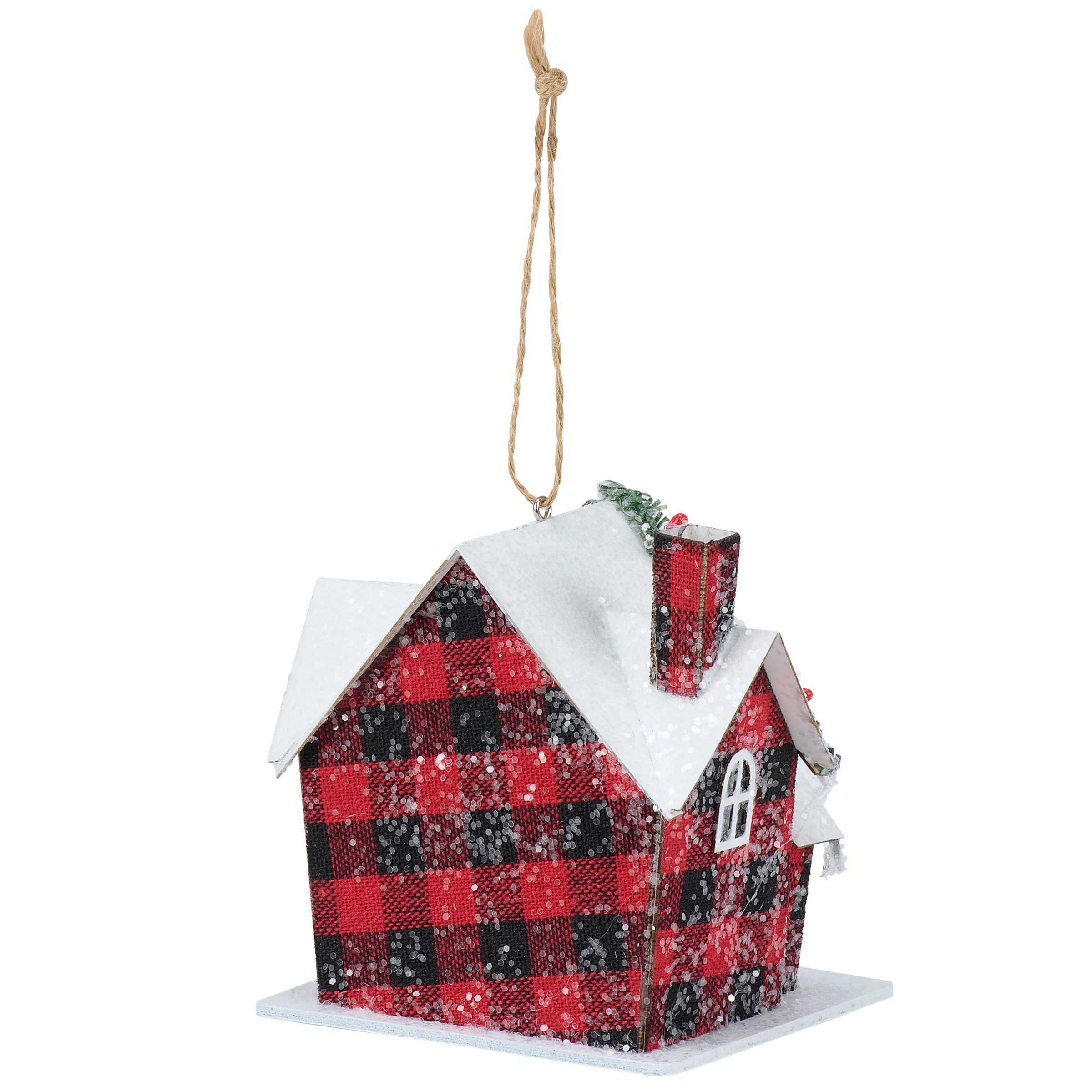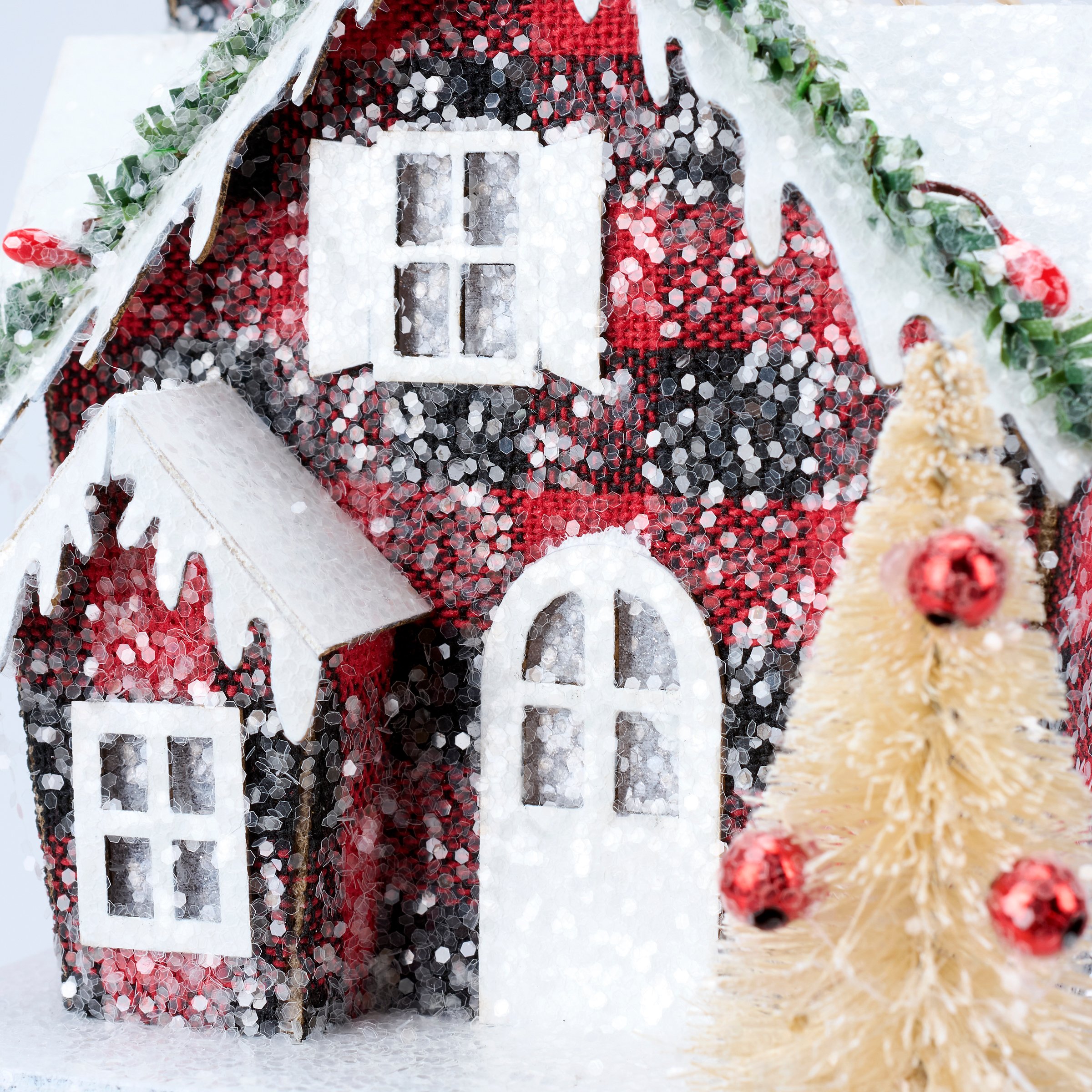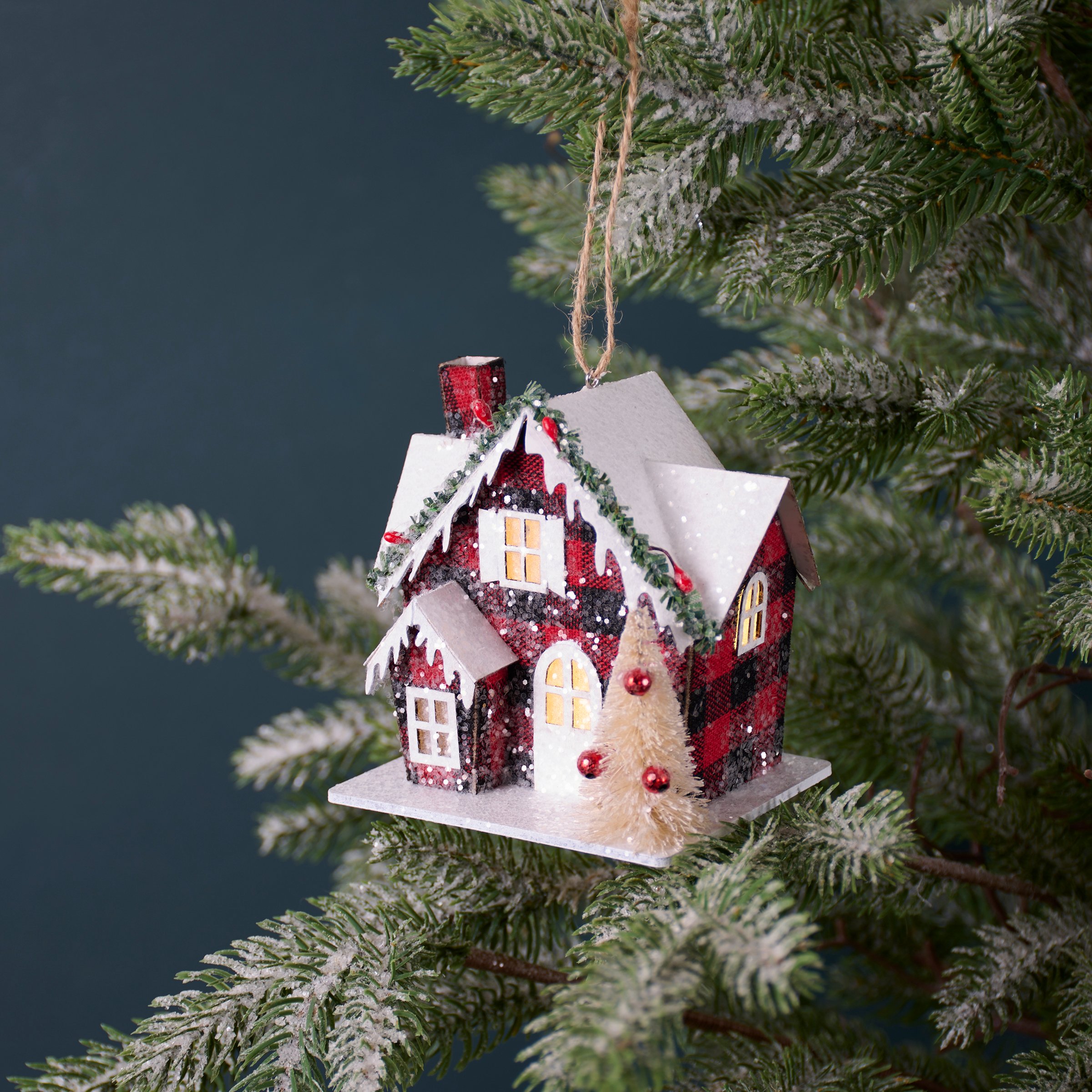A decorative ornament from our Christmas Collection displaying a winter plaid house design with a bottle brush tree and mica detail for a snowy effect. Winter house ornament features a light source inside that illuminates the windows powered by 3 LR44 batteries (not included). Our Lighted Plaid House ornament is ready to hang via the attached jute string hanger. A winter themed home accent perfect for adding seasonal lighting to any Christmas tree.