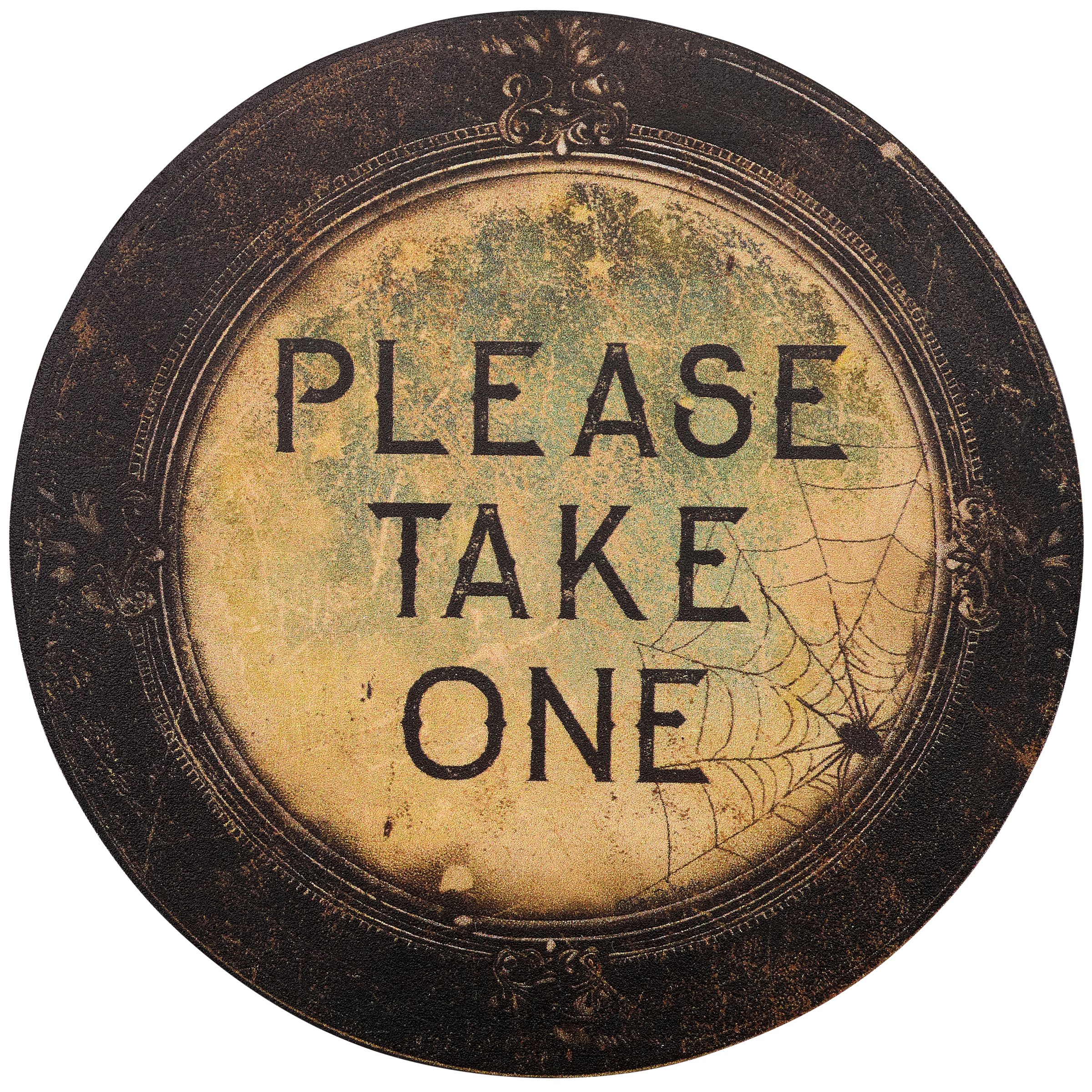 A wooden ornament from our Halloween Collection displaying a rustic design of an ornate emblem with a "Please Take One" sentiment perfect for using with Halloween treat displays. Halloween ornament features coordinating black color on the sides and back. Our Please Take One ornament is easy to attach to a treat bucket using the attached clip on the back. A rustic Halloween home accent ideal for trick or treating stations.