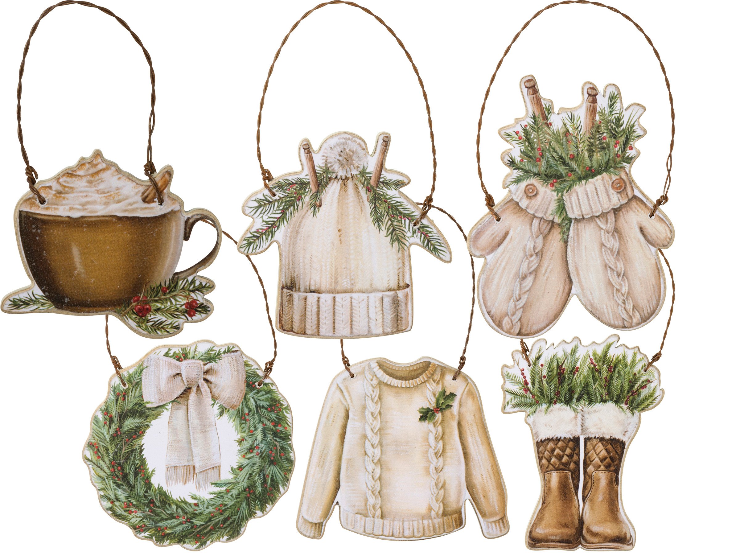 A set of six ornaments from our Christmas Collection featuring mittens, boots, beanie hat,sweater, wreath, and cocoa with bristled branch accents. Complements well with coordinating styles for a cozy and cohesive collection. Our Cozy Christmas ornaments come with wire hangers.
