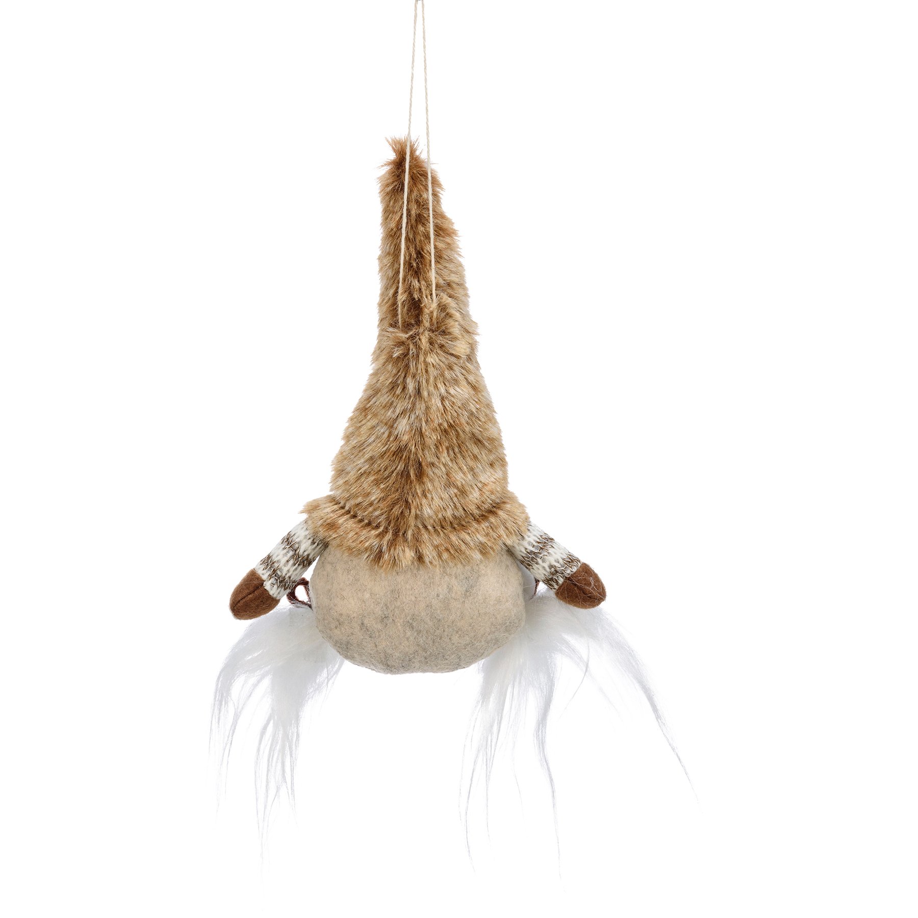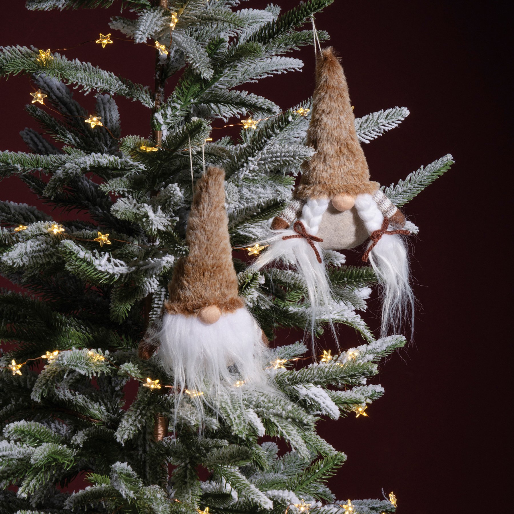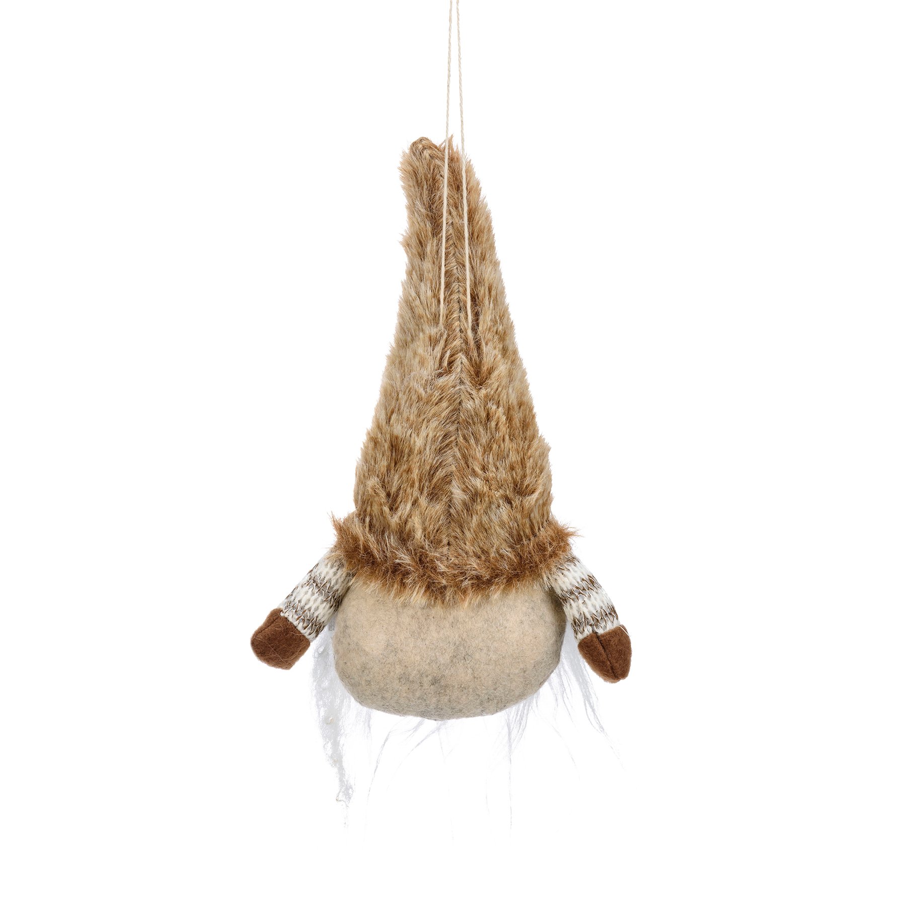 A set of two felt gnome ornaments with fabric hats featuring an autumnal color palette. Ornaments easily hang by string loops and pair well with other fall décor items for a cohesive display.