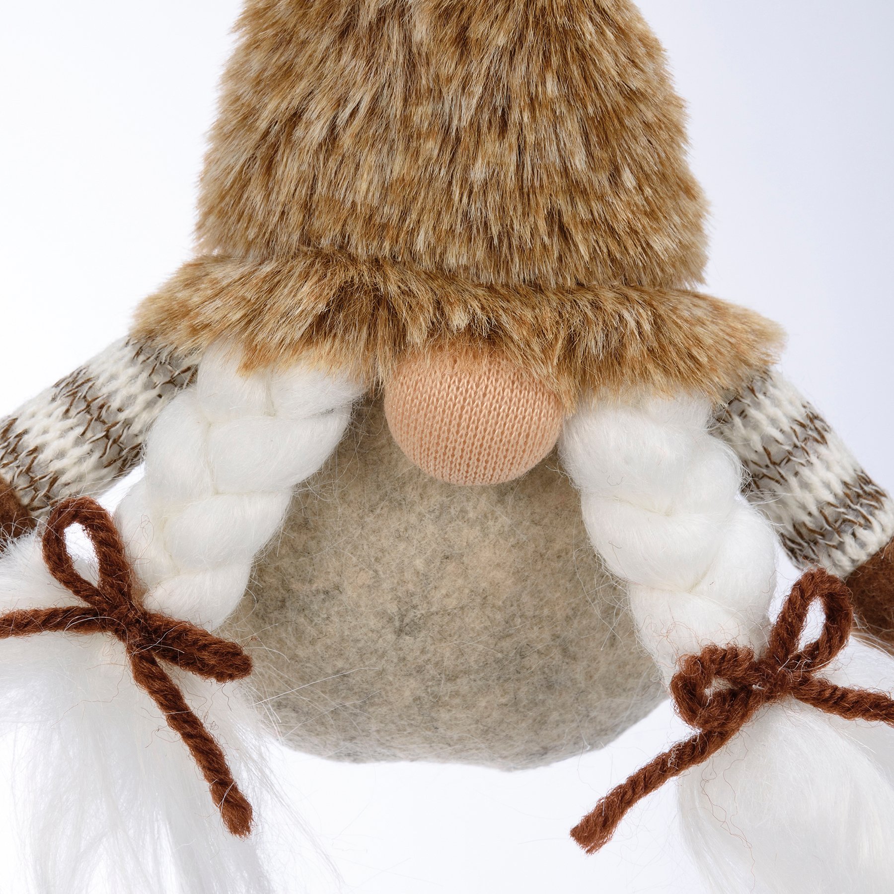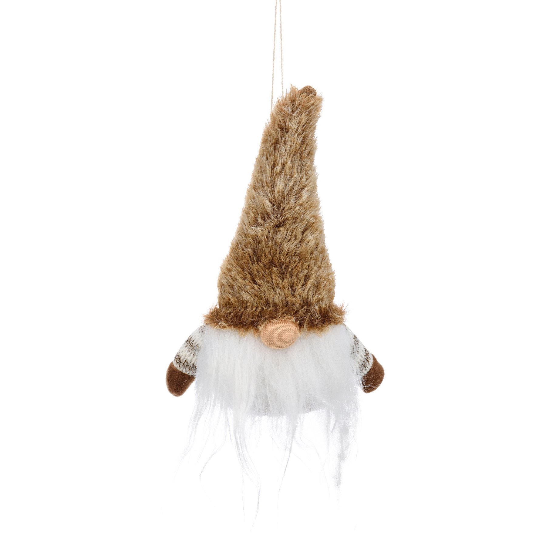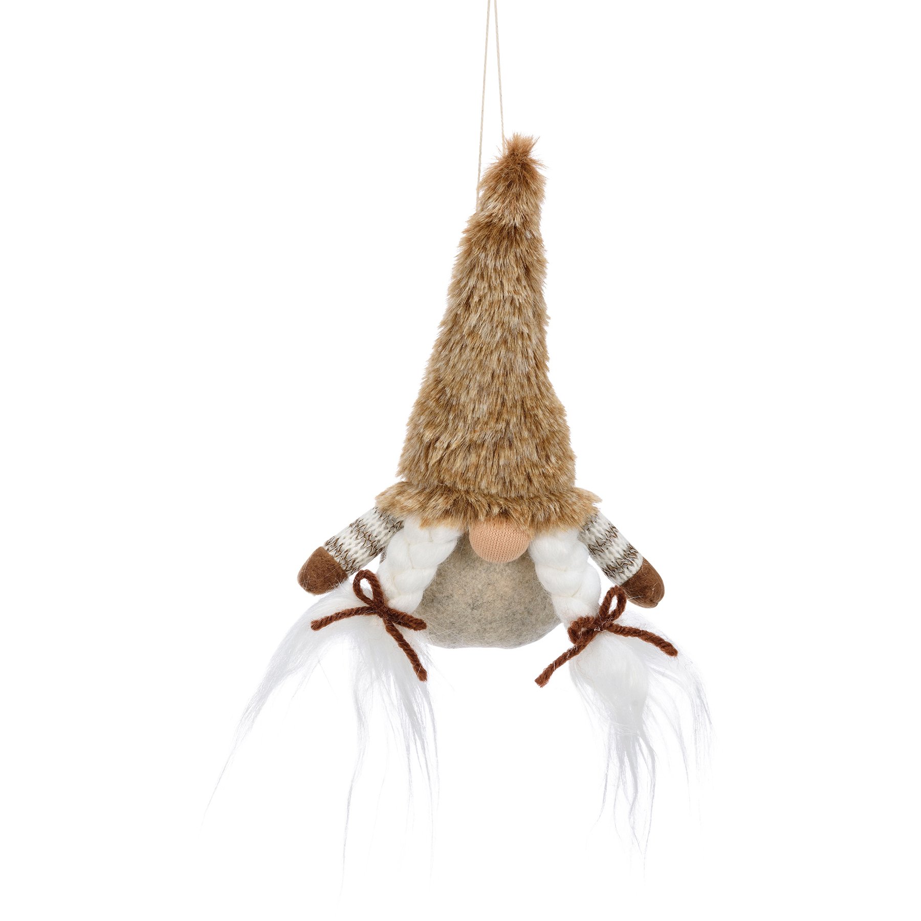 A set of two felt gnome ornaments with fabric hats featuring an autumnal color palette. Ornaments easily hang by string loops and pair well with other fall décor items for a cohesive display.
