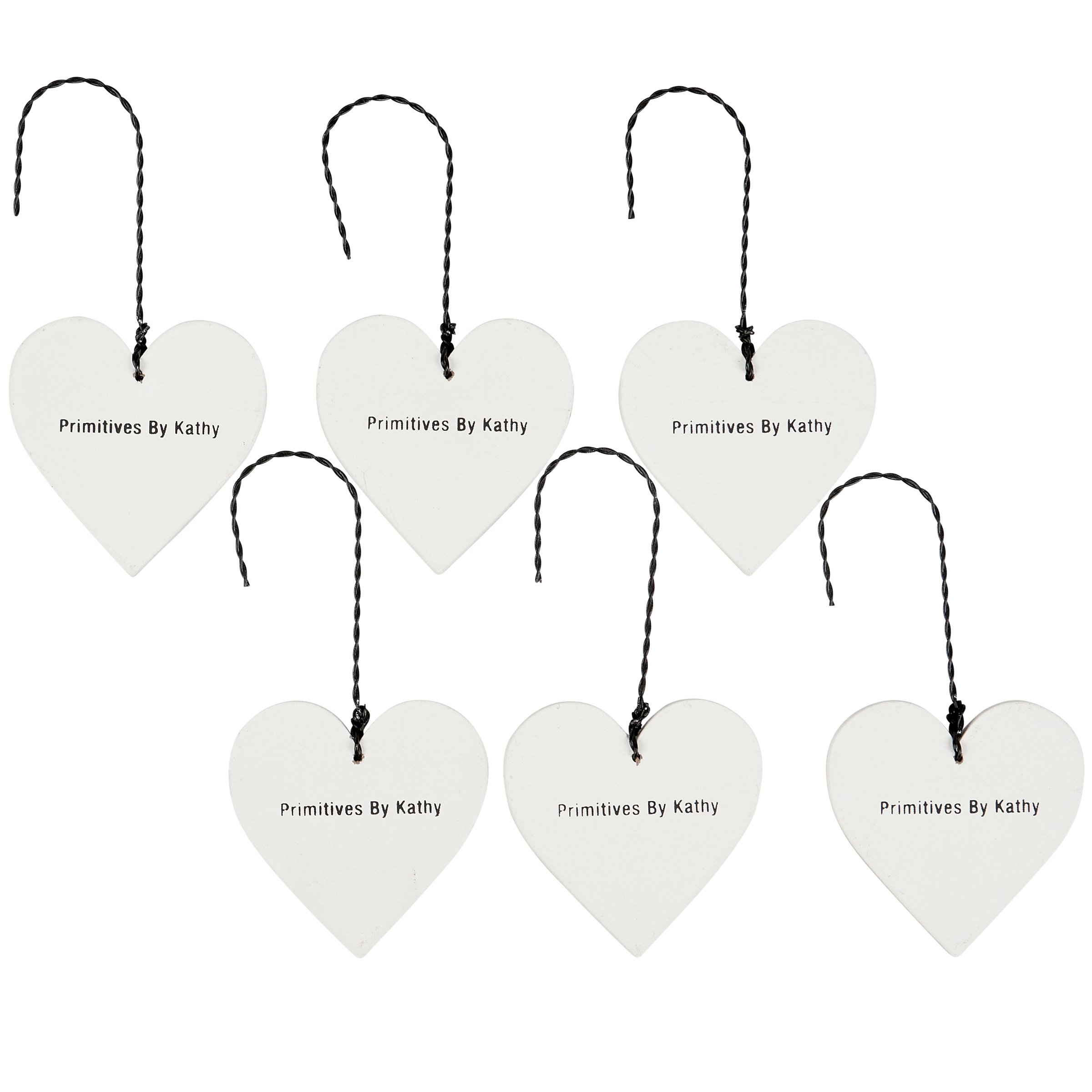 A wooden ornament set from our Valentine's Day Collection featuring six heart shaped designs and valentine inspired sentiments. Ornaments display individual love-themed sentiments that read "It's You," "Love You More," "You Are Loved," "XOXO," "I Love Us," and "Always & Forever." Easy to hang via attached twisted wire hangers. Our Love You More ornament set comes packaged in poly bag tied with ribbon and paper between each ornament. A set of love-themed ornaments perfect for seasonal display.