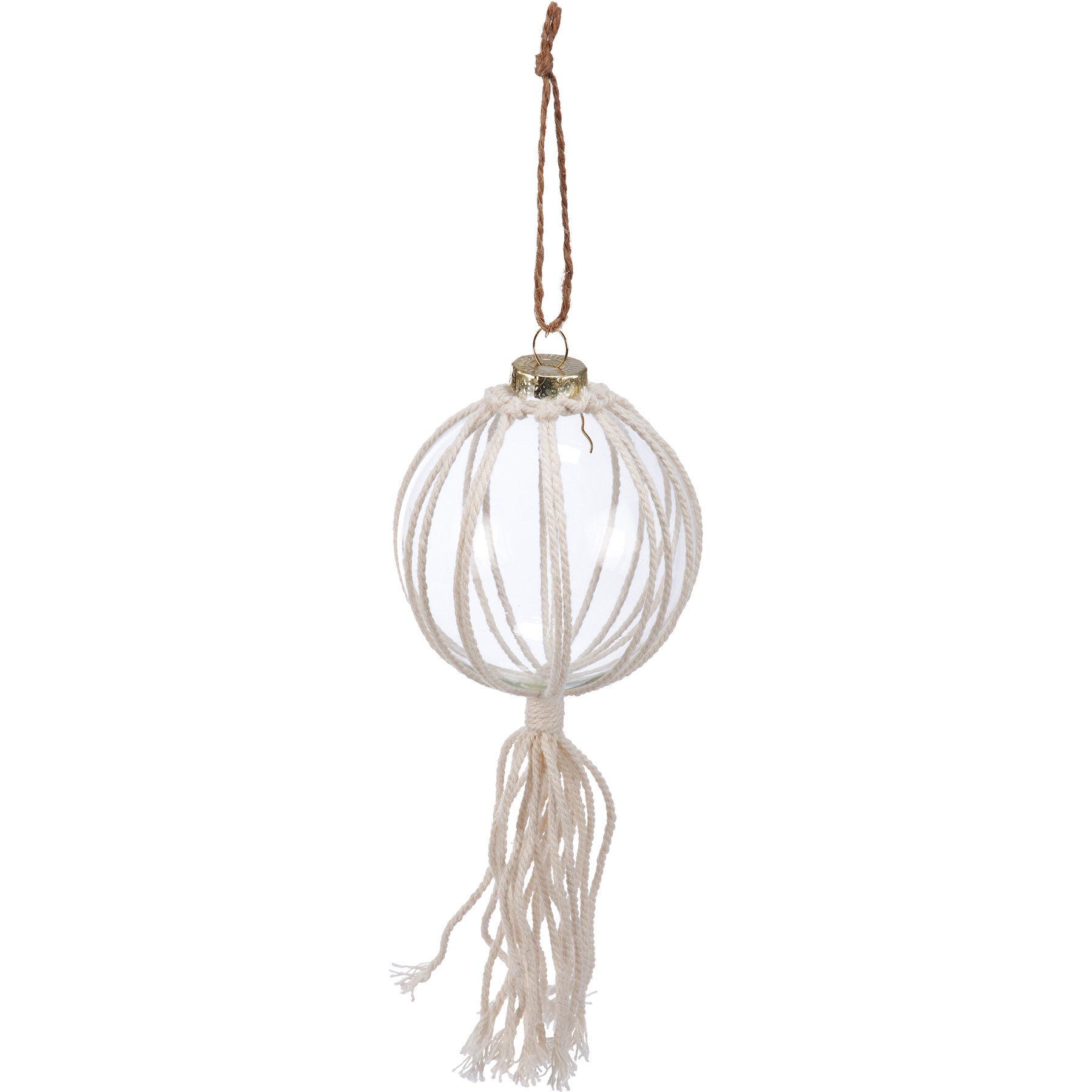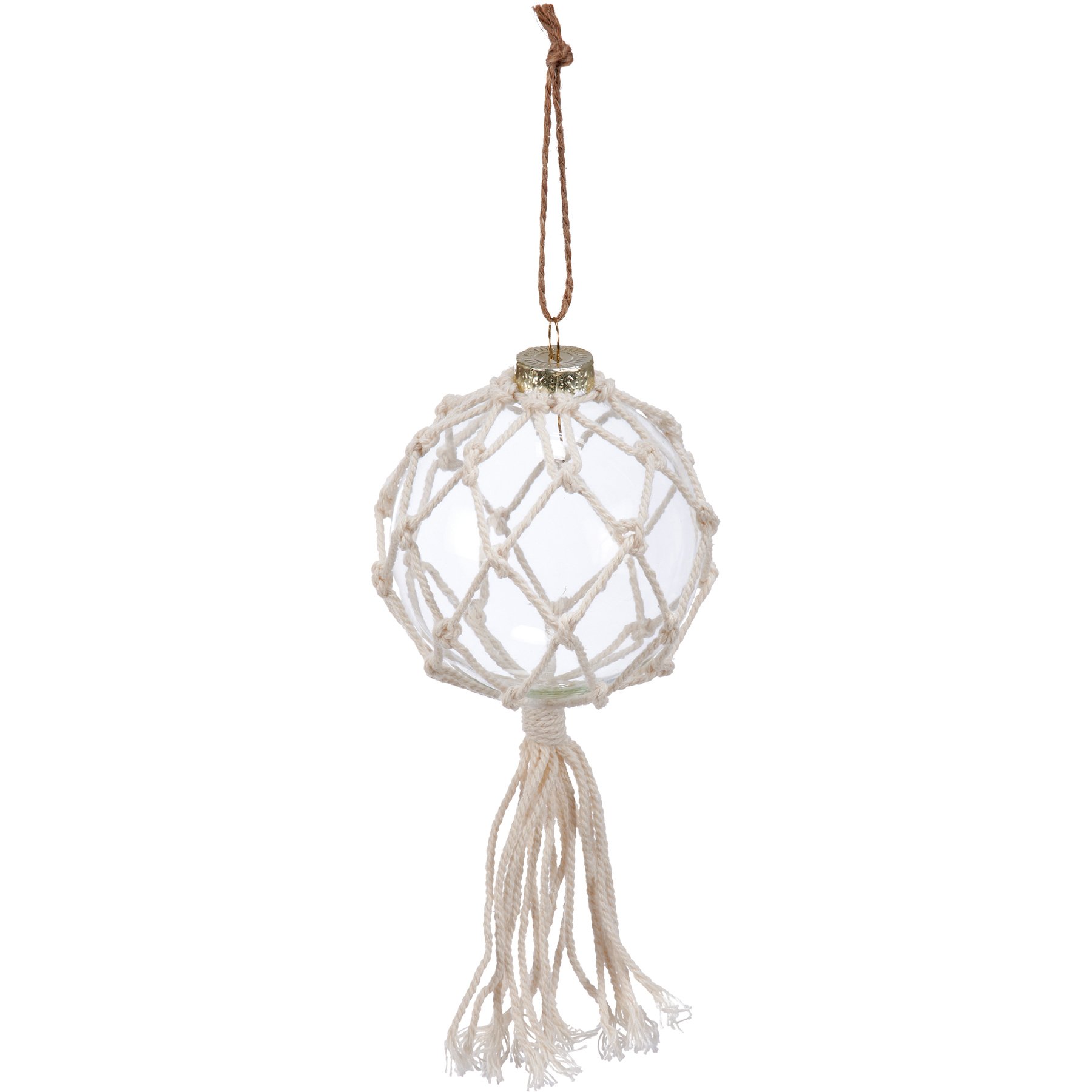 A bohemian inspired ornament set from our Christmas Collection displaying clear glass bulbs with macrame cord wrapping in varying designs. Set includes 3 unique ornaments with complementing gold tops and jute hangers. Our macrame balls ornament set coordinates well with our natural bohemian holiday décor. Packaged in box, separated by cardboard, and protected by plastic sleeve for visibility.