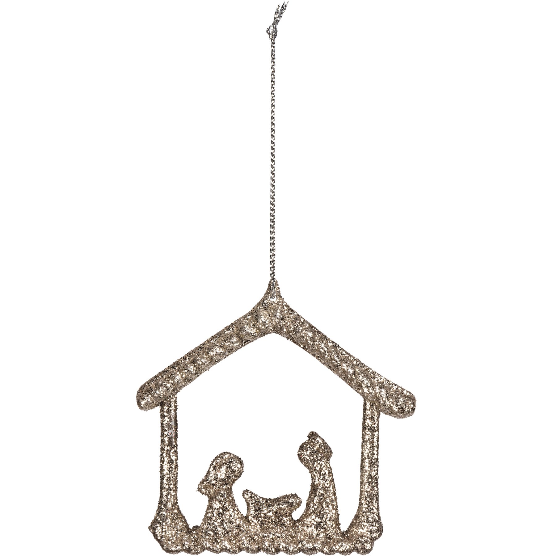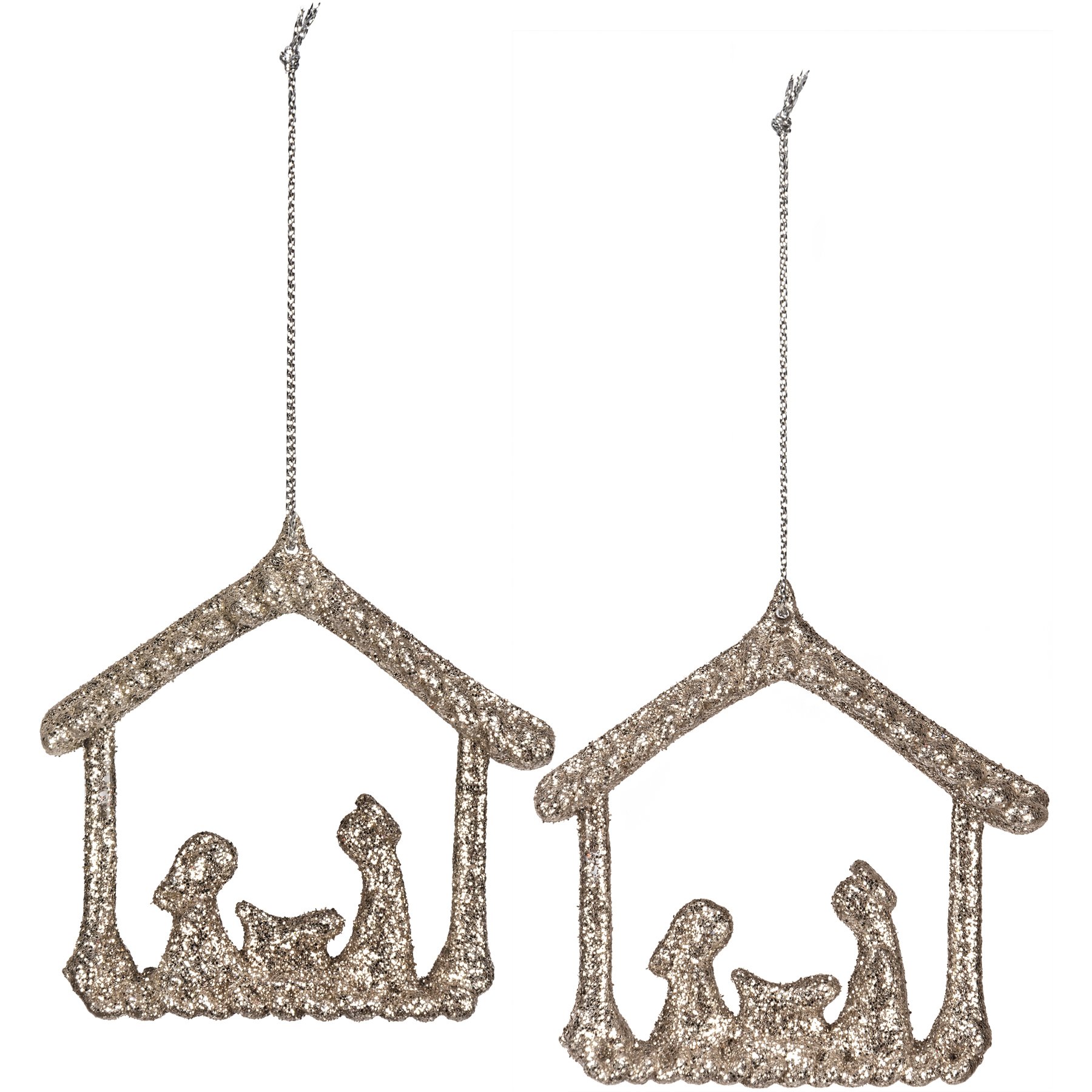 A set of two plastic Nativity ornaments featuring an all-over champagne-colored glitter coating with string loops for easy hanging. Neatly packaged in a polybag and tied with ribbon.