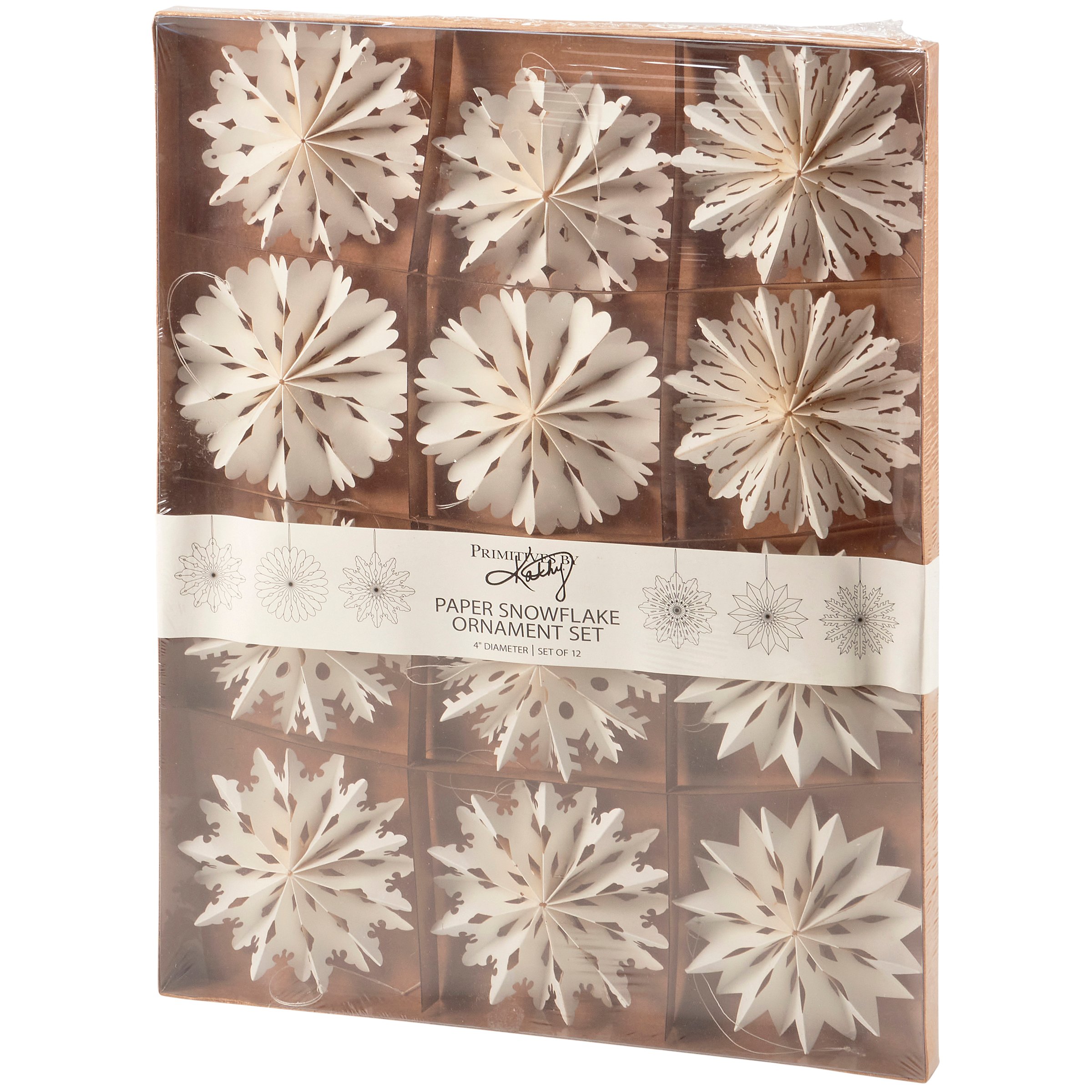 A set of paper ornaments from our Christmas Collection including 12 cutout snowflakes. Seasonal ornaments feature six different designs with a folding paper style. Our Paper Snow ornament set is easy to hang for display via attached string hangers. Set comes packaged together in a paper box with acrylic lid to easily display each design. A set of winter-themed ornaments perfect for seasonal display.