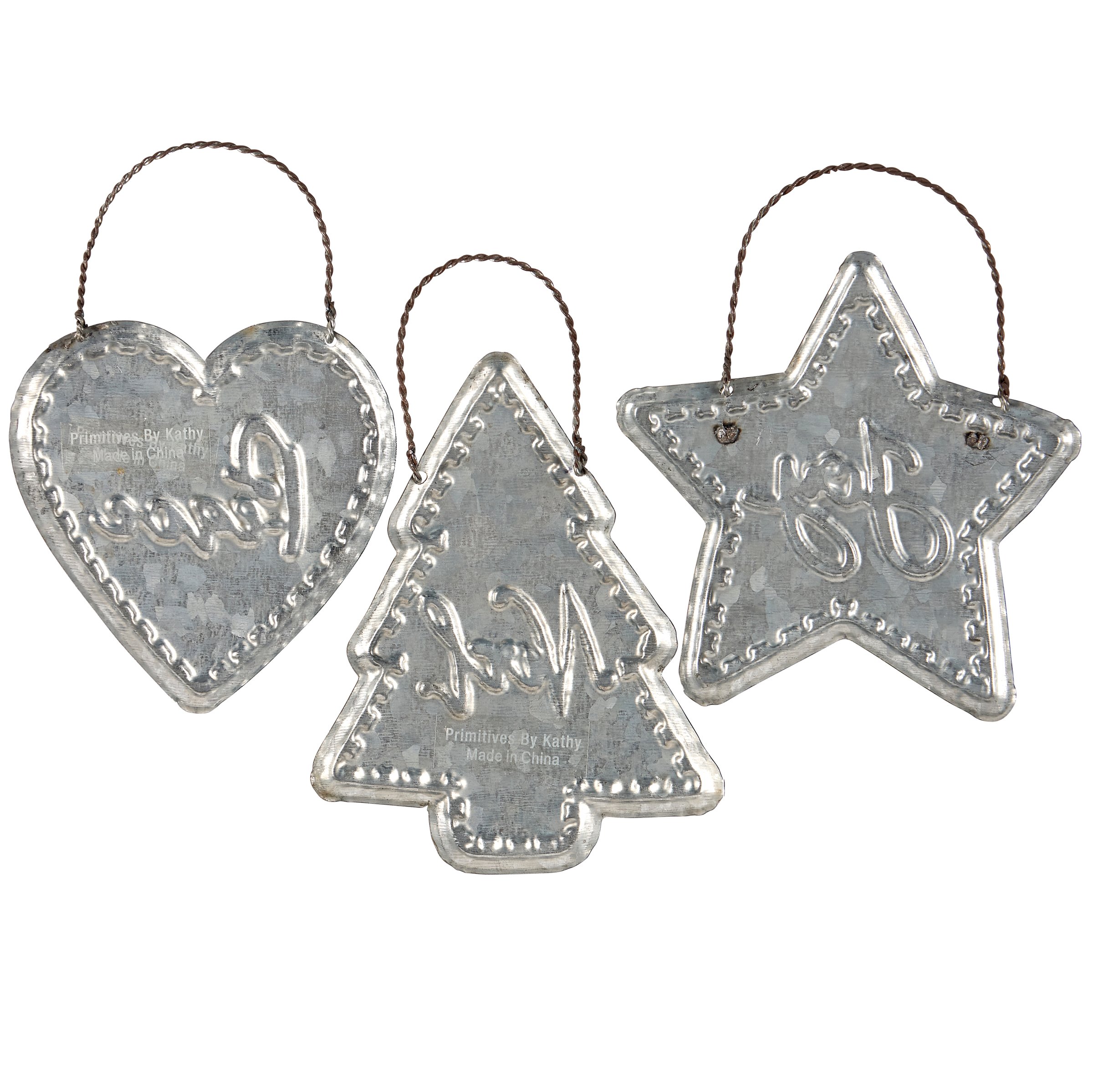 A set of 3 metal ornaments from our Christmas Collection featuring individual cutout shapes displaying Christmas plaid with seasonal sentiments and embossed details as well as a mica coating for a snowy appearance. Rustic ornaments display seasonal sentiments in a hand illustrated style including "Peace," "Noel," and "Joy." Our Peace ornament set is easy to hang for display via attached twisted wire hangers. A set of rustic Christmas home accents perfect for a Christmas tree or for seasonal decorating.