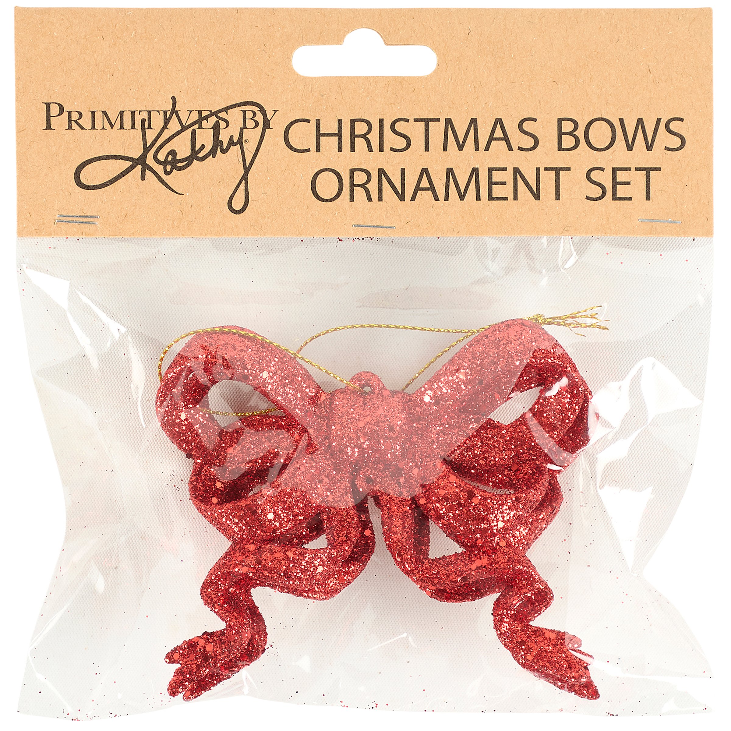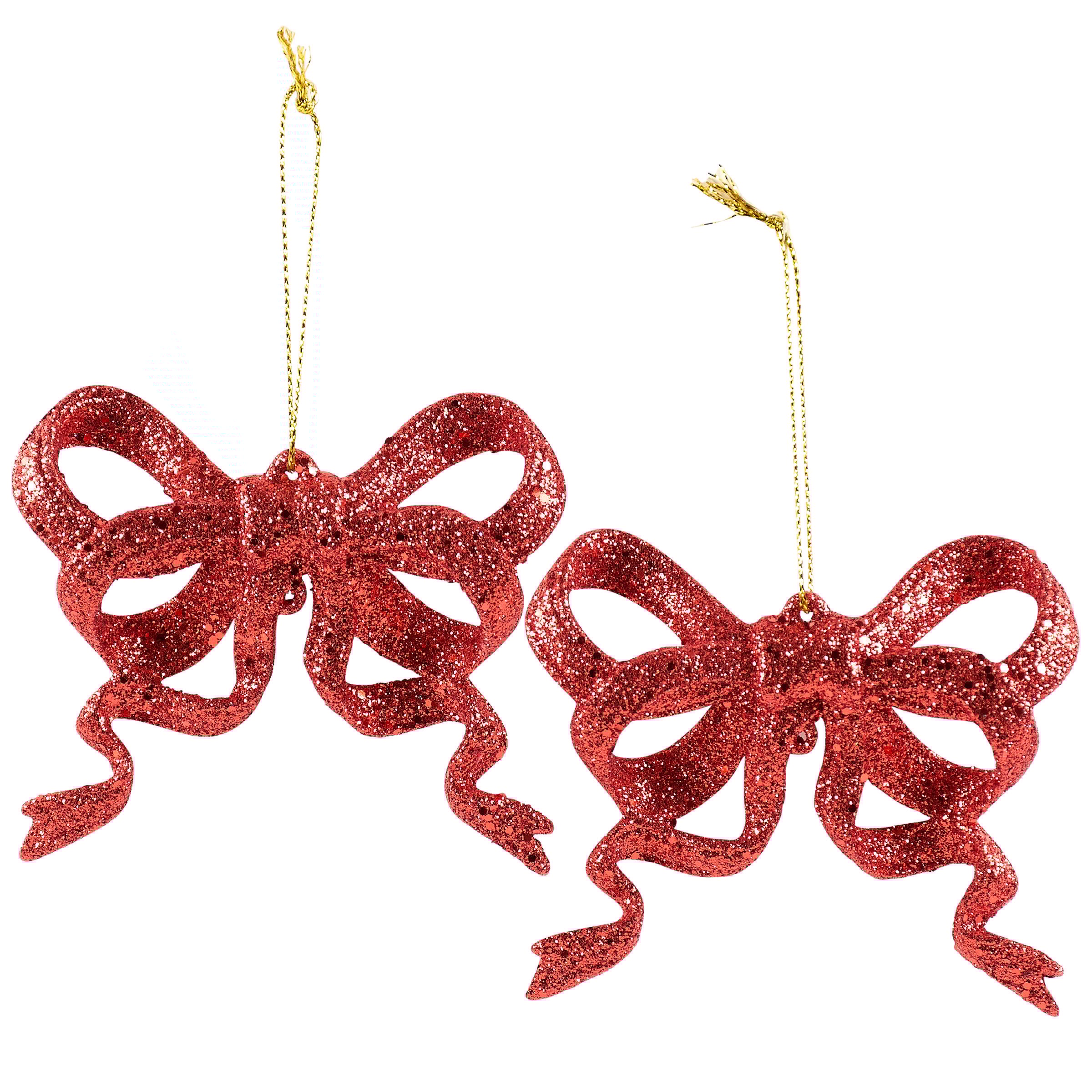 A set of 2 decorative ornaments from our Christmas Collection displaying sculpted holiday bow designs with red glitter finish for added interest. Our Red Glitter Bow ornament set is easy to hang for display via attached string hangers. Seasonal ornament set comes packaged in a polybag with header card and hole for easy store rack display. A set of stylish Christmas home accents perfect for a Christmas tree or for seasonal decorating.