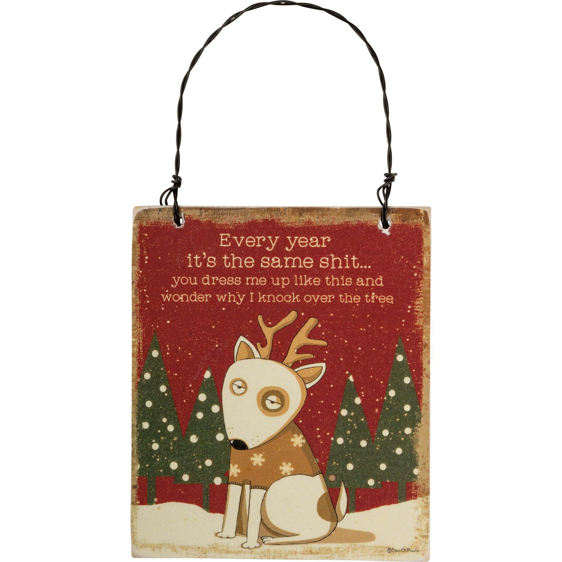 A set of five sassy dog ornaments for Christmas. Ornaments feature rustic designs and "Jingle All The Way Nobody Likes A Half-Assed Jingler," "He Sees You When You're Eating He Knows When You've Got Cookies," "Every Year It's The Same Shit... You Dress Me Up Like This And Wonder Why I Knock Over The Tree," "He's Making A List I've Eaten It Twice," and "Santa And I Talk Shit About You" sentiments. Ornaments easily hang by attached wire loops.