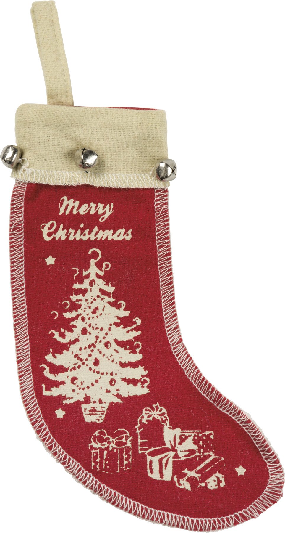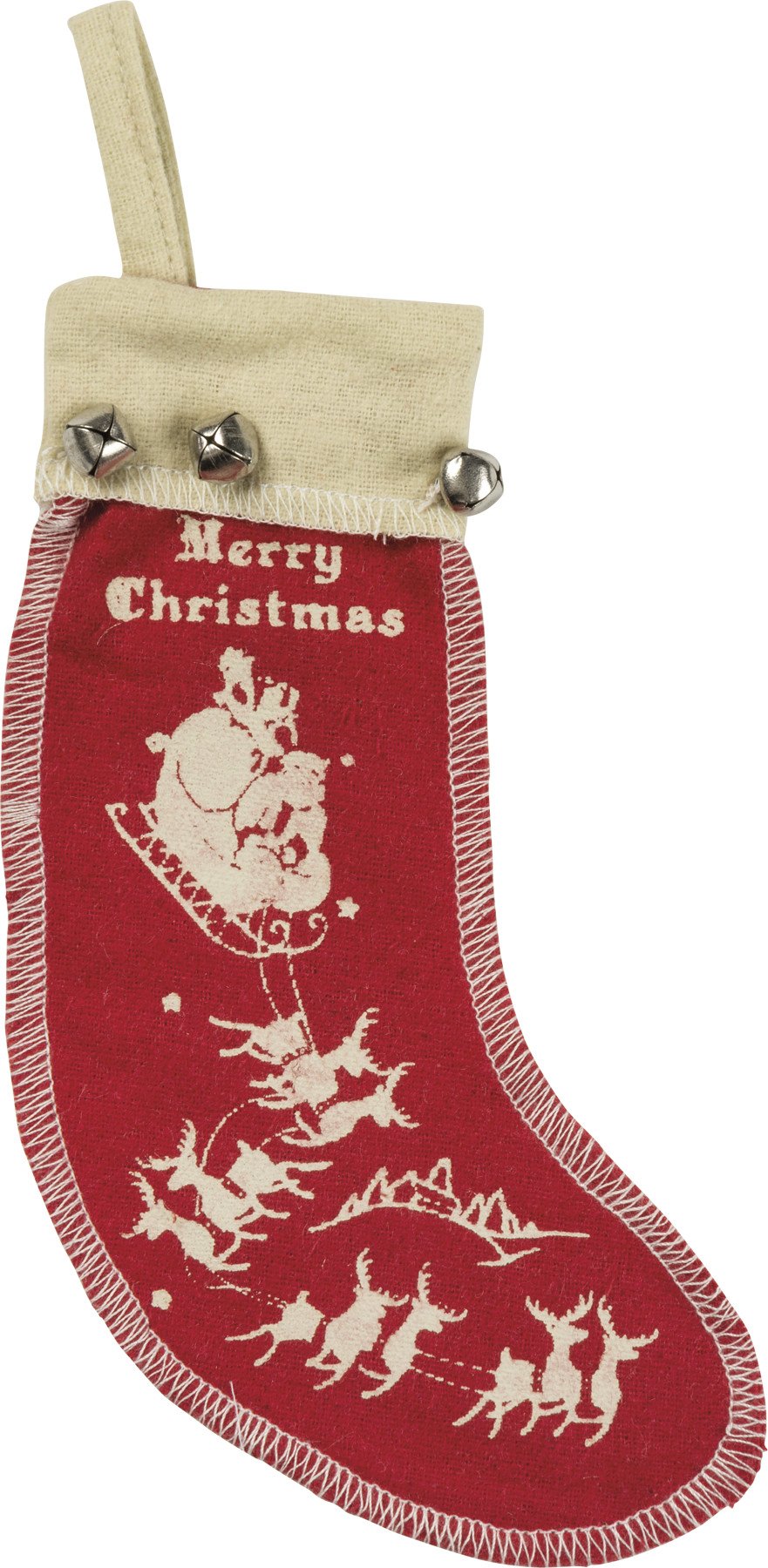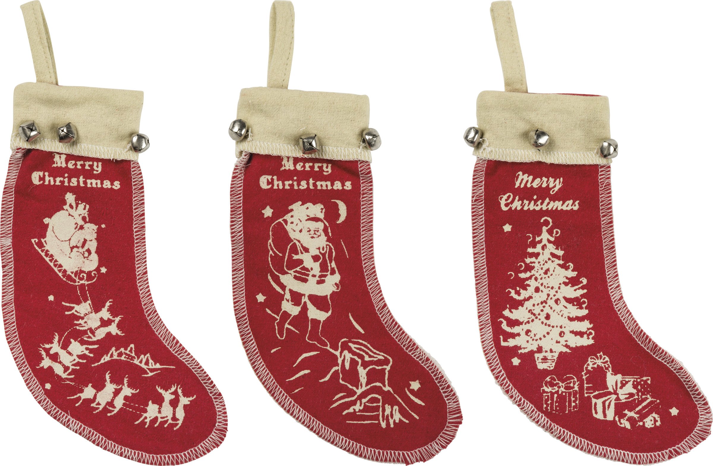 A set of three vintage felt stocking ornaments from our Christmas Collection featuring "Merry Christmas" sentiments, various Santa and Christmas designs, and bell trims. The Vintage Felt Stocking ornaments contain top fabric loops for easy hanging.