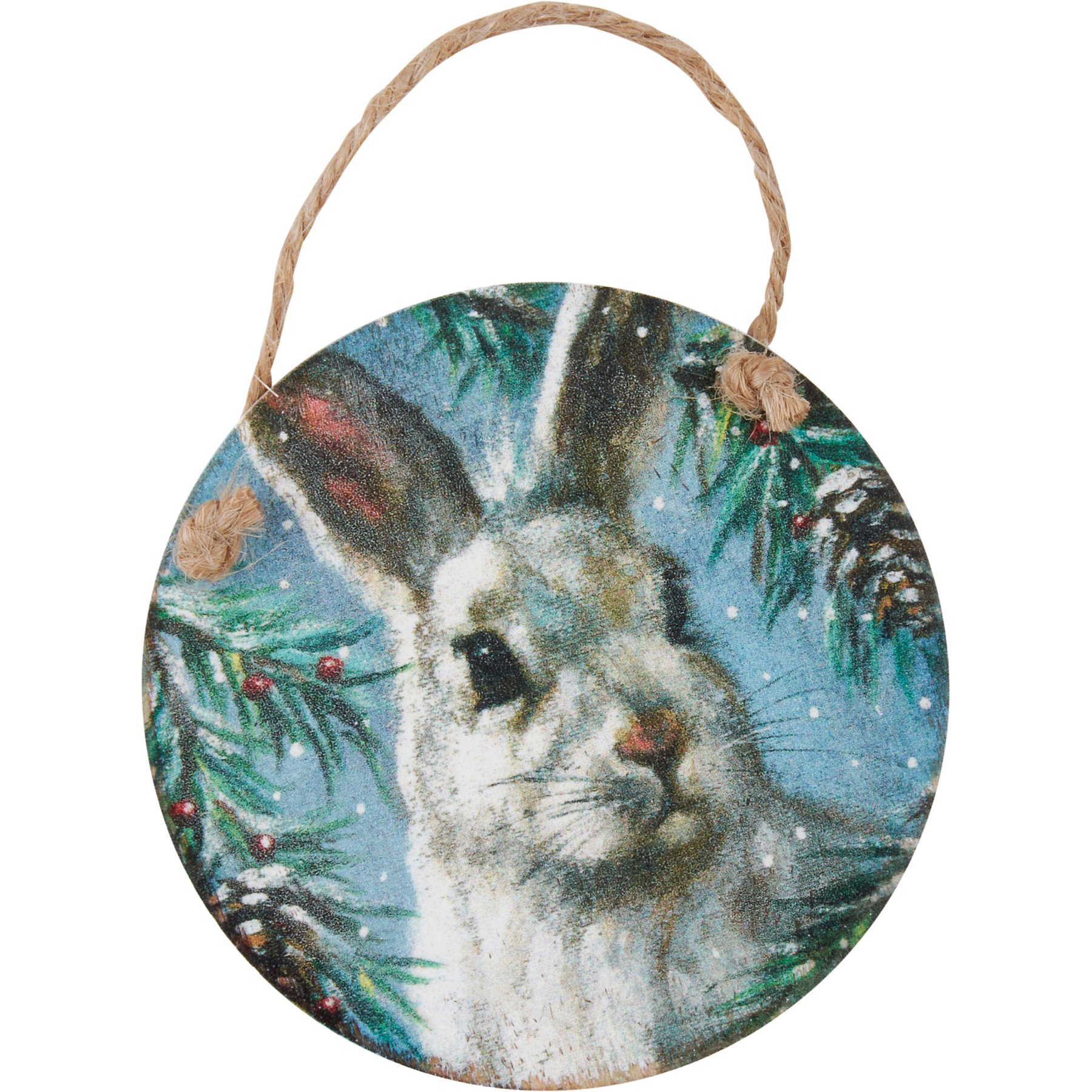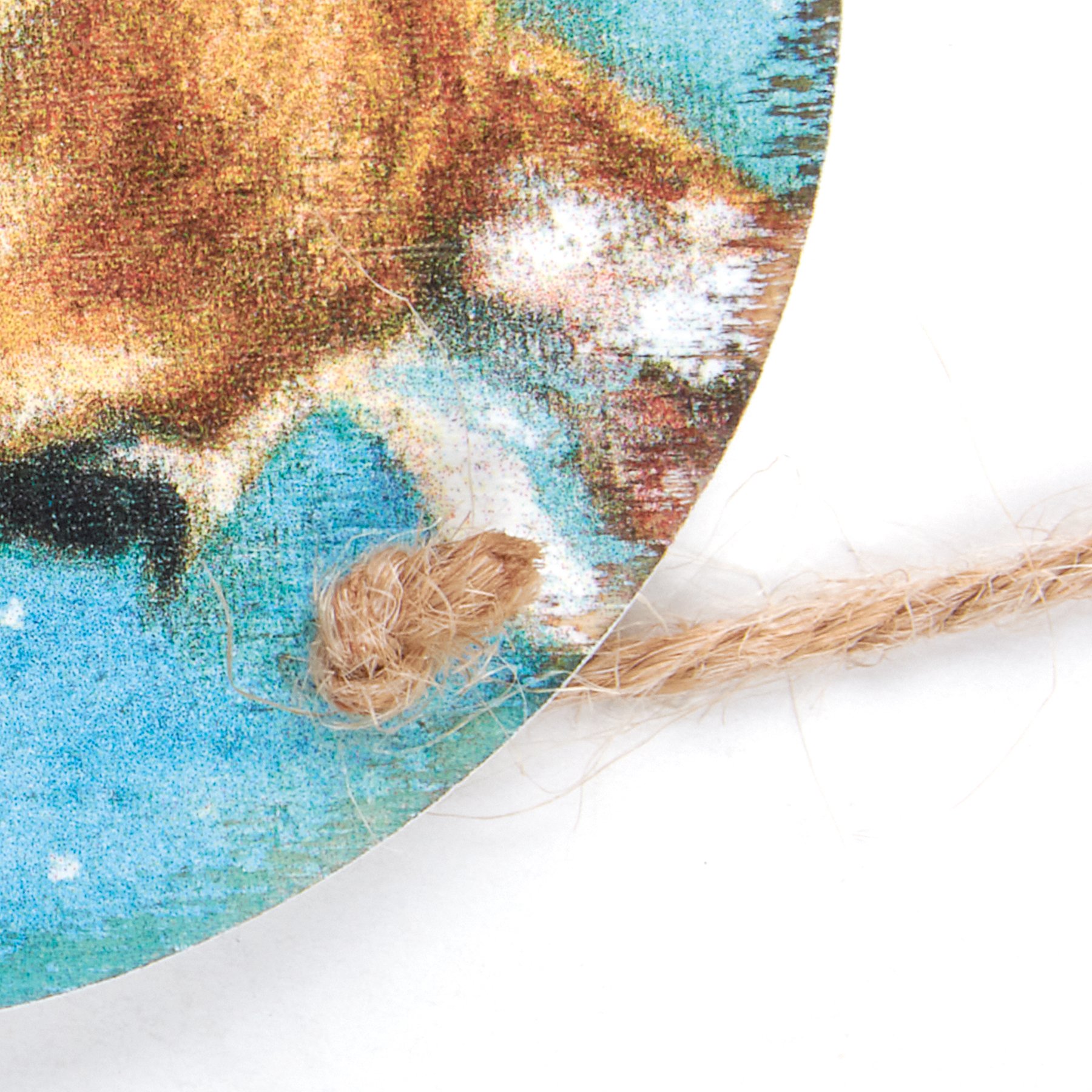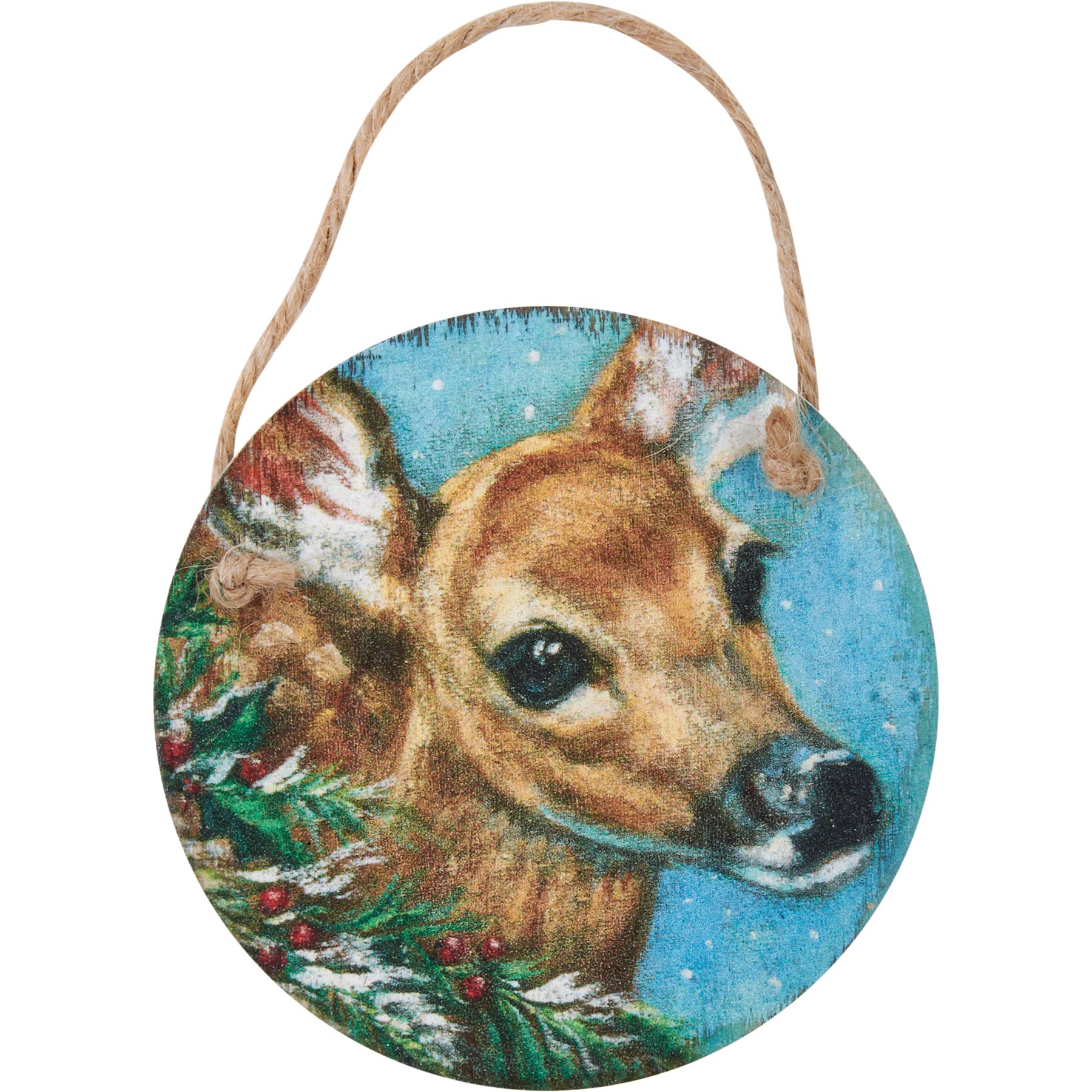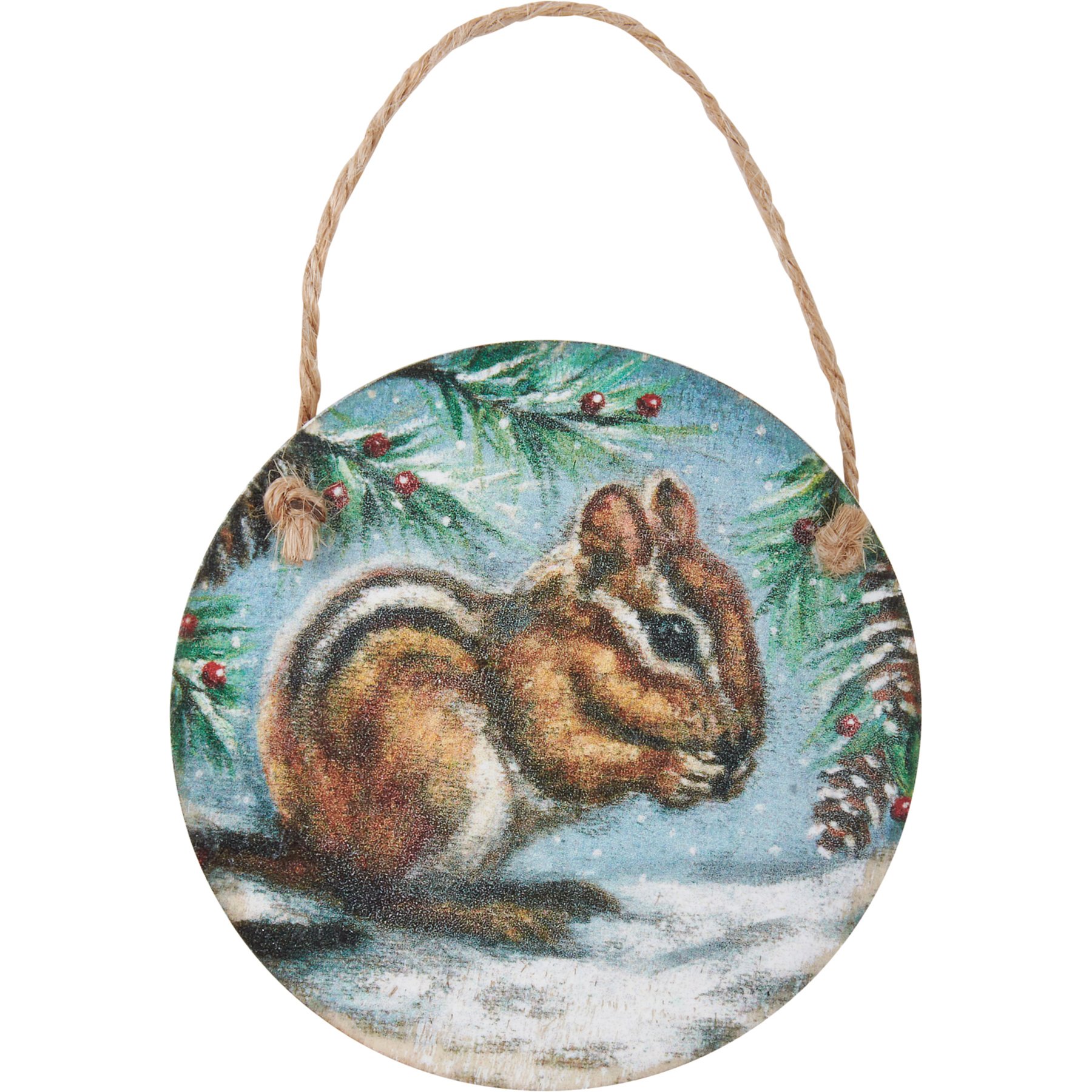 A wooden ornament set from our Christmas Collection displaying hand painted designs of a deer, bunny, and squirrel in a snowy woodland. Designs are replicated from original artwork painted onto burlap canvas, giving the art a unique depth and texture. Winter ornament set includes three separate ornaments displaying each unique design with complementing jute hangers. Packaged together in a poly bag and tied with jute and hang tag.