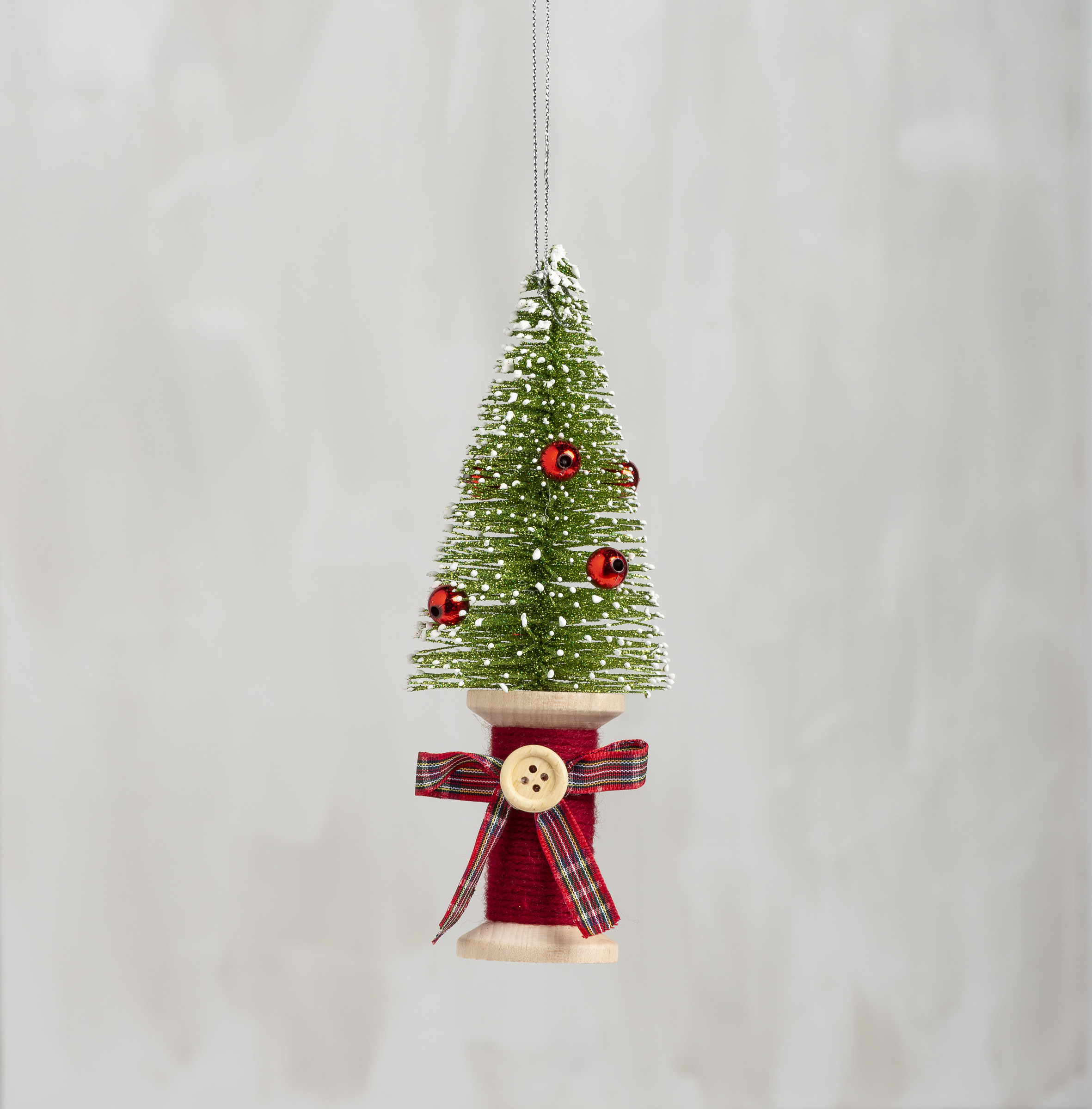 A bristled tree on a spool ornament for Christmas featuring glitter details. Contains top loop for easy hanging.