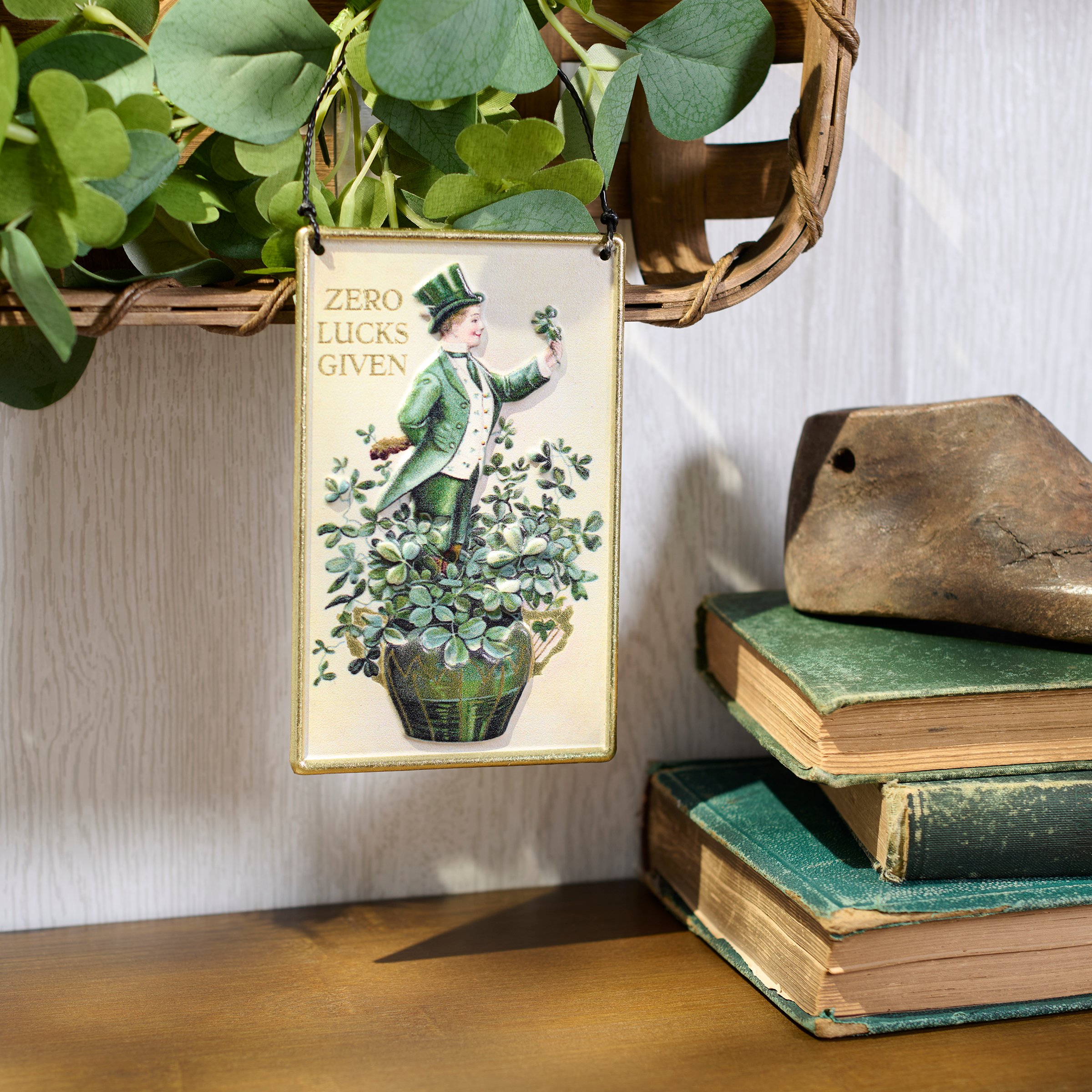 A metal ornament from our St. Patrick's Day Collection displaying vintage art of a fancy Irishman holding a shamrock while standing in a pot of clovers with a sassy seasonal sentiment that reads "Zero Lucks Given." St. Patrick's Day ornament features metallic gold foil accents and embossed details for added dimension. Our Zero Lucks Given ornament is ready to hang for display via attached twisted wire hanger. A fun St. Patrick's Day home accent that easily adds seasonal style to any home or work space.