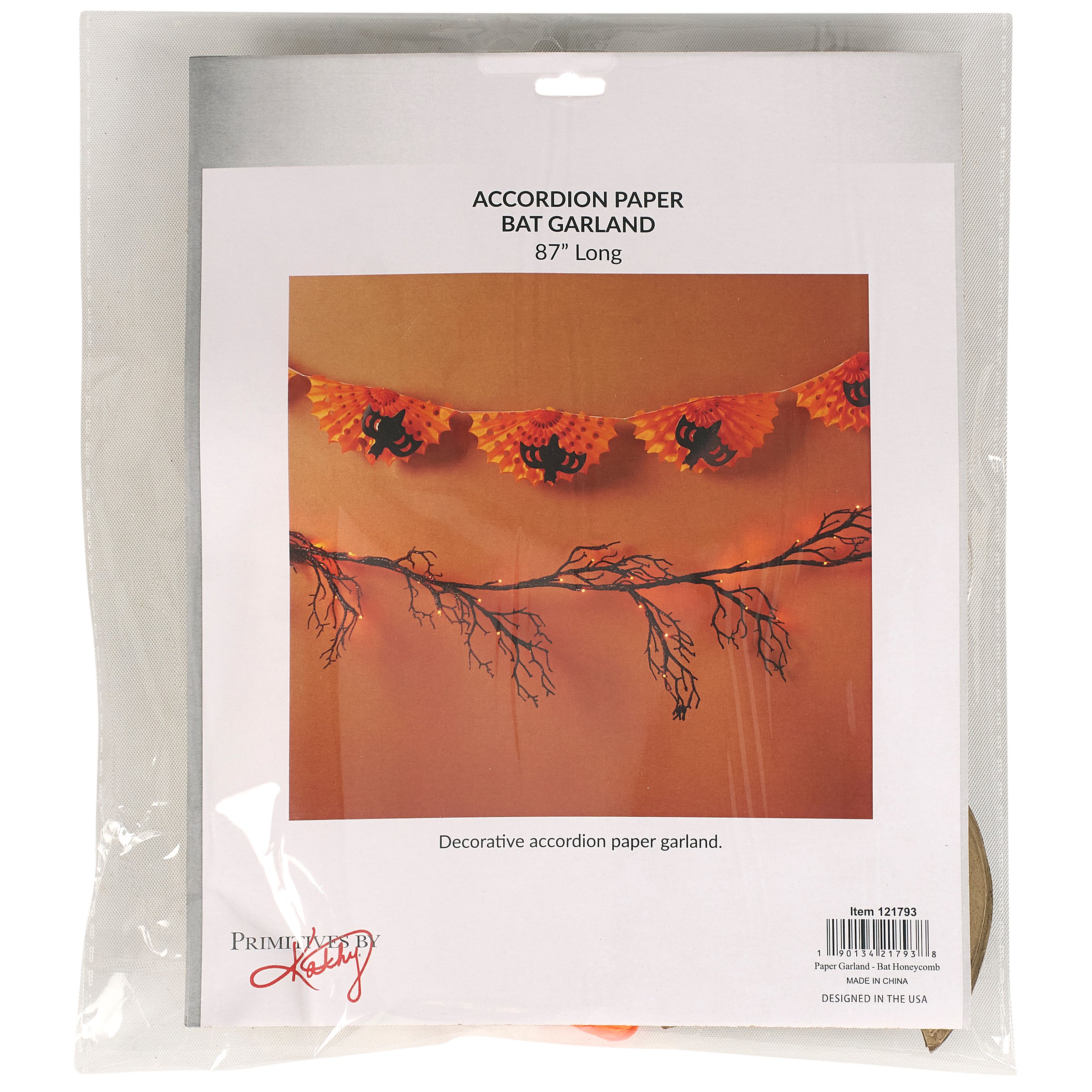 A paper garland from our Halloween Collection displaying bat designs and vintage folding paper accents. Halloween paper garland features black bat cutouts attached to orange accordion paper pieces for a fun 3D design. Our Bat Honeycomb paper garland is easy to hang for display via string loops each end. Seasonal paper garland folds up flat for compact storage and easily unfolds to display again. Paper garland is packaged flat in a polybag with card displaying full design and product information for easy store display. A fun vintage Halloween home accent perfect for seasonal decorating.