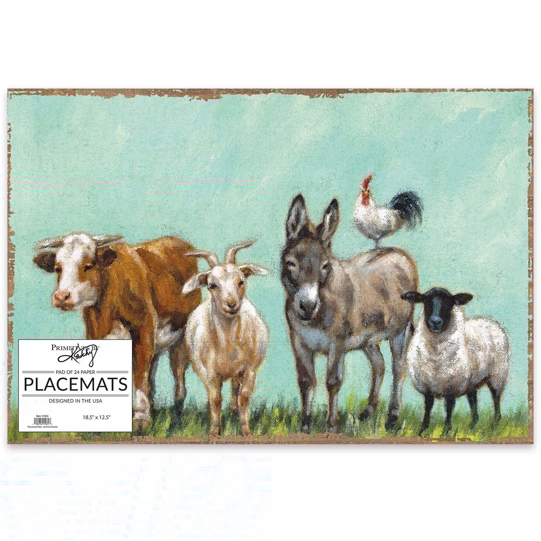 Great for customizing place settings and making clean-up a breeze, these paper placemats from our Farmhouse Collection feature a farm animal design. Design is replicated from original artwork painted onto burlap canvas, giving the art a unique depth and texture. Placemat pad includes 24 single-use, tearaway placemats. Our animal family placemat pad is shrink-wrapped for protection and storage.