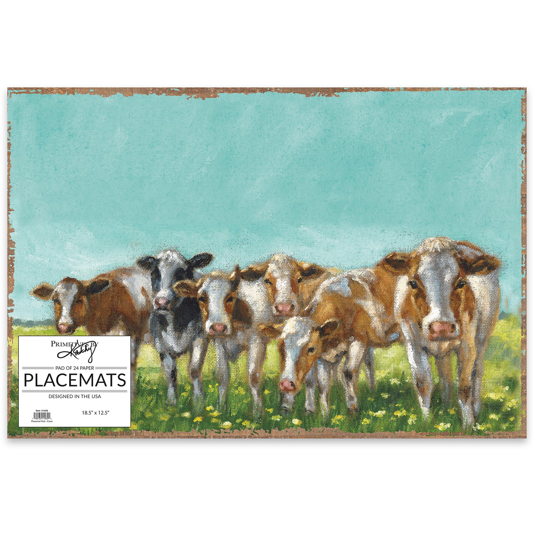 Great for customizing place settings and making clean-up a breeze, these paper placemats from our Farmhouse Collection feature a cow design. Design is replicated from original artwork painted onto burlap canvas, giving the art a unique depth and texture. Placemat pad includes 24 single-use, tearaway placemats. Our cow placemat pad is shrink-wrapped for protection and storage.