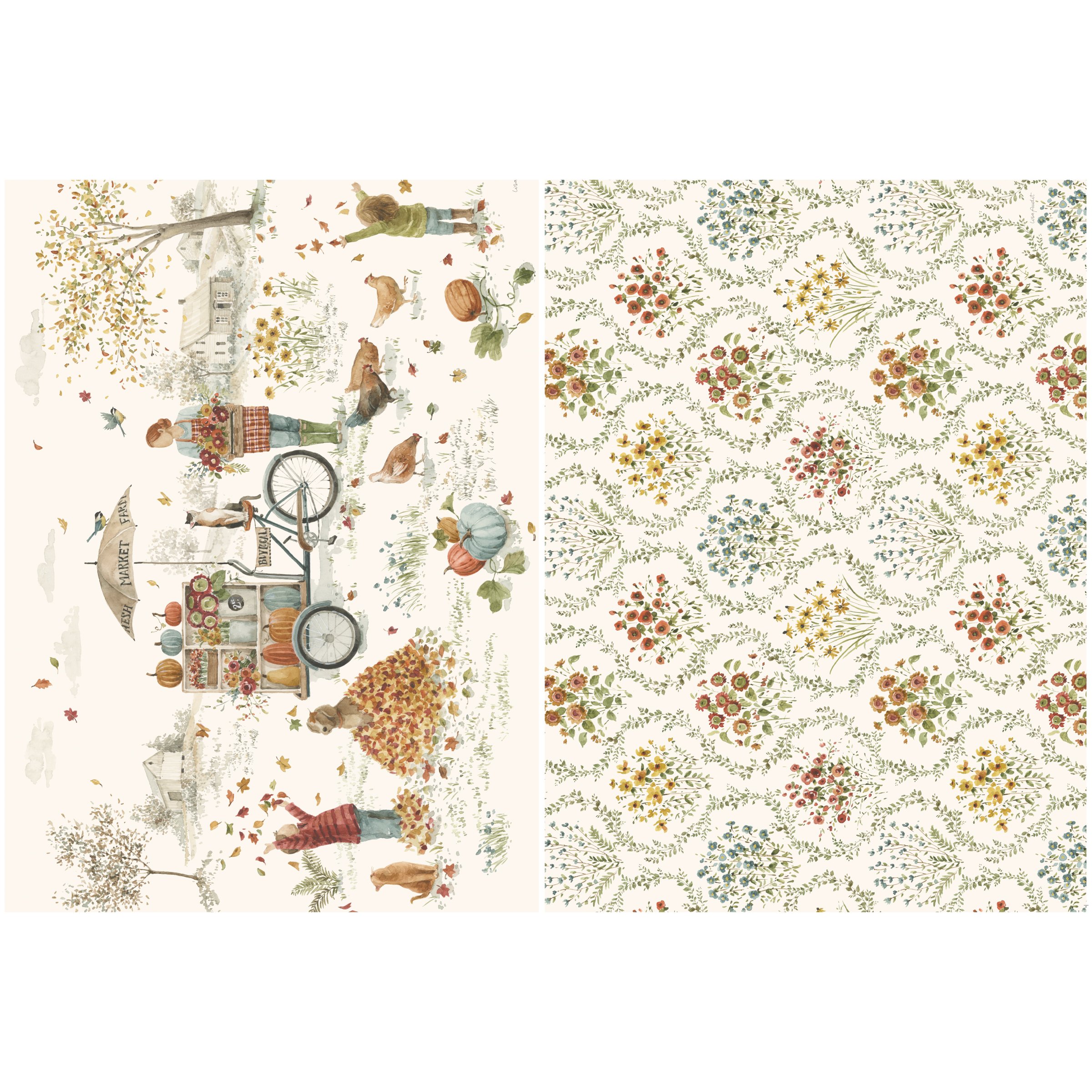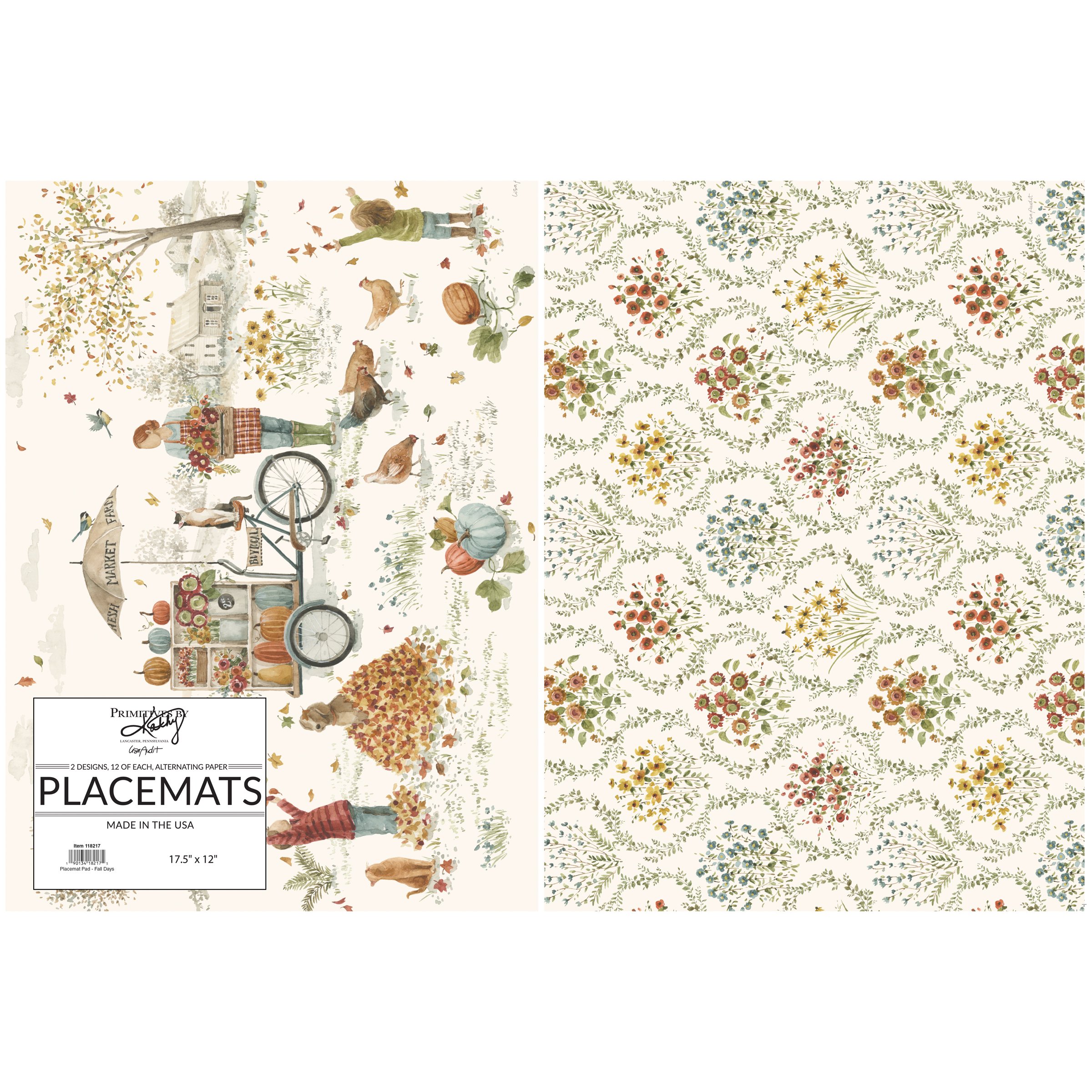 Great for customizing place settings and making clean-up a breeze, these paper placemat pads from our Fall & Harvest Collection feature 2 hand painted designs inspired by the fall season. Designs include a scene of people enjoying fall activities as well as a fall flower inspired pattern. Both designs are replicated from original artwork hand painted in a delicate watercolor style. Our Fall Days placemat pads are shrink-wrapped for protection as well as easy storage and shelf display. Each pack includes 24 single-use, tear-off placemats with 12 of each design. A fall-themed tabletop accessory perfect for customizing seasonal place settings.