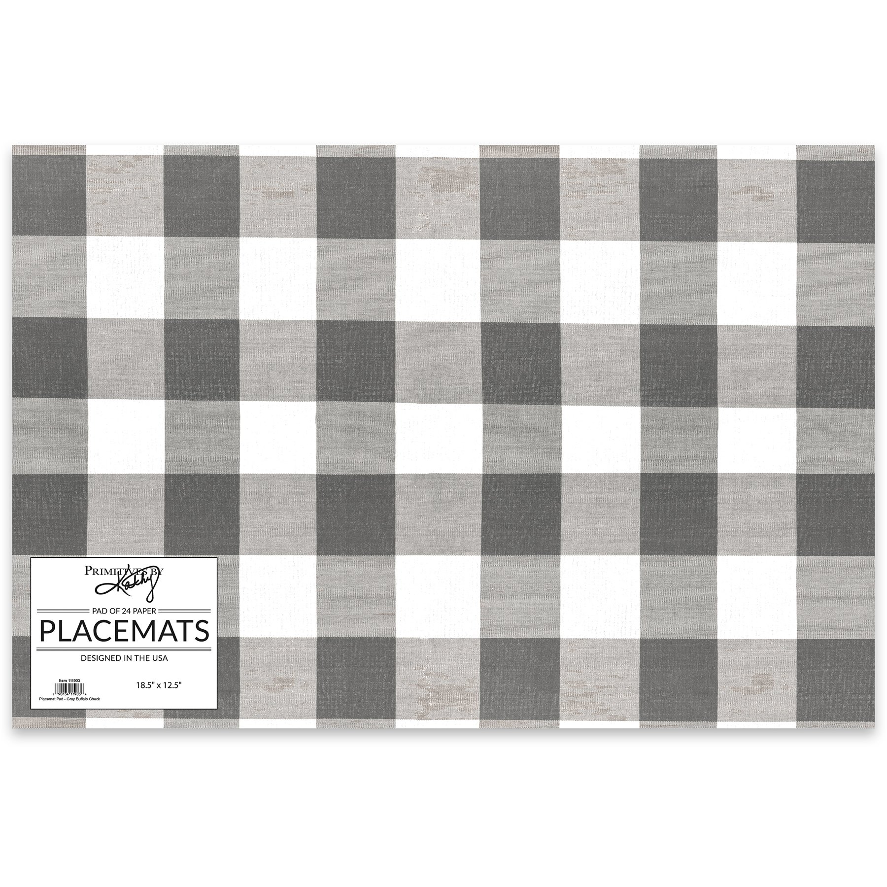 Great for customizing place settings and making clean-up a breeze, these paper placemats from our Farmhouse Collection feature a gray and white buffalo check design. Placemat pad includes 24 single-use, tearaway placemats. Our gray and white buffalo check placemat pad is shrink-wrapped for protection and storage.