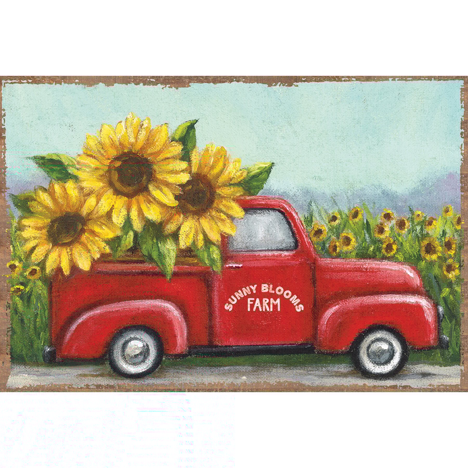 Great for customizing settings and making clean-up a breeze, these paper placemats feature two different truck designs; one hauling oversized sunflowers and the other hauling an oversized beehive. Designs are replicated from original artwork painted onto burlap canvas, giving the art a unique depth and texture. Placemat pad includes 24 single-use, tearaway placemats. Our Trucks placemat pad is shrink-wrapped for protection and storage. Made in the USA.