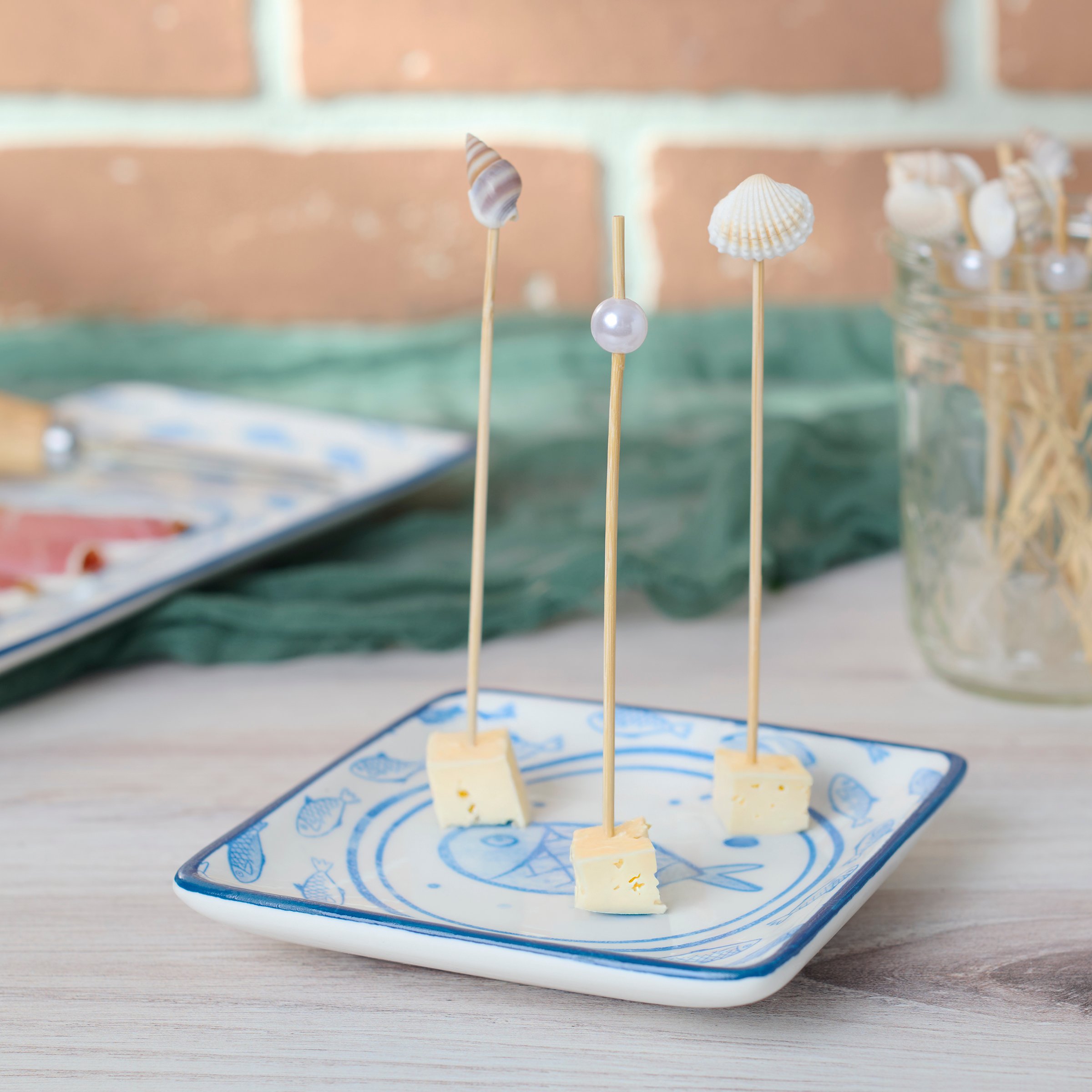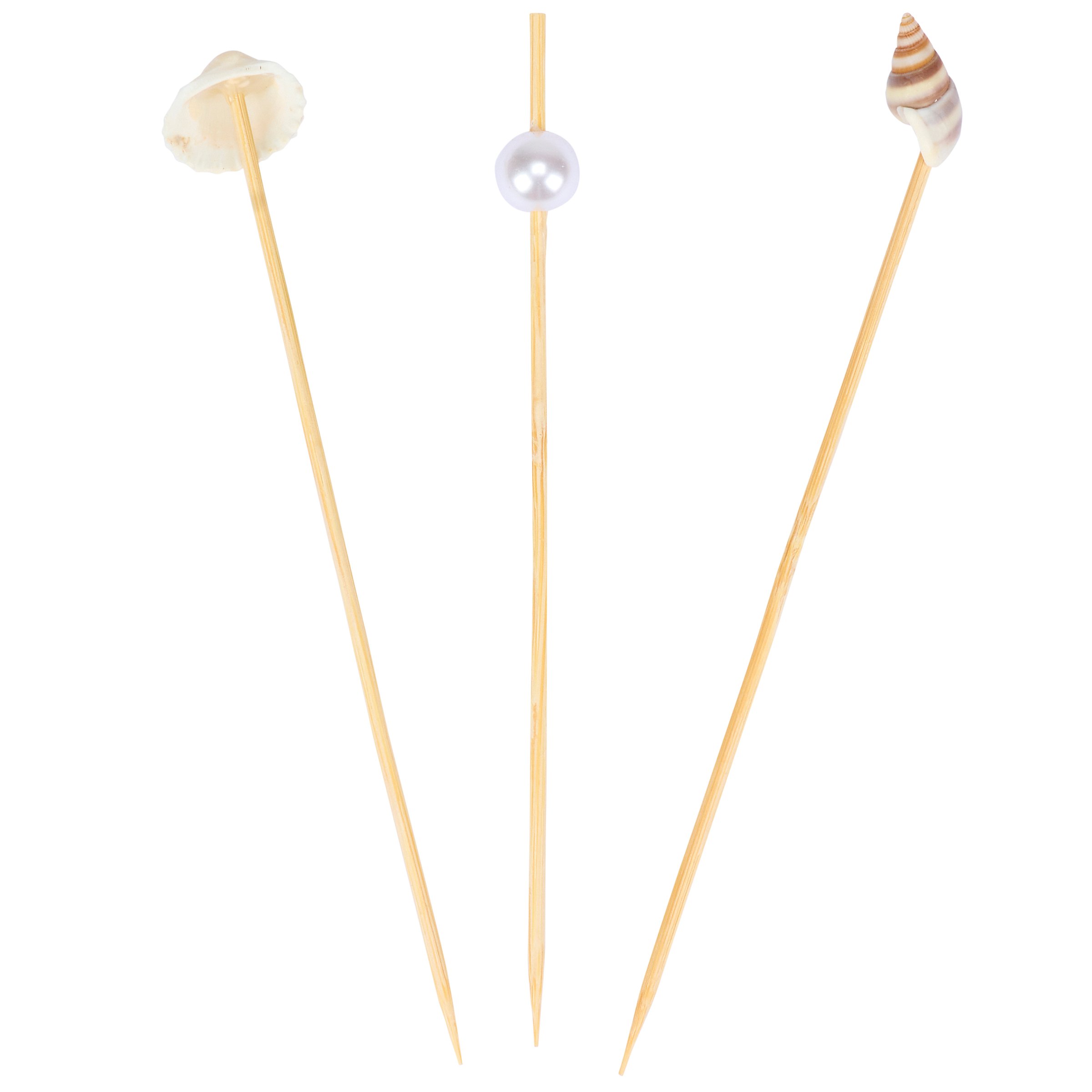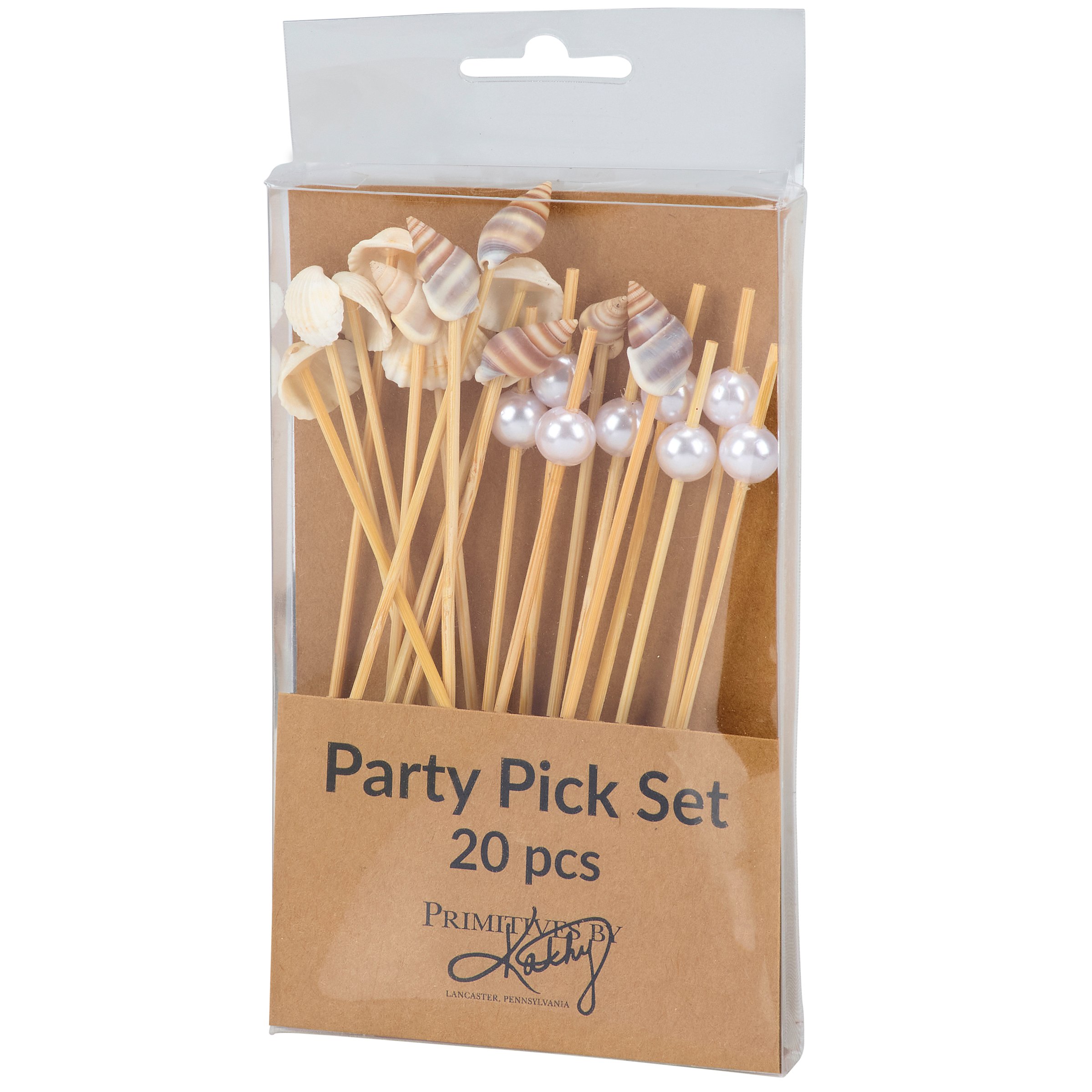 A set of party picks from our Beach Collection featuring 20 long bamboo picks with a mix of faux seashells and oyster pearls attached to the tops that add beach themed charm to food displays. Our Beach party pick set comes packaged in an acrylic box to easily see designs with a hole for hanging on store racks. A set of fun ocean inspired party accessories perfect for beach themed tablescapes.