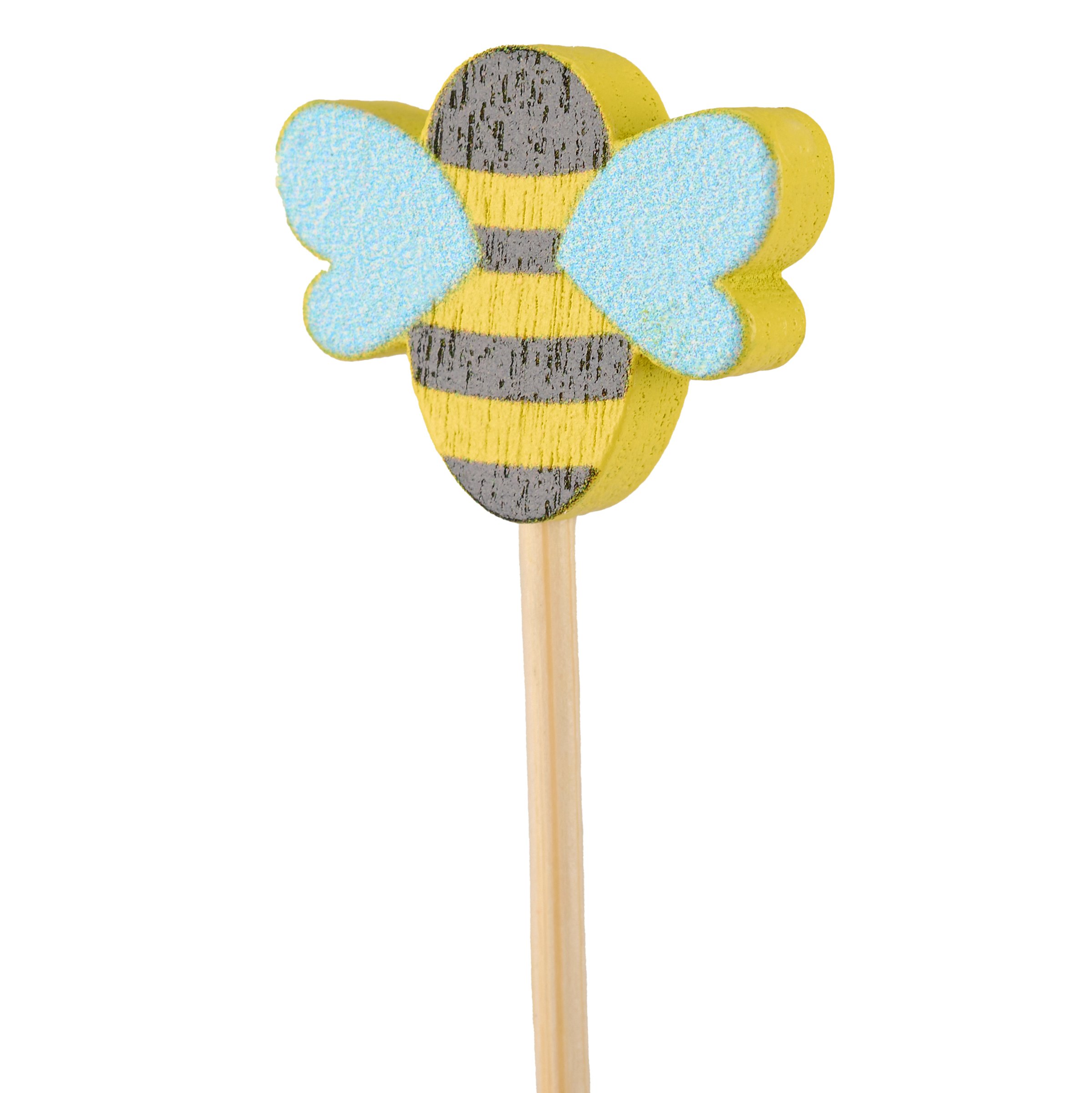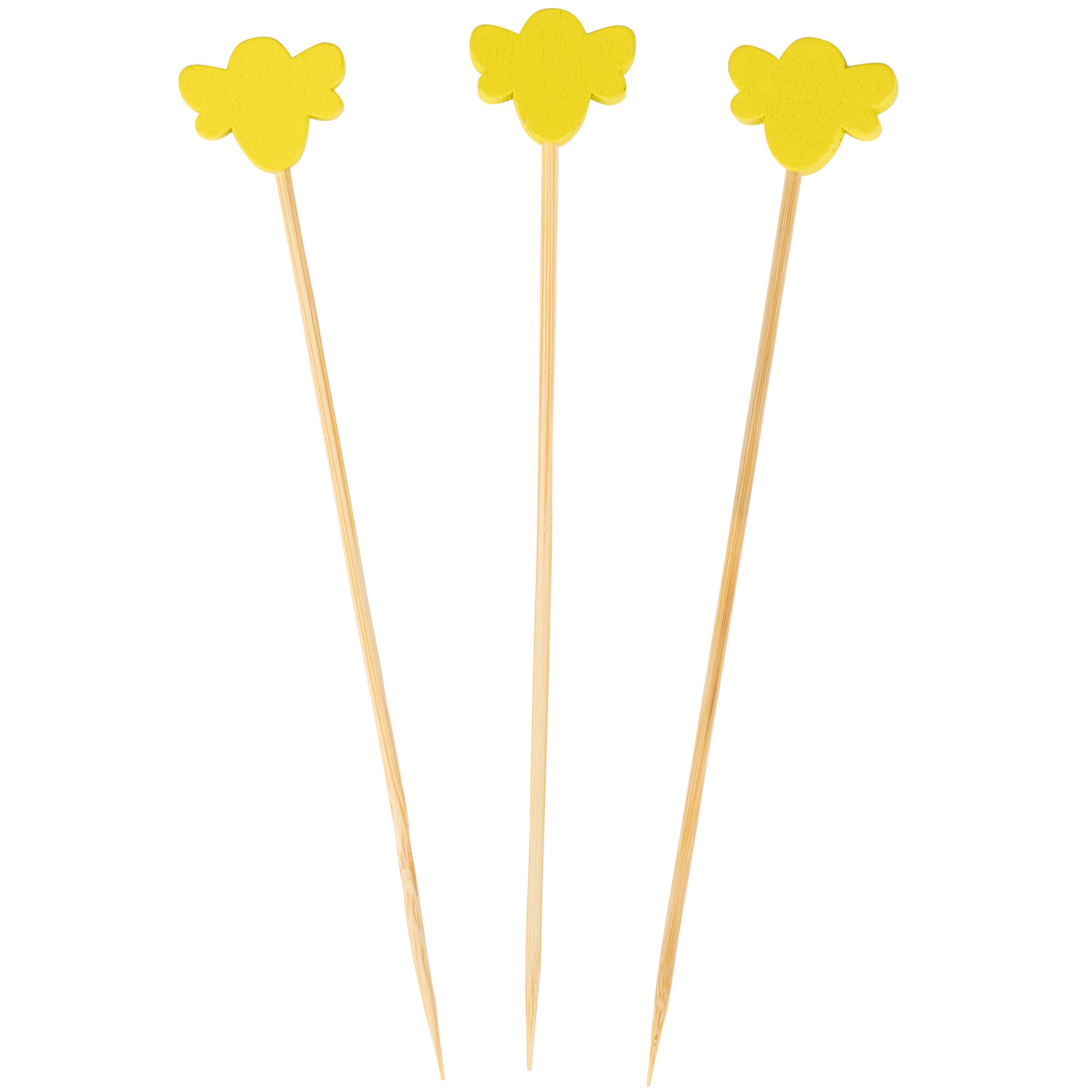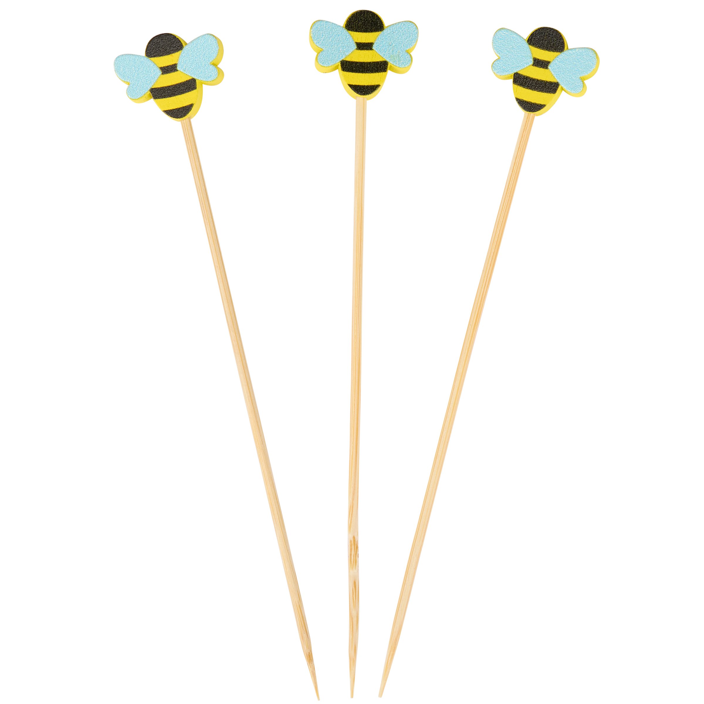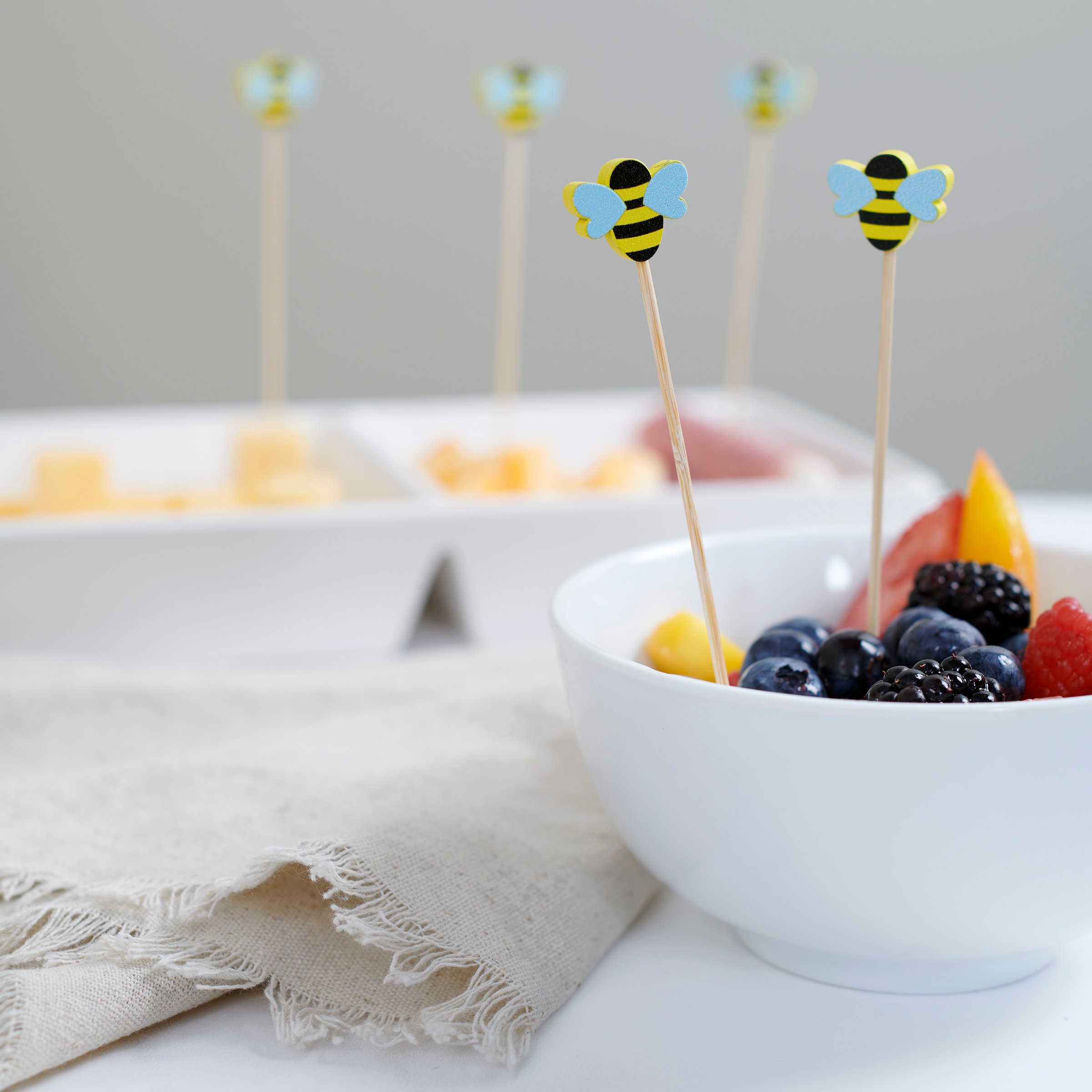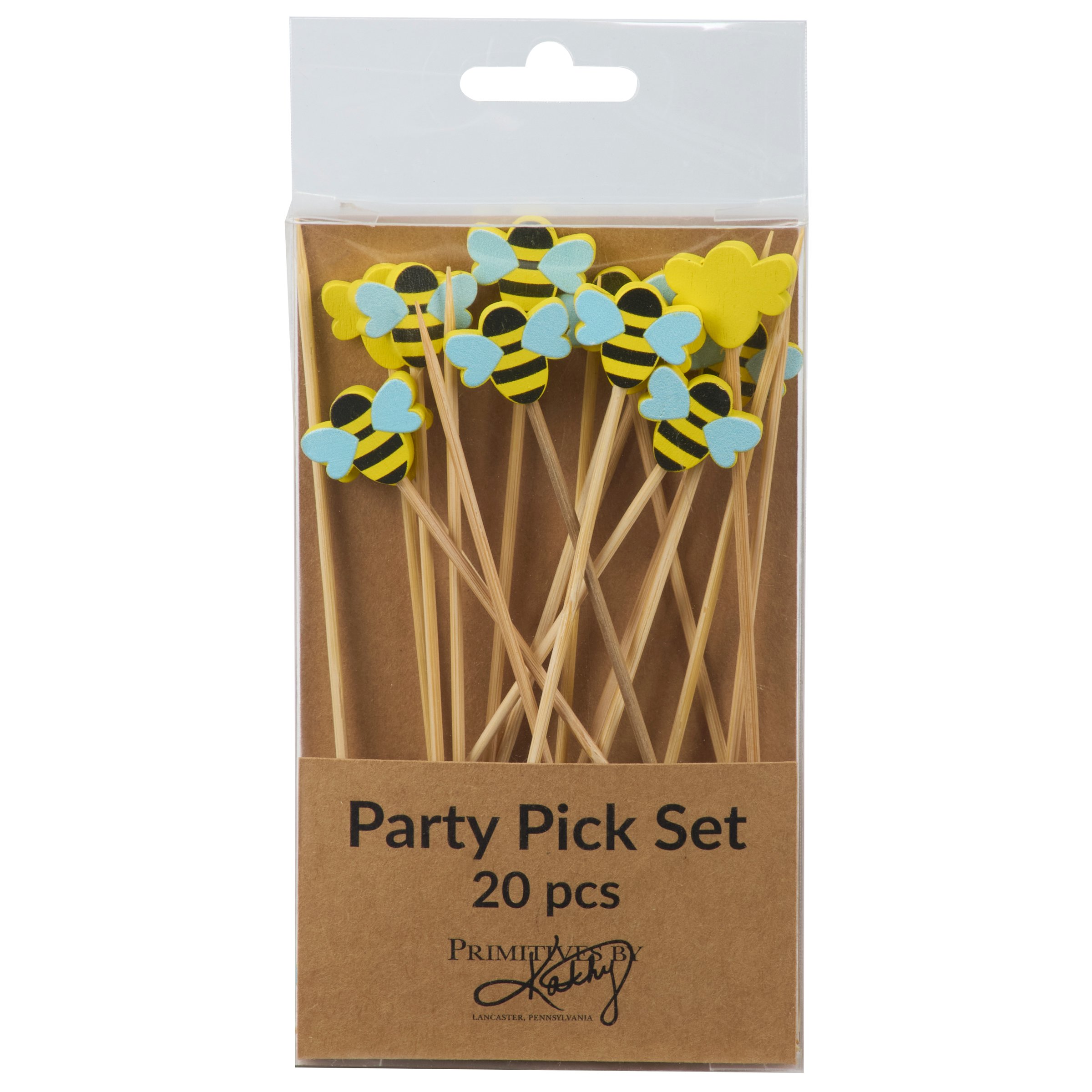 A set of party picks from our Garden Collection featuring 20 long bamboo picks with bee shaped wood pieces attached to the top displaying painted details that add bee-themed charm to food displays. Our Bees party pick set comes packaged in an acrylic box to easily see designs with a hole for hanging on store racks. A set of fun bee-themed party accessories perfect for garden inspired tablescapes.