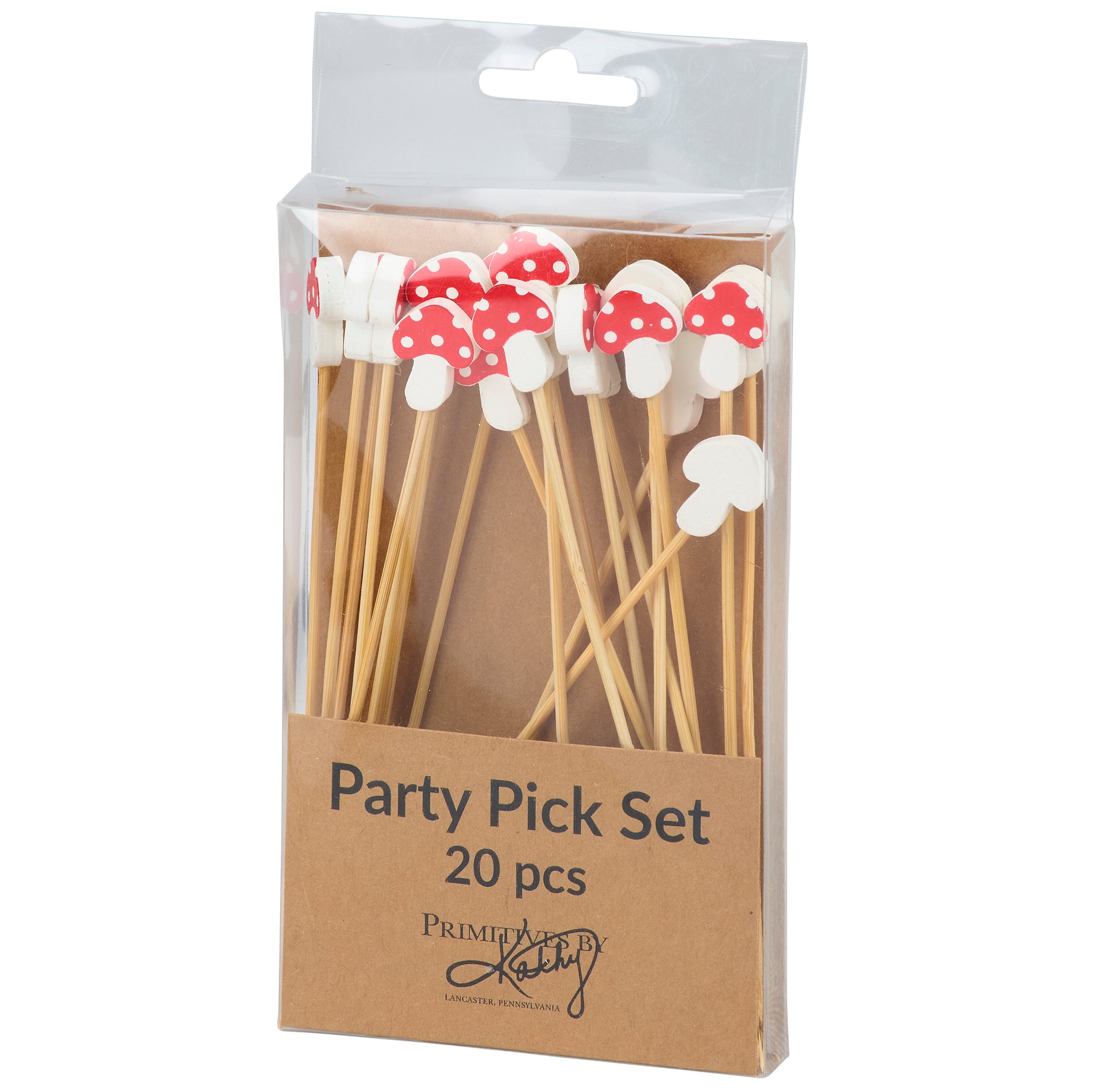 A set of party picks from our Cottagecore Collection featuring 20 long bamboo picks with toadstool mushroom shaped wood pieces attached to the top displaying painted details that add garden themed charm to food displays. Our Mushroom party pick set comes packaged in an acrylic box to easily see designs with a hole for hanging on store racks. A set of fun mushroom inspired party accessories perfect for garden themed tablescapes.