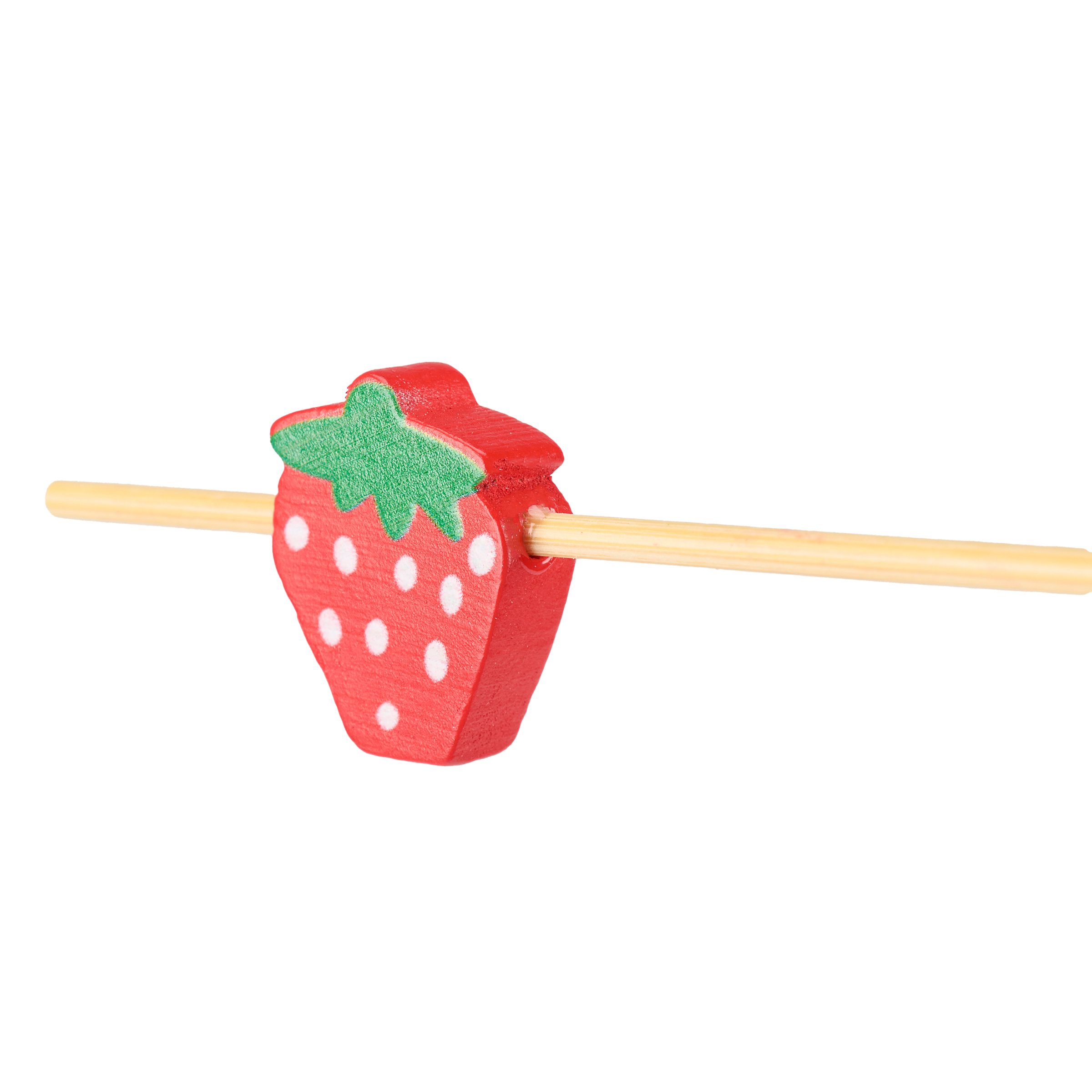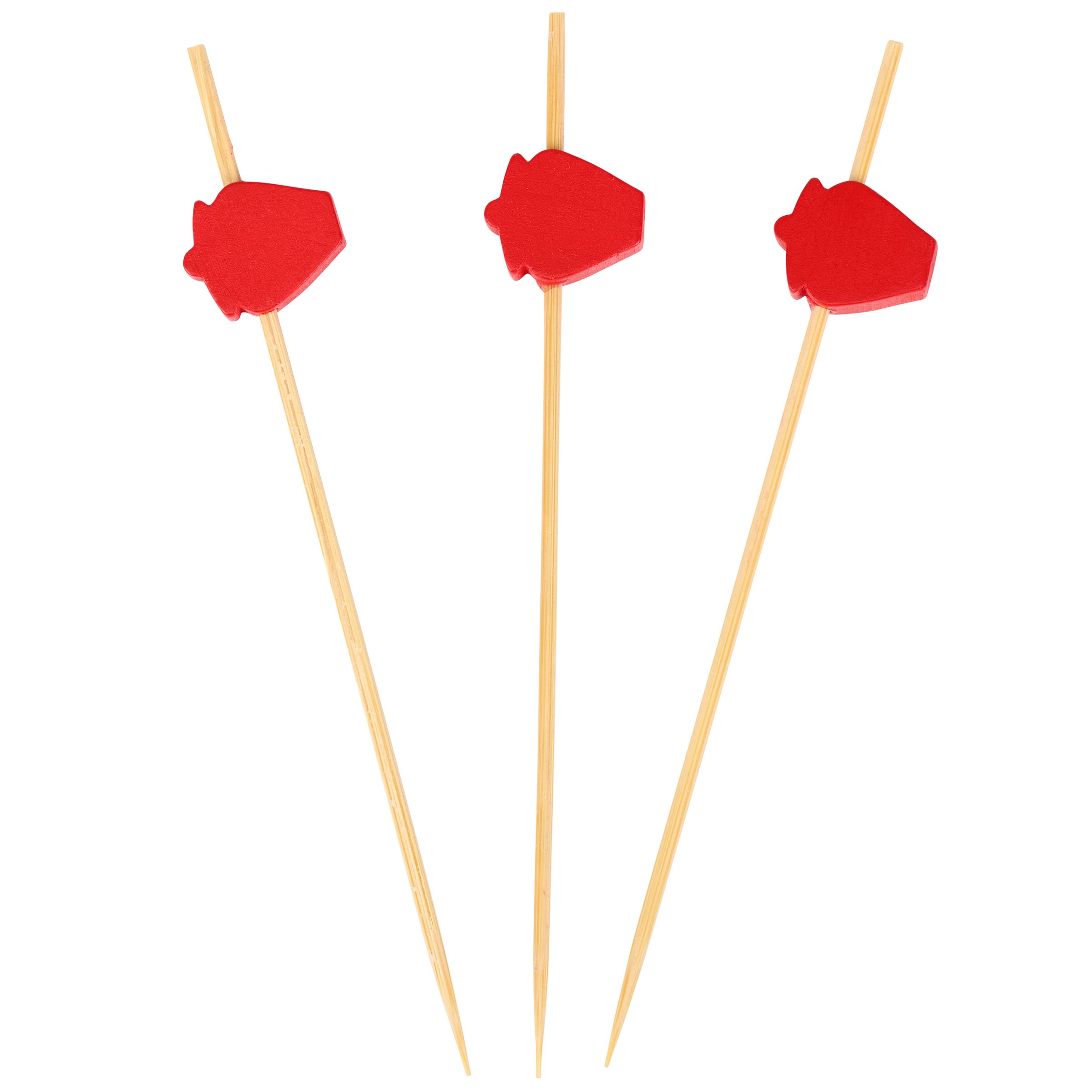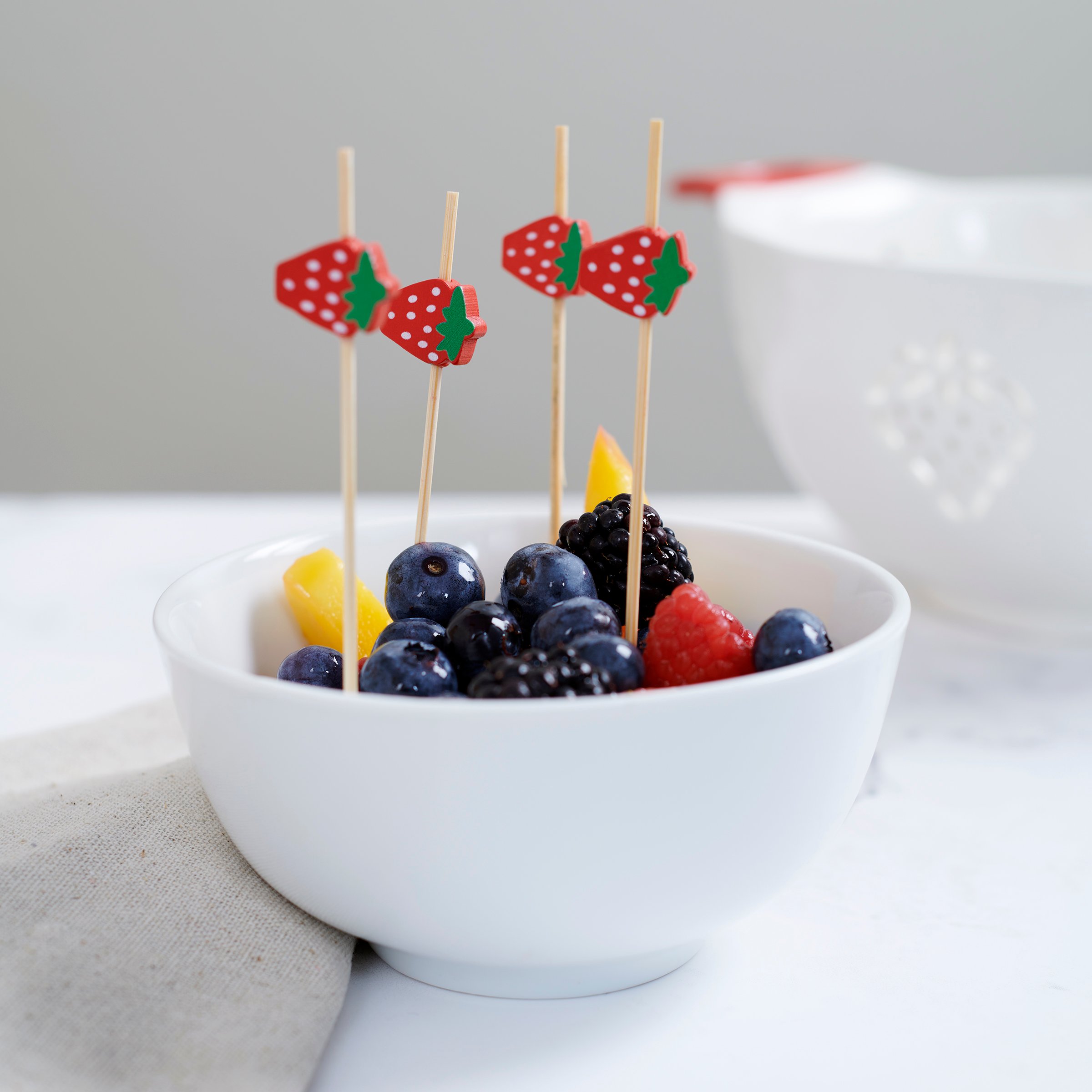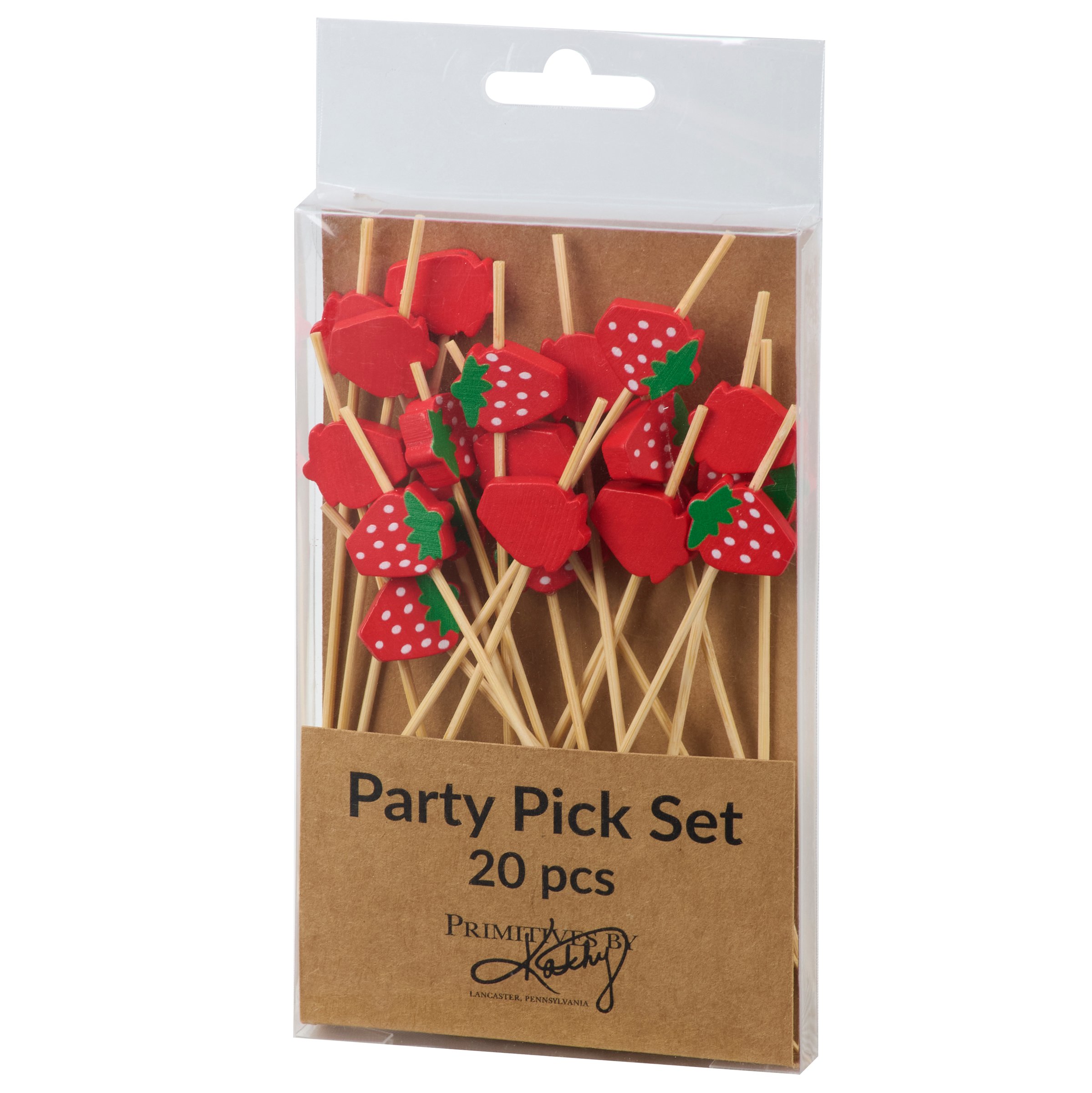 A set of party picks from our Garden Collection featuring 20 long bamboo picks with strawberry shaped wood pieces attached displaying painted details that add garden-themed charm to food displays. Our Strawberries party pick set comes packaged in an acrylic box to easily see designs with a hole for hanging on store racks. A set of fun strawberry-themed party accessories perfect for garden inspired tablescapes.