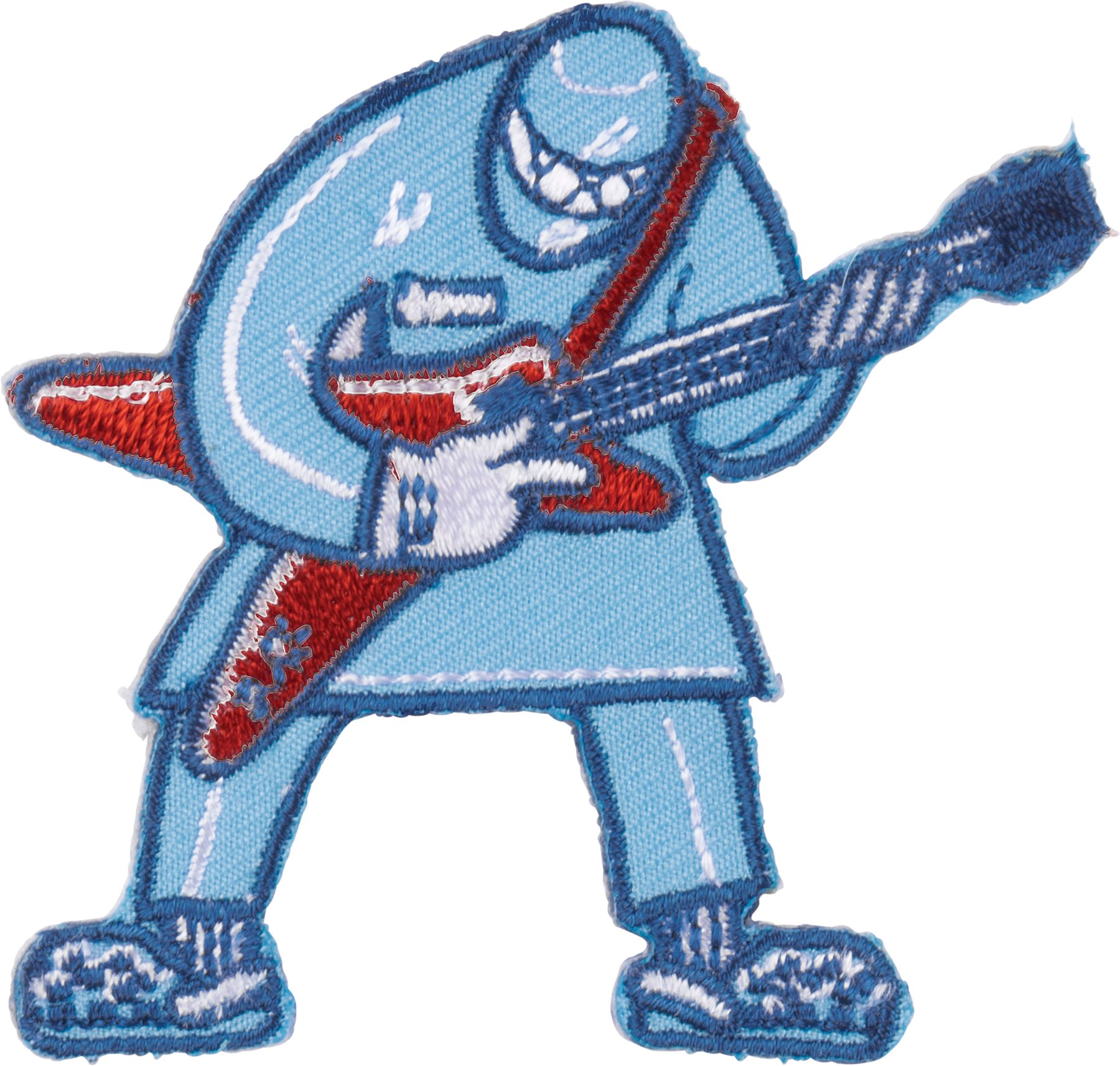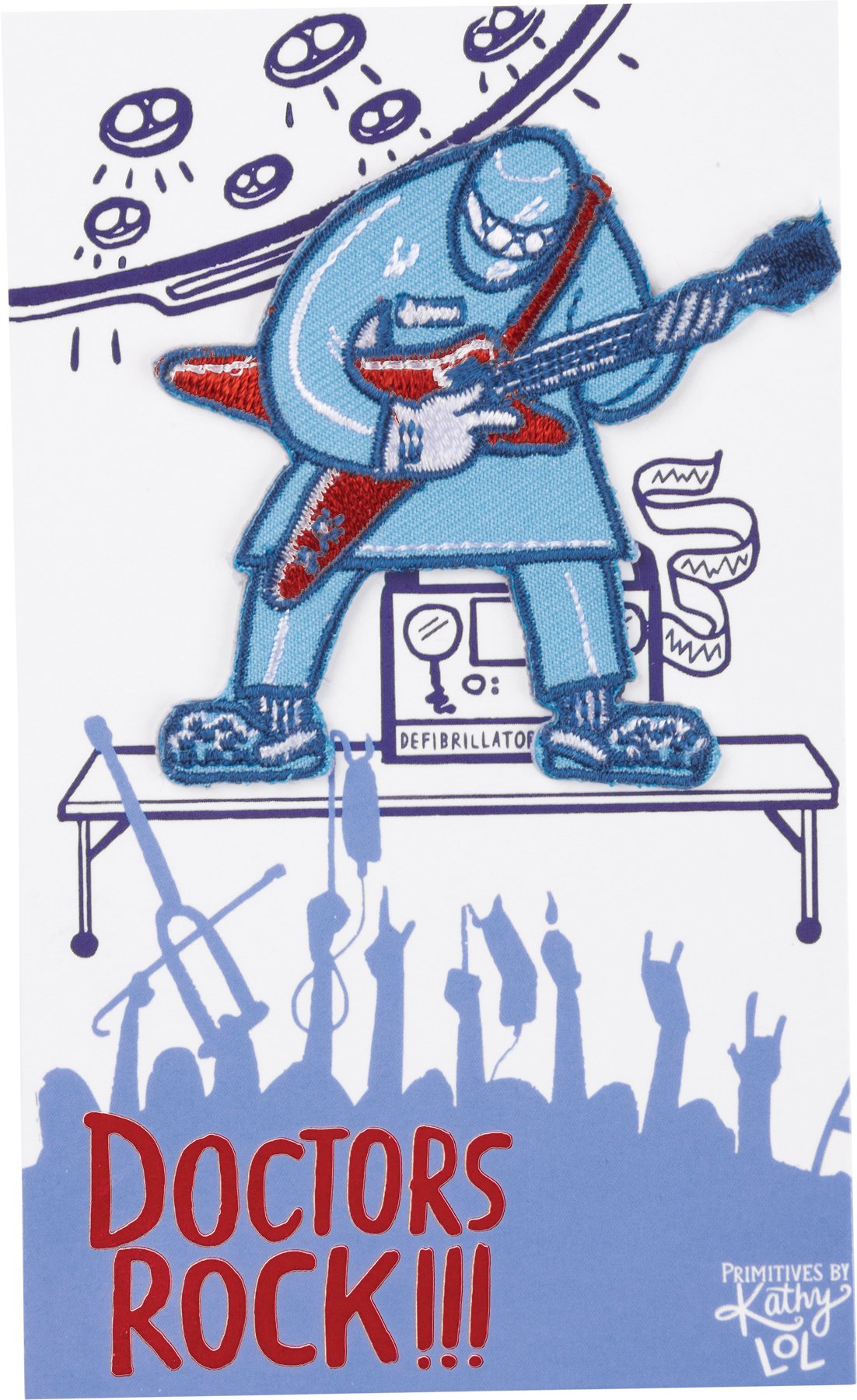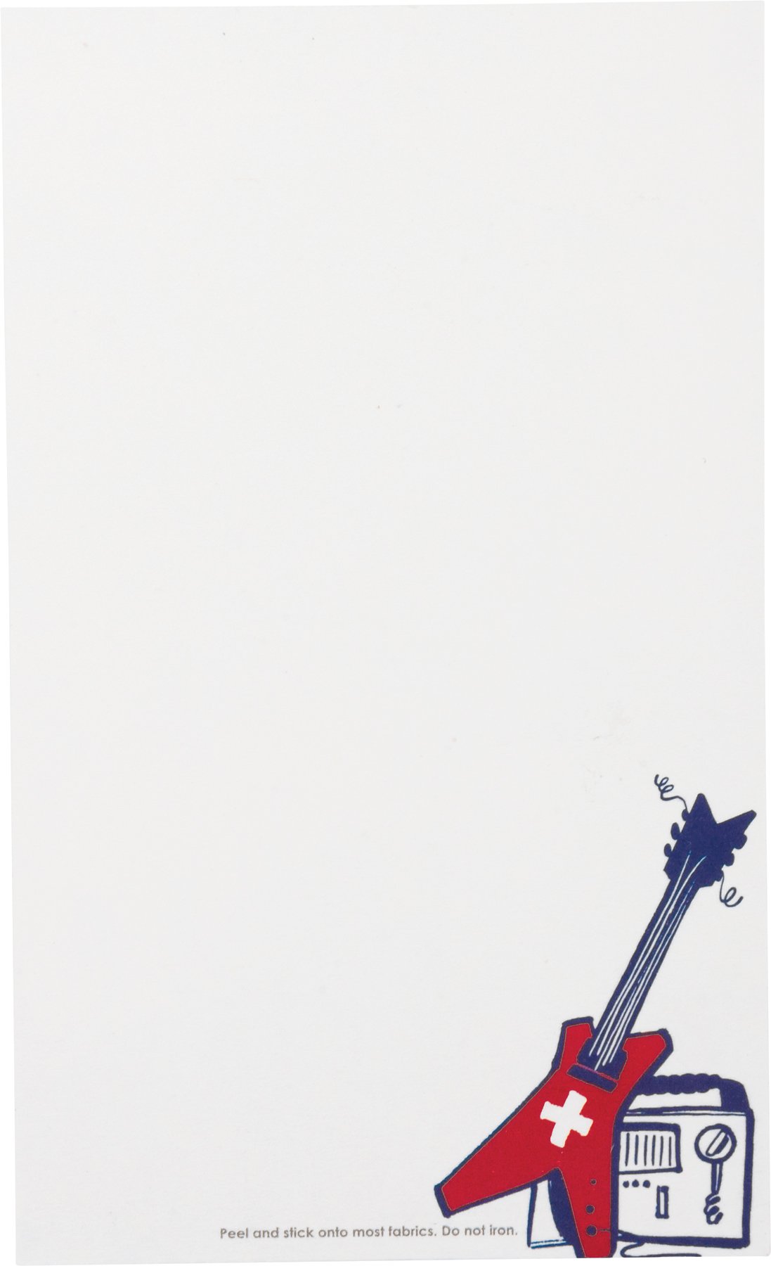 A nylon threaded doctor playing an electric guitar patch with adhesive backing. Packaged on a double-sided, thoughtfully-coordinated "Doctors Rock" card and a blank space on the reverse side for a handwritten note. Patch adheres to most fabric.
