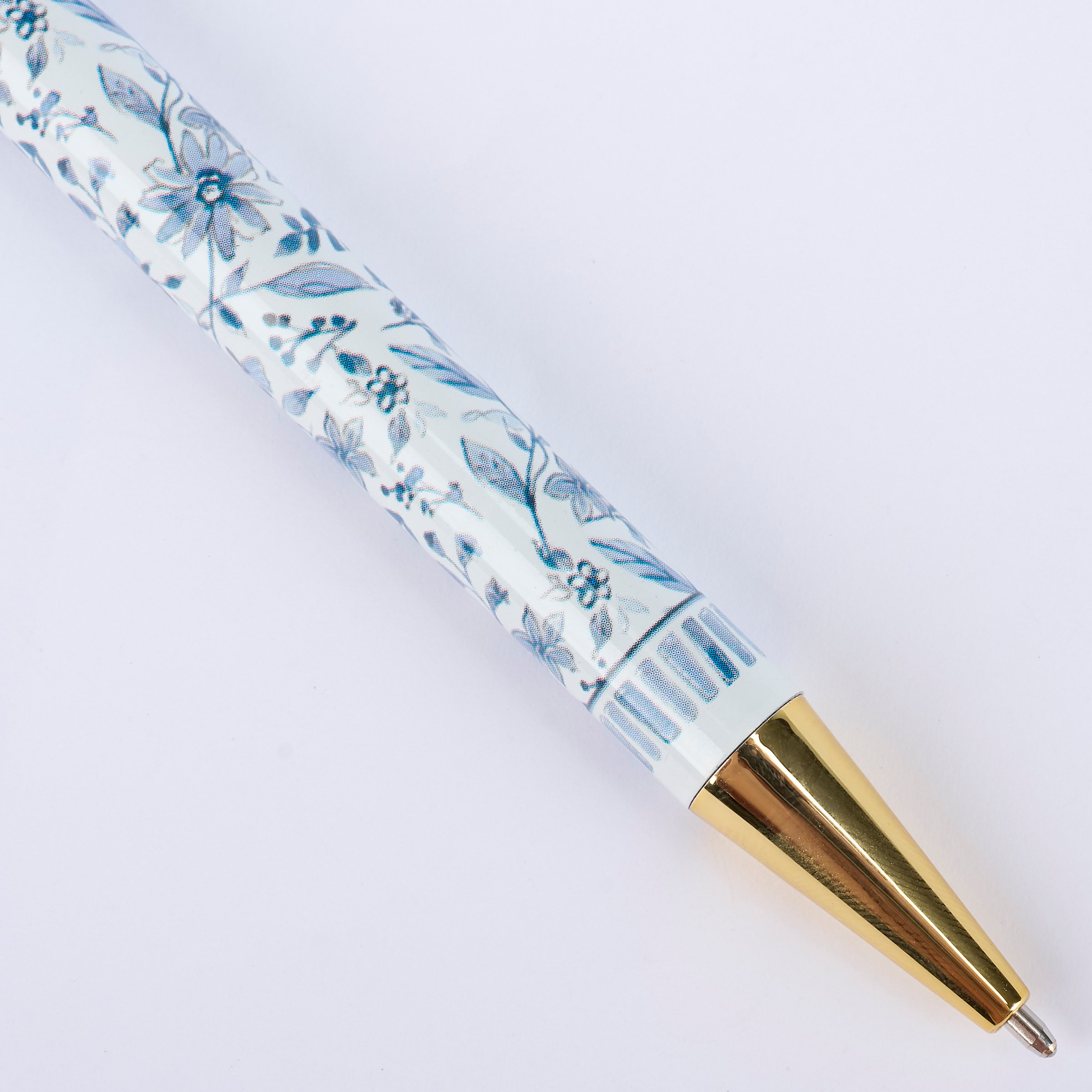 A metal pen from our Home Collection featuring a full wrap-around design of florals in a calming indigo blue color palette replicated from original hand painted watercolor art with gold accents on each end. This indigo floral pen also features a clip that rotates to reveal and retract pen point with black ink. Our Indigo Blue Florals pen is packaged in a decorative box displaying matching pattern with acrylic lid to easily view pen making it great for gifting and store display. A stylish gift perfect for everyday moments.