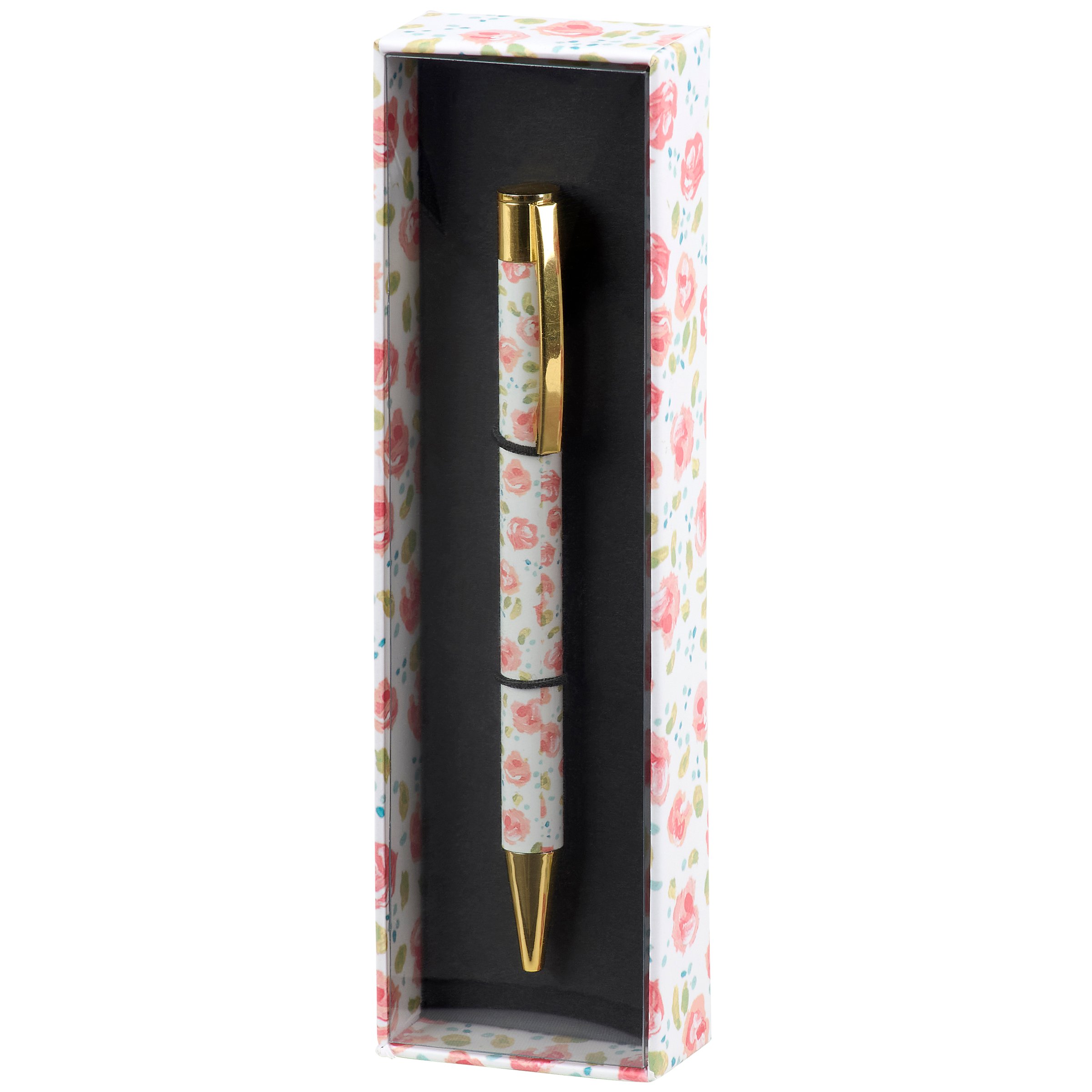 A metal pen from our Watercolor Collection featuring a full wrap-around design of pink roses replicated from original hand painted watercolor art with gold accents on each end. This stylish pen also features a clip that rotates to reveal and retract pen point with black ink. Our Pink Rose pen is packaged in a decorative box displaying matching pattern with acrylic lid to easily view pen making it great for gifting and store display. A stylish gift perfect for everyday moments.