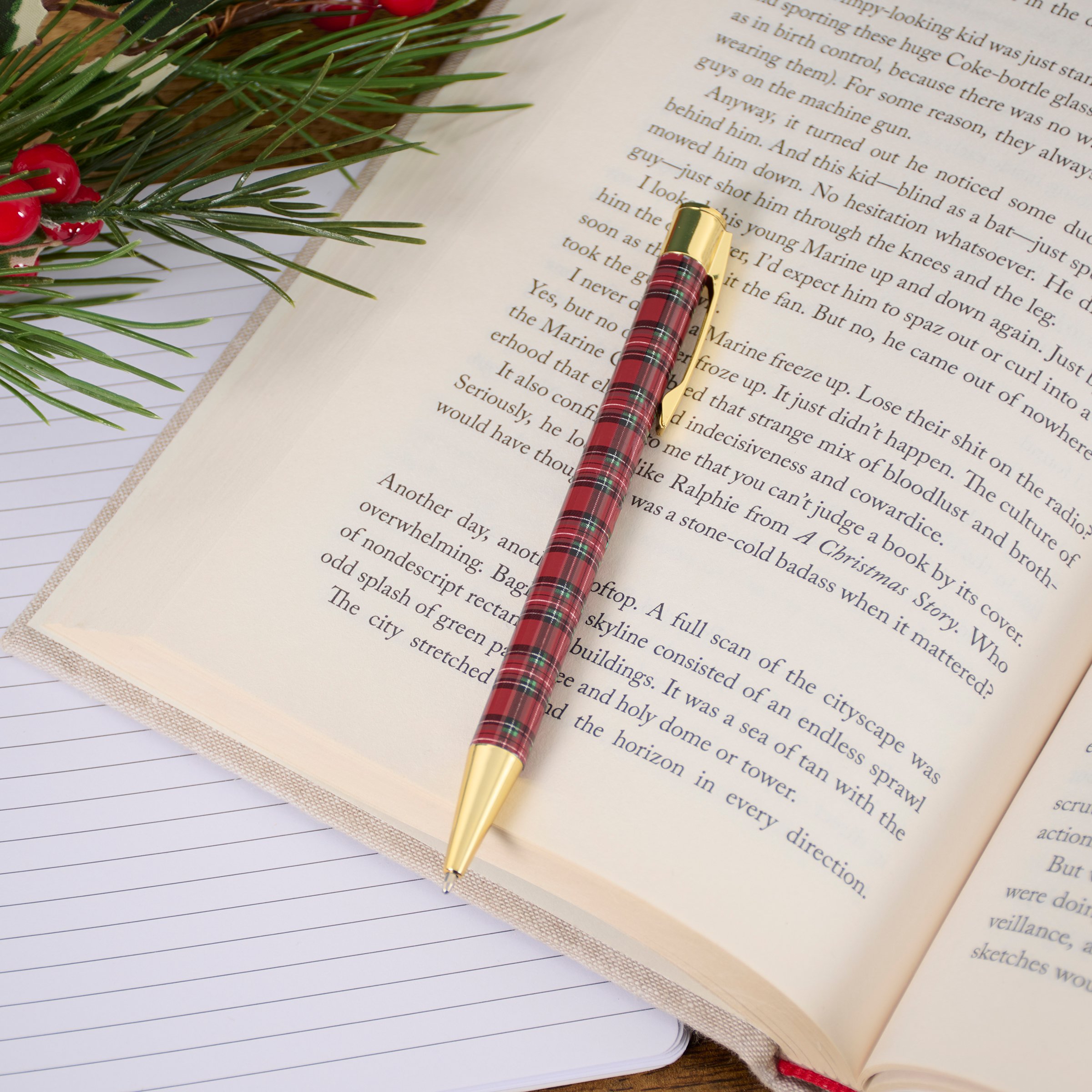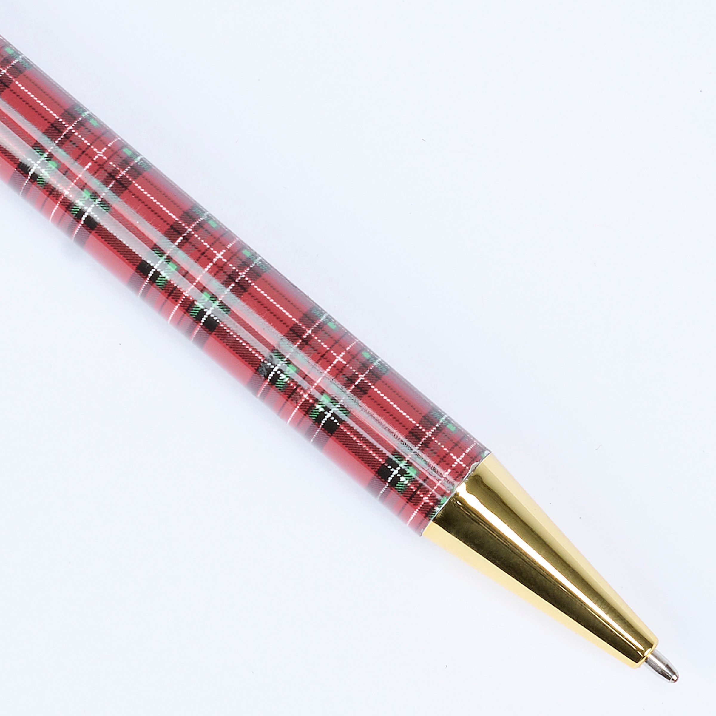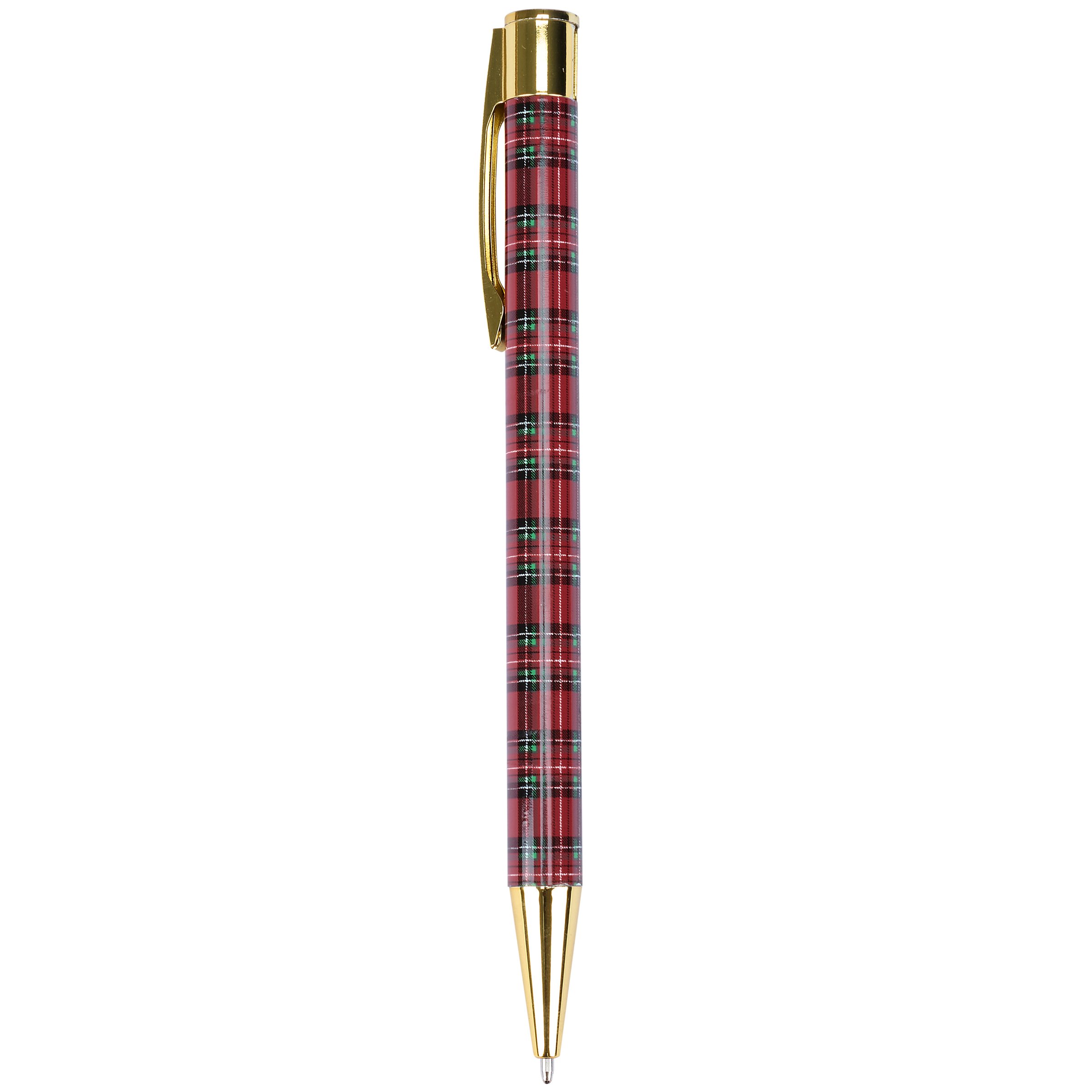 A metal pen from our Christmas Collection featuring a full wrap-around design displaying a holiday red plaid pattern replicated from original artwork painted onto burlap canvas, giving the art a unique depth and texture. This red plaid pen also features gold accents on each end as well as a clip that rotates to reveal and retract the pen point with black ink. Our Red Plaid pen is packaged in a decorative box displaying a matching design with acrylic lid to easily view pen making it great for gifting and store display. A rustic Christmas gift perfect for seasonal moments.