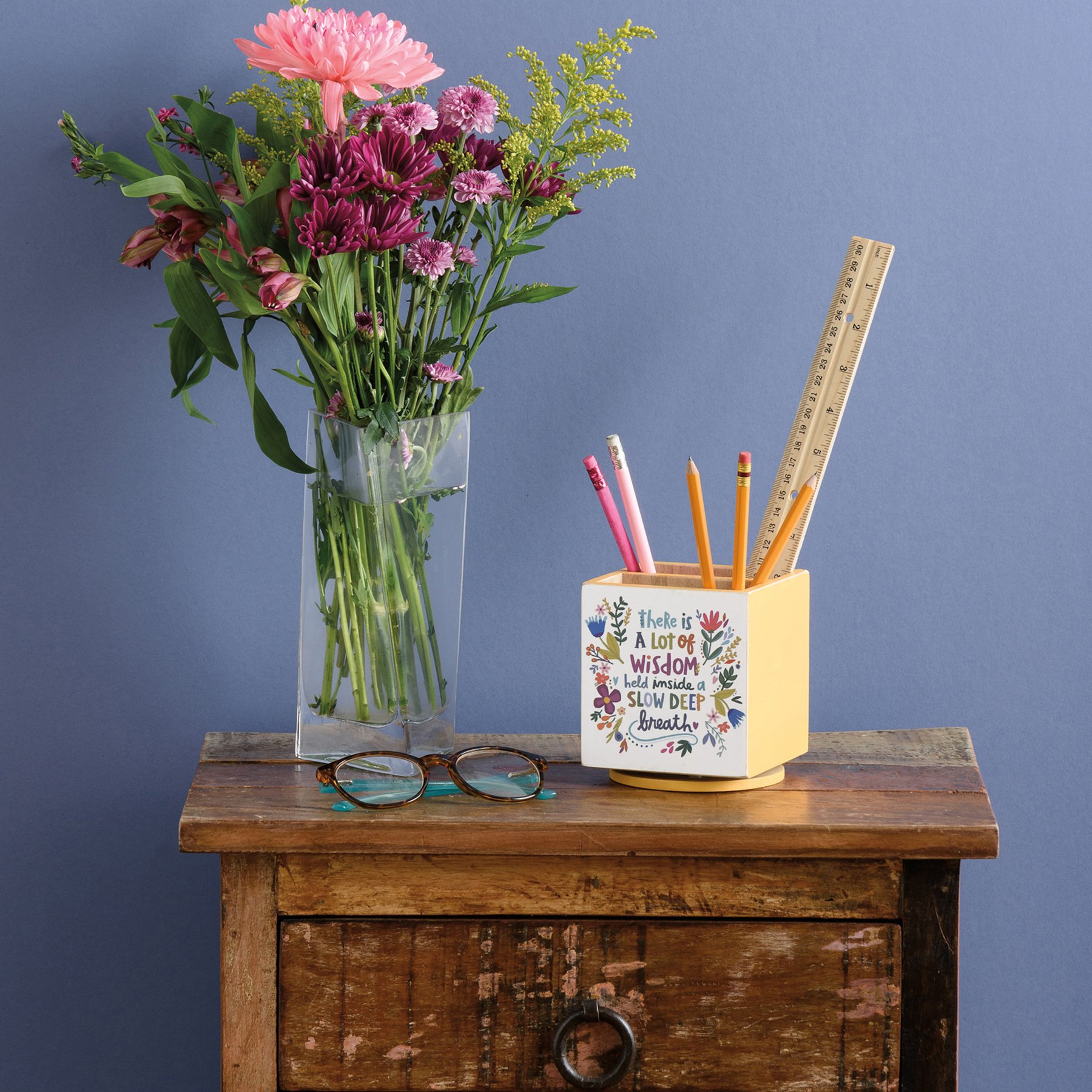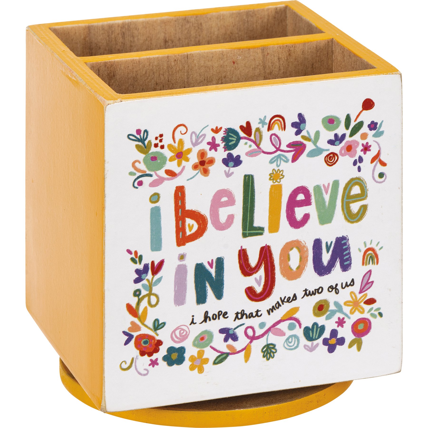 A double-sided, wooden pencil spinner featuring various floral designs, "I Believe In You I Hope That Makes Two Of Us," and "There Is A Lot Of Wisdom Held Inside A Slow Deep Breath" sentiments, and natural wood sides. Pencil holder is divided in two even spaces. Accessories not included.