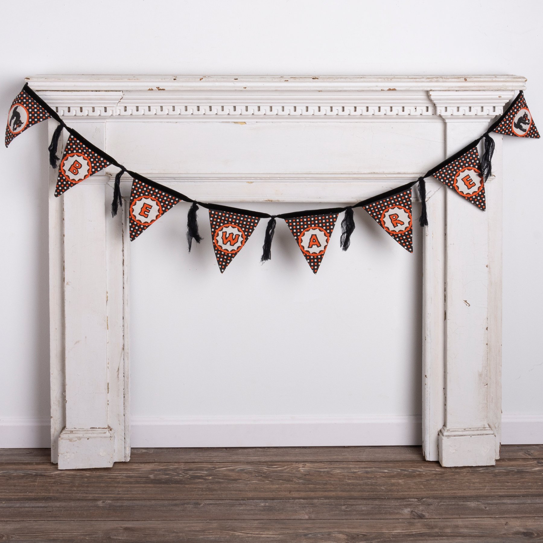 A vintage-inspired fabric pennant garland from our Halloween Collection featuring a "Beware" sentiment with patterned background, cat designs, and strips of distressed fabric streamers.