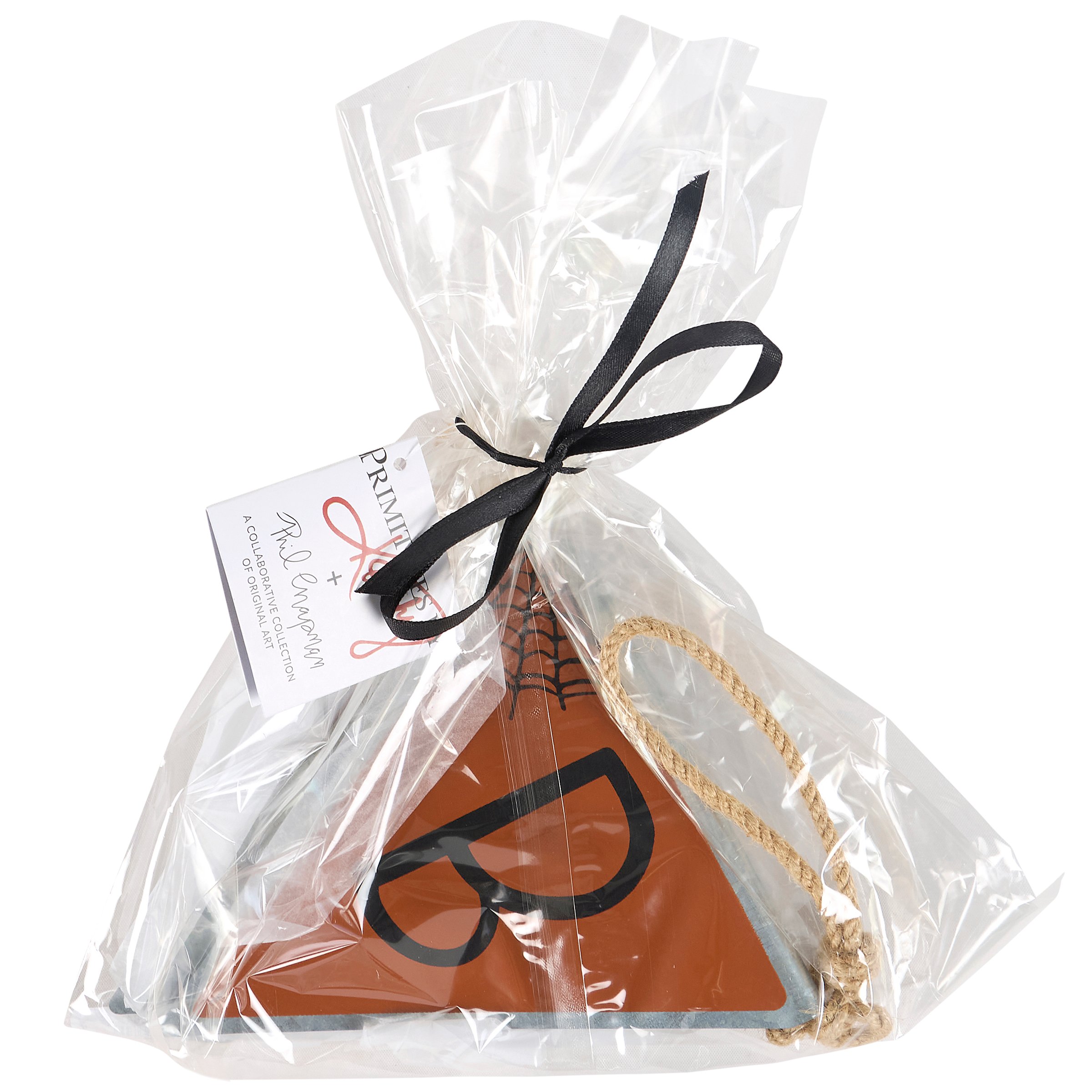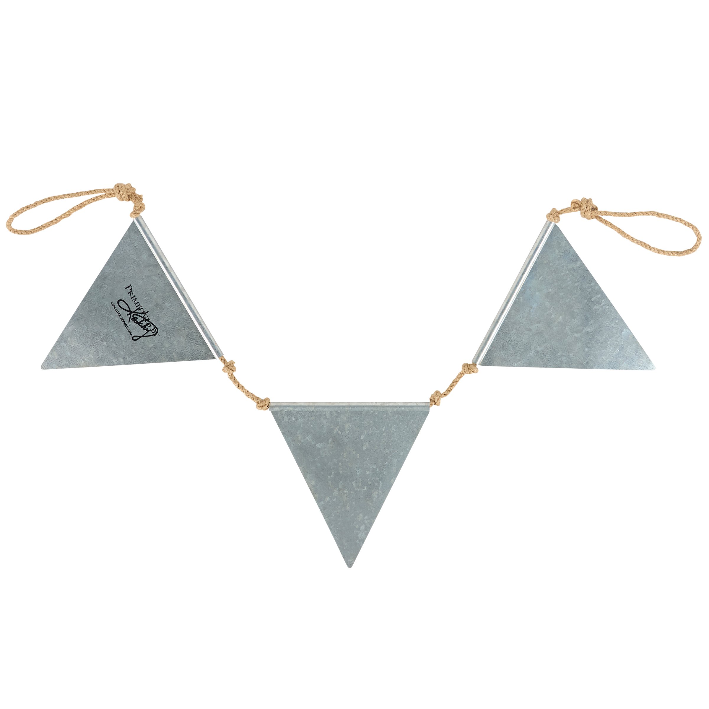 A metal pennant banner from our Halloween Collection displaying the letters of "BOO" on each pennant along a jute rope with spider design accents and galvanized metal borders. Our Boo pennant banner is easy to hang for display via the jute rope loops on each end. Seasonal banner is packaged in a polybag tied with black ribbon. A rustic Halloween home accent perfect for seasonal decorating.