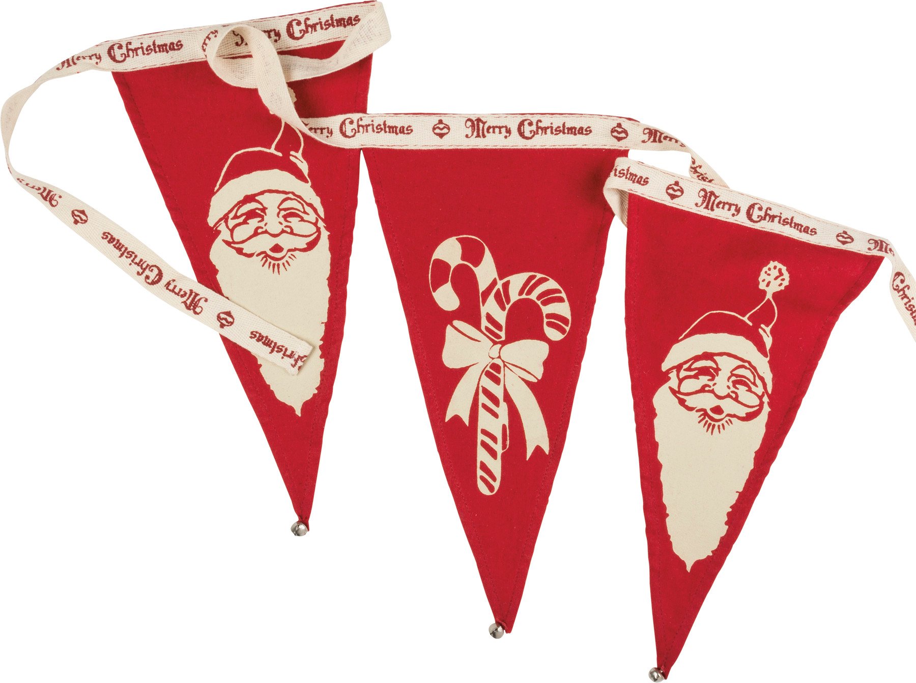 A fabric pennant garland for the holidays featuring alternating Santa Claus and candy cane designs with top replicated "Merry Christmas" trim sentiments.