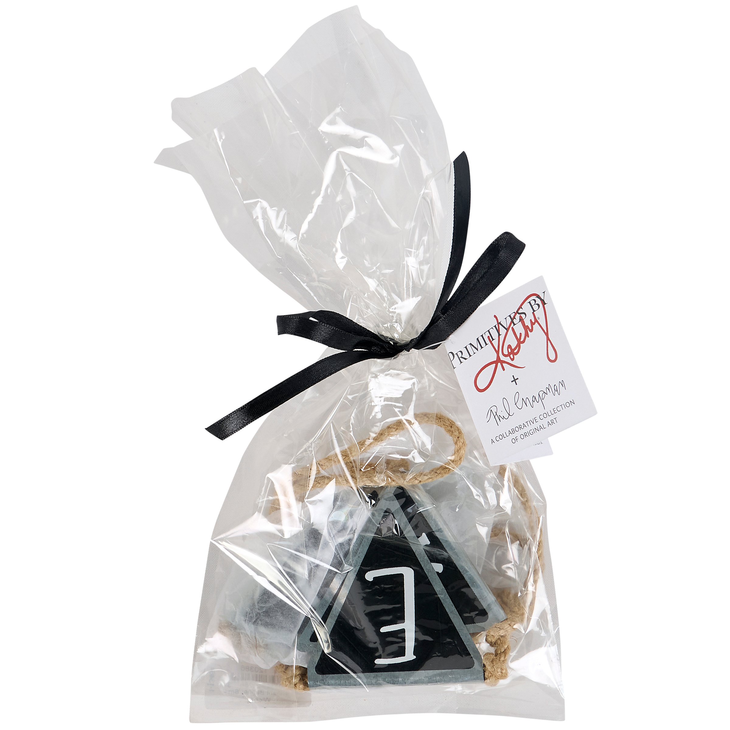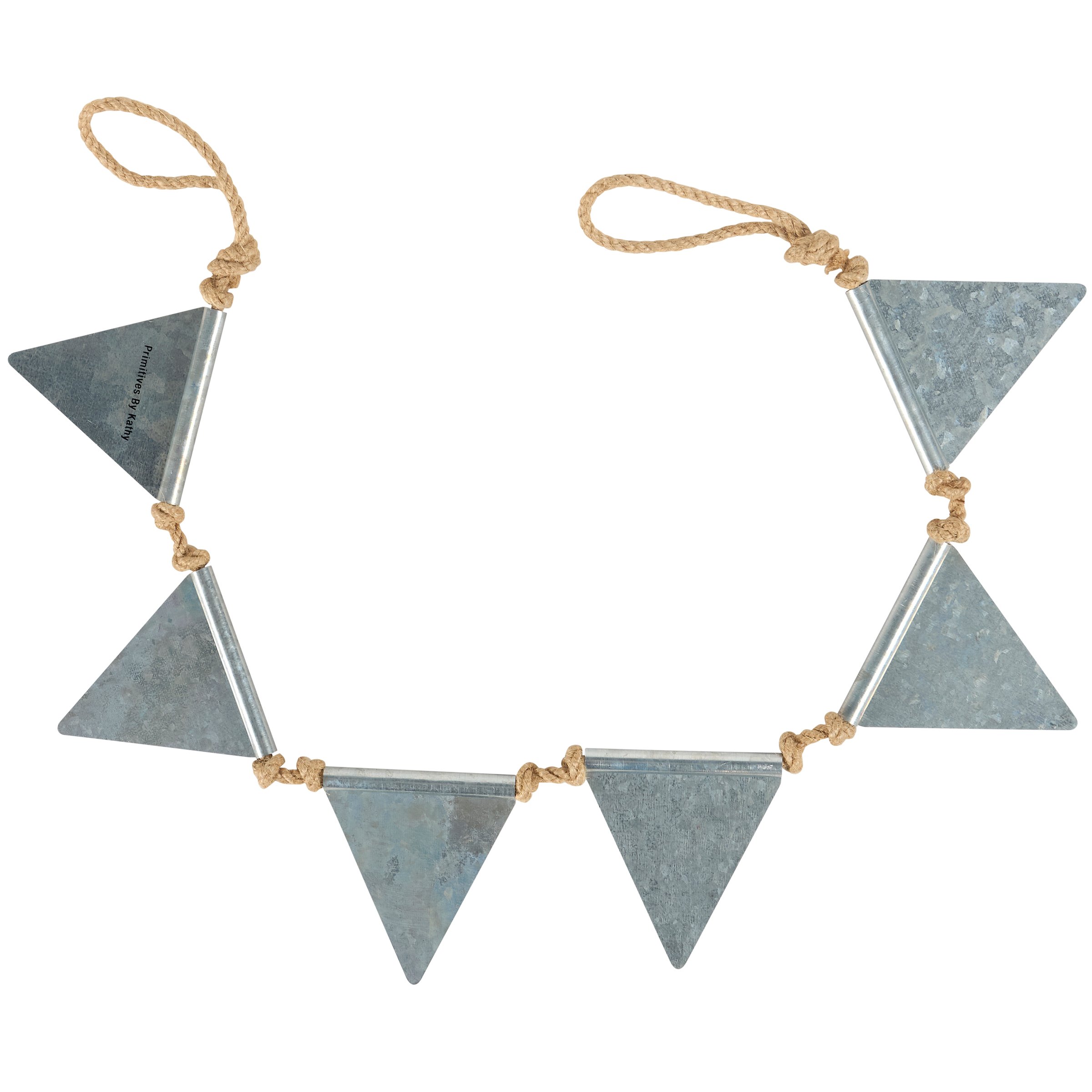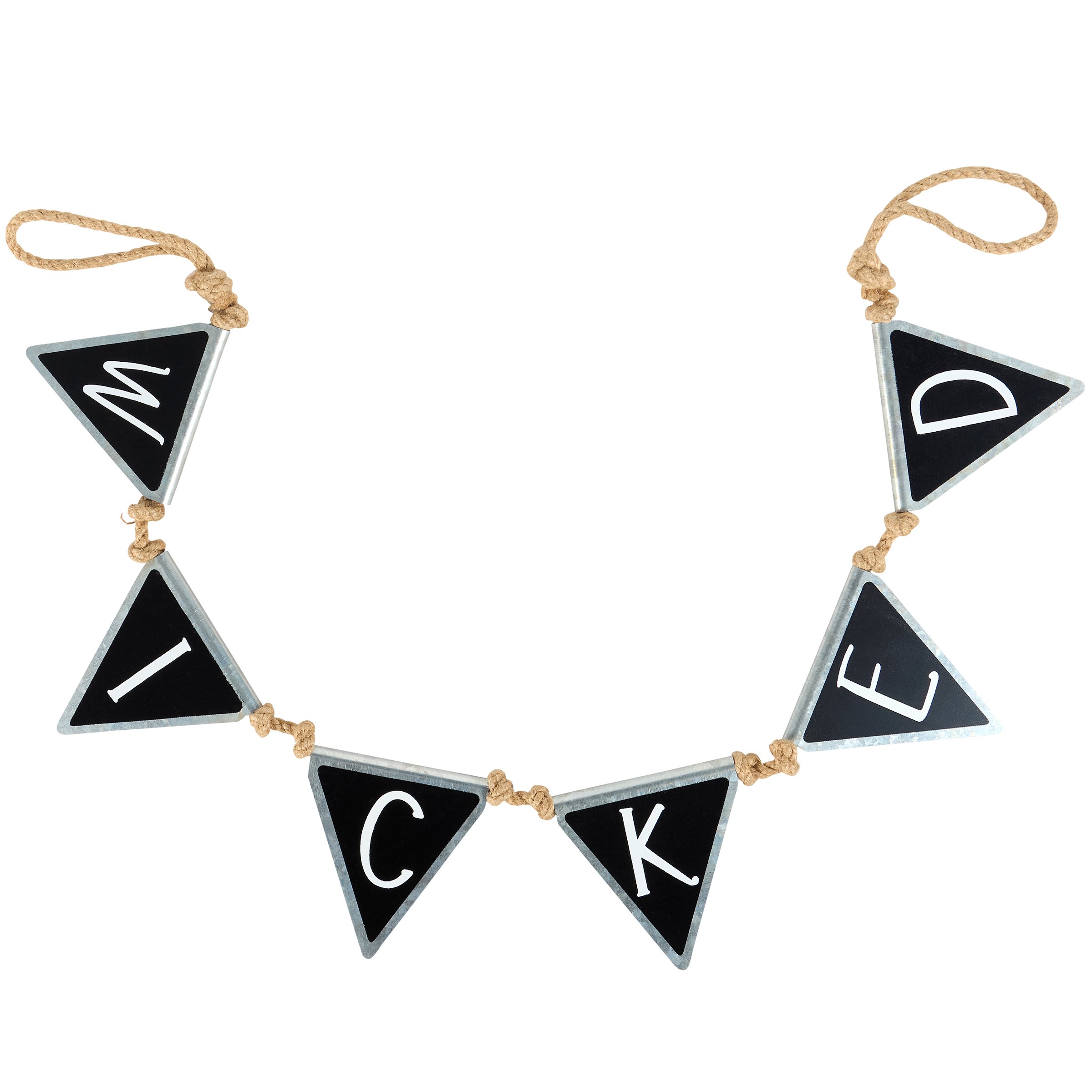 A metal pennant banner from our Halloween Collection displaying the letters of "Wicked" on each pennant along a jute rope with galvanized metal borders. Our Wicked pennant banner is easy to hang for display via the jute rope loops on each end. Seasonal banner is packaged in a polybag tied with black ribbon. A rustic Halloween home accent perfect for seasonal decorating.