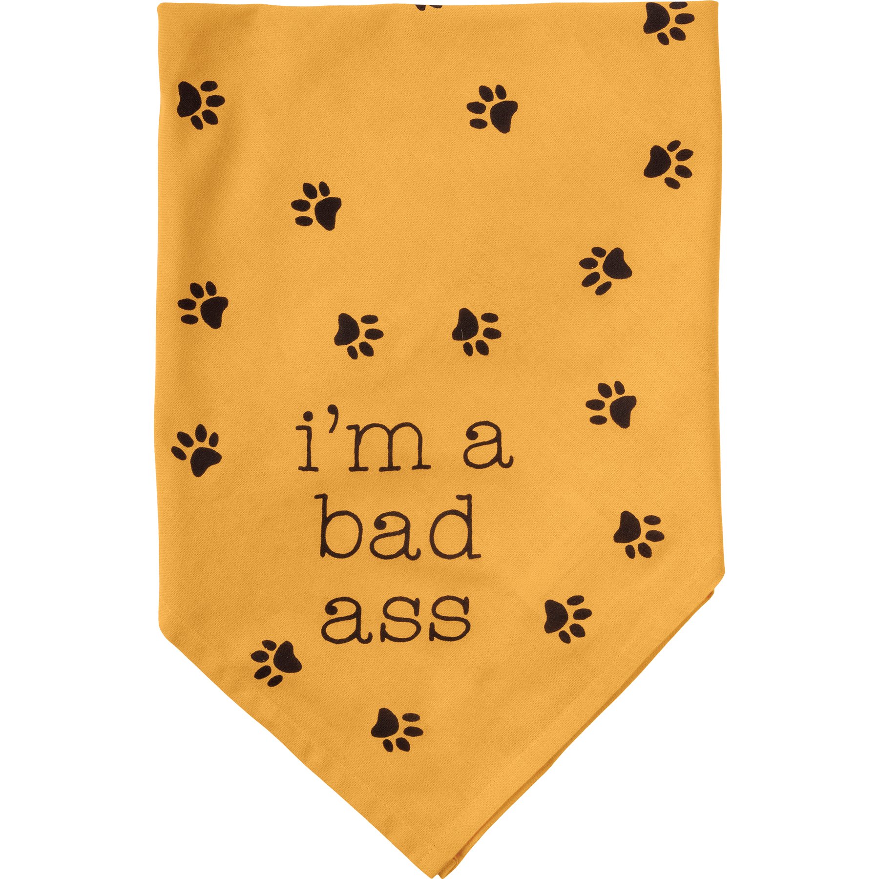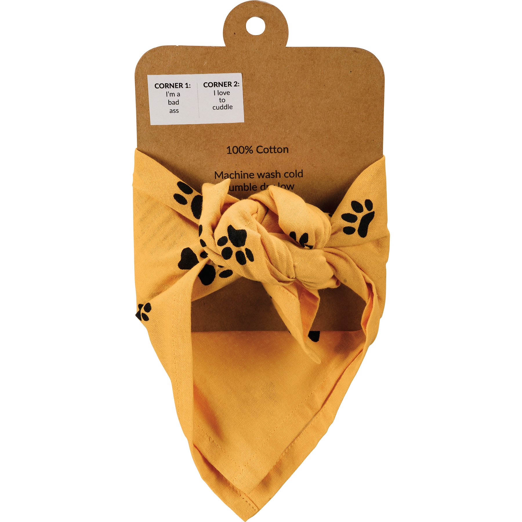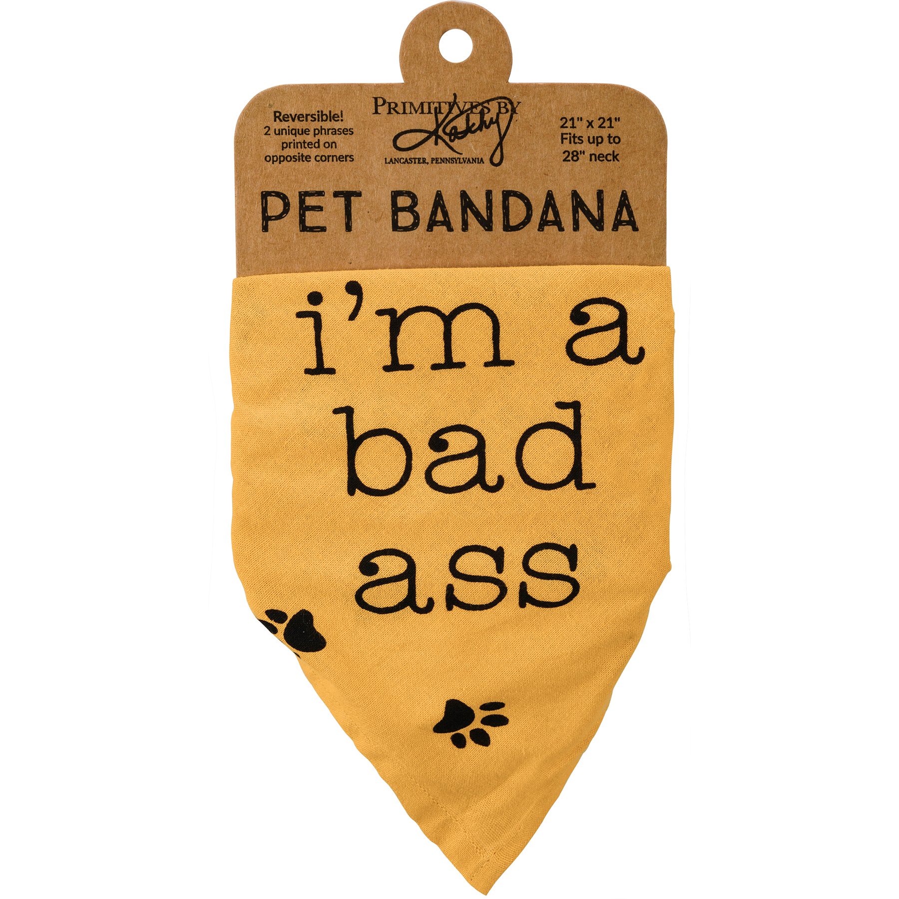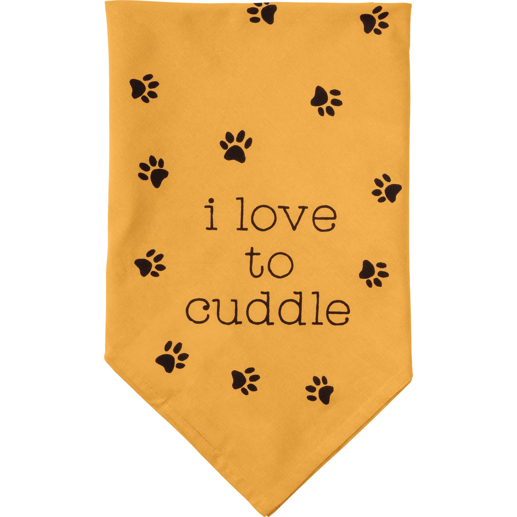 A large reversible pet bandana featuring "I Love To Cuddle" and "I'm A Bad Ass" sentiments on opposite corners with all-over print design. 21" x 21". Machine-washable.