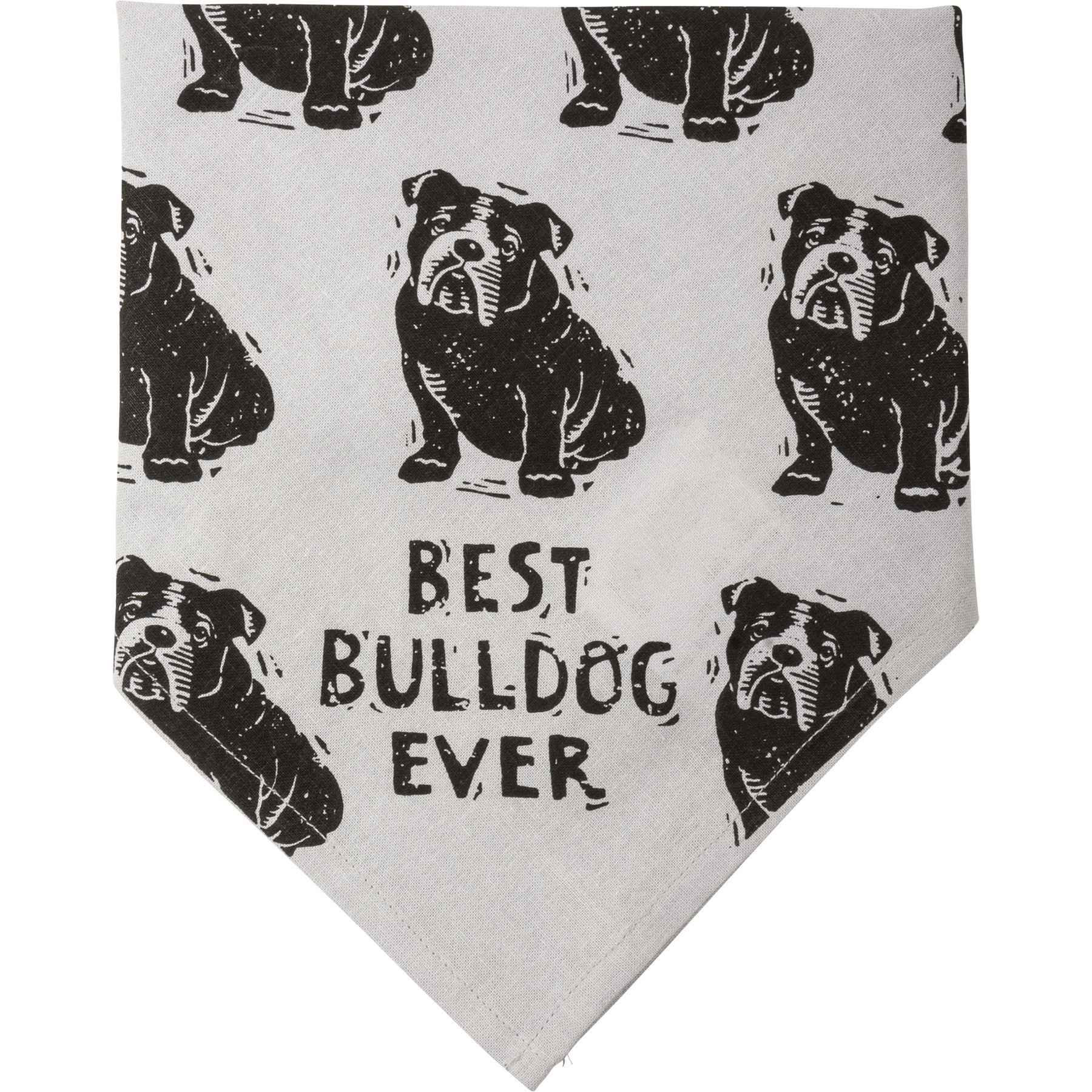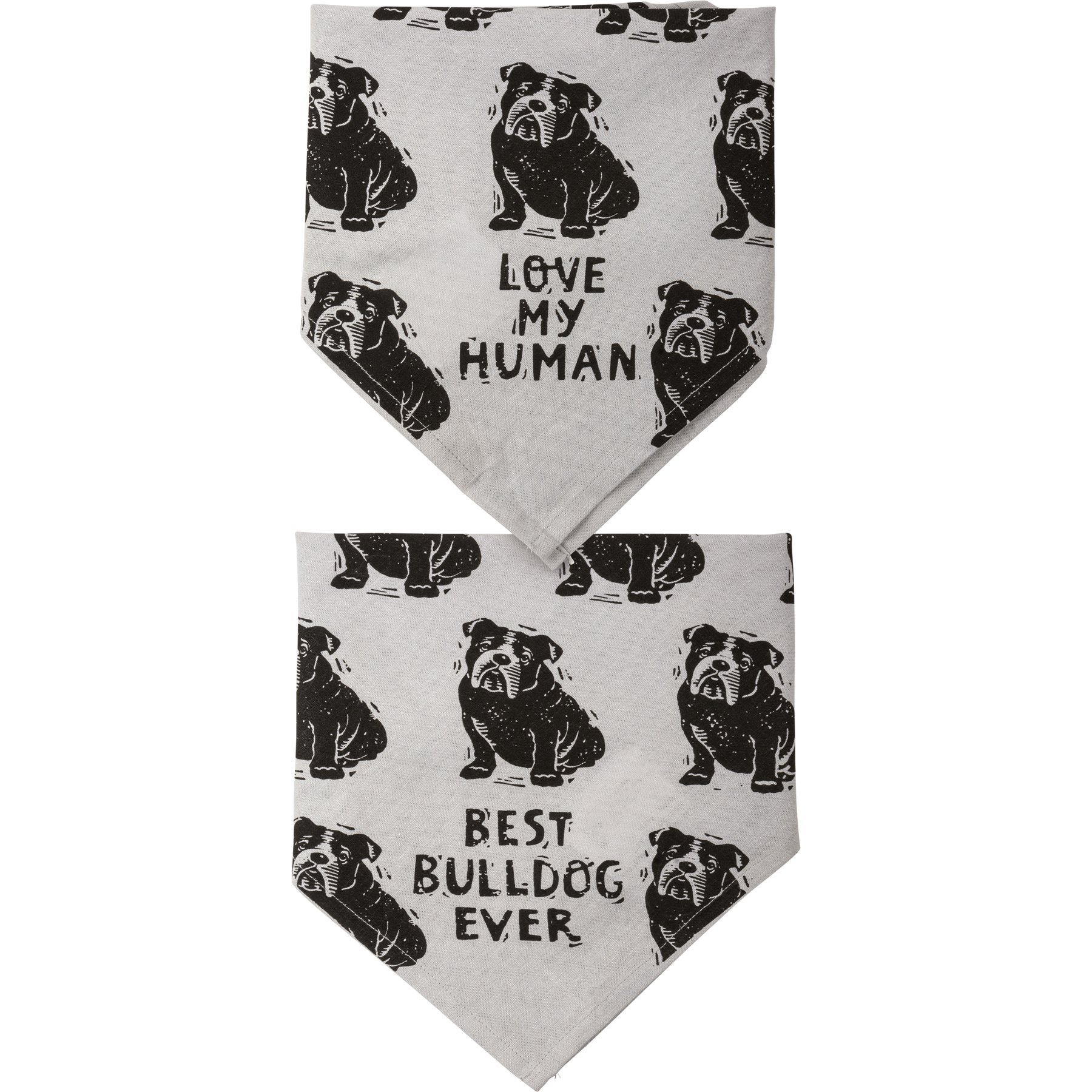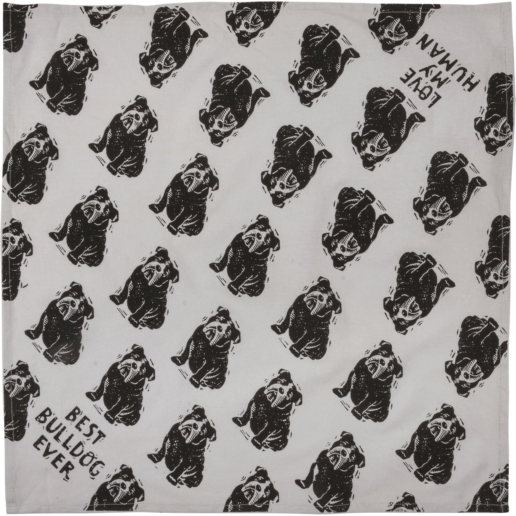 A large reversible pet bandana from our Pet Collection featuring "Best Bulldog Ever" and "Love My Human" sentiments on opposite corners with an all-over block print bulldog design. Bandana is made of cotton and is machine-washable. Best Bulldog Ever pet bandana coordinates with our Love My Bulldog Baseball Cap for matching dog and owner outfits.