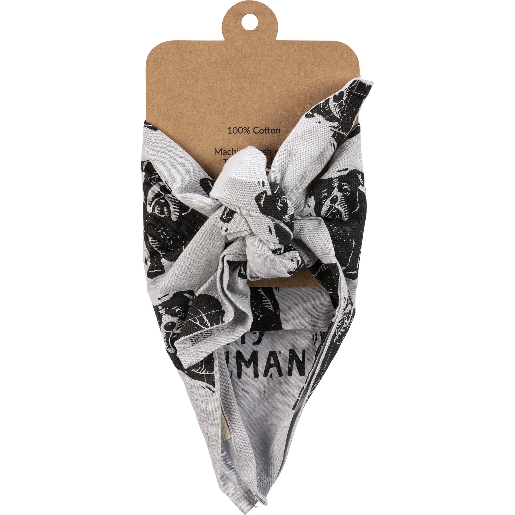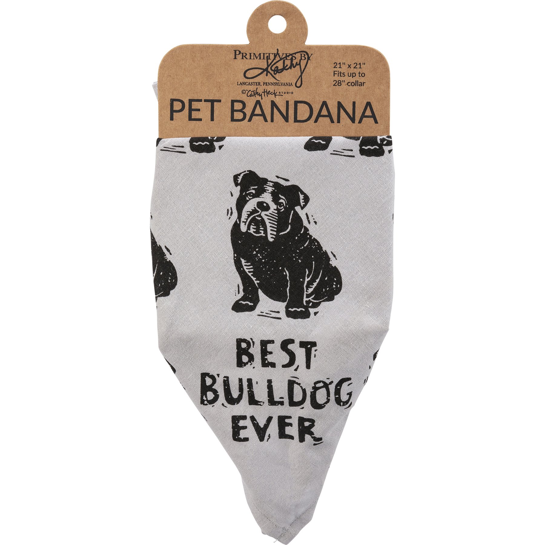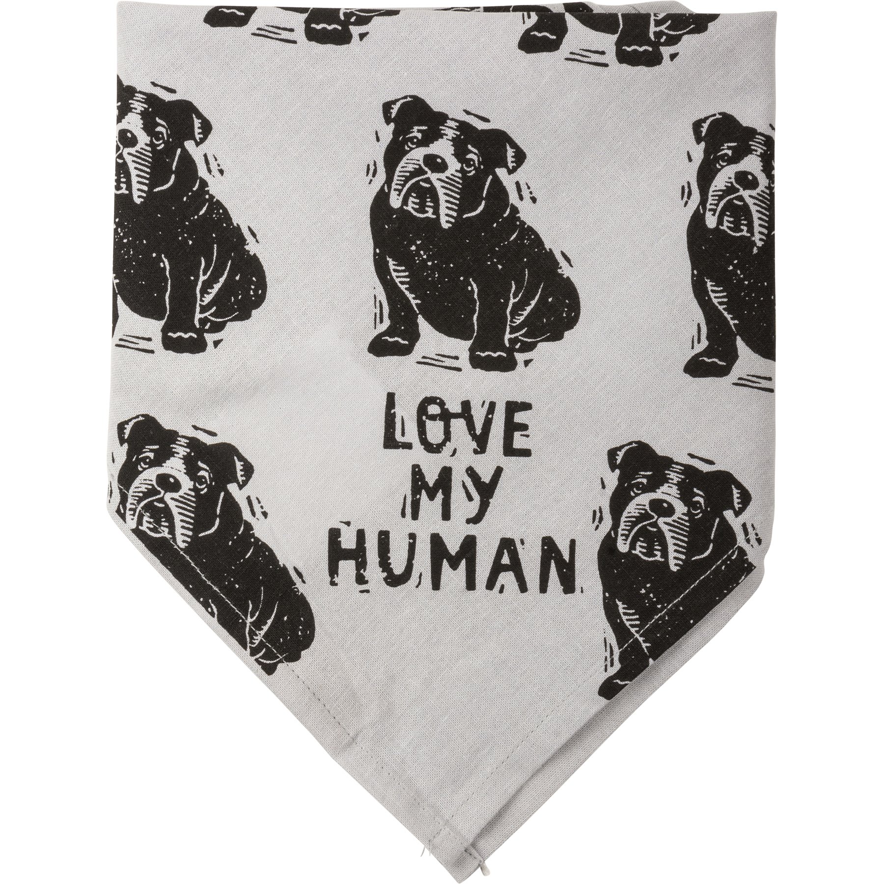 A large reversible pet bandana from our Pet Collection featuring "Best Bulldog Ever" and "Love My Human" sentiments on opposite corners with an all-over block print bulldog design. Bandana is made of cotton and is machine-washable. Best Bulldog Ever pet bandana coordinates with our Love My Bulldog Baseball Cap for matching dog and owner outfits.
