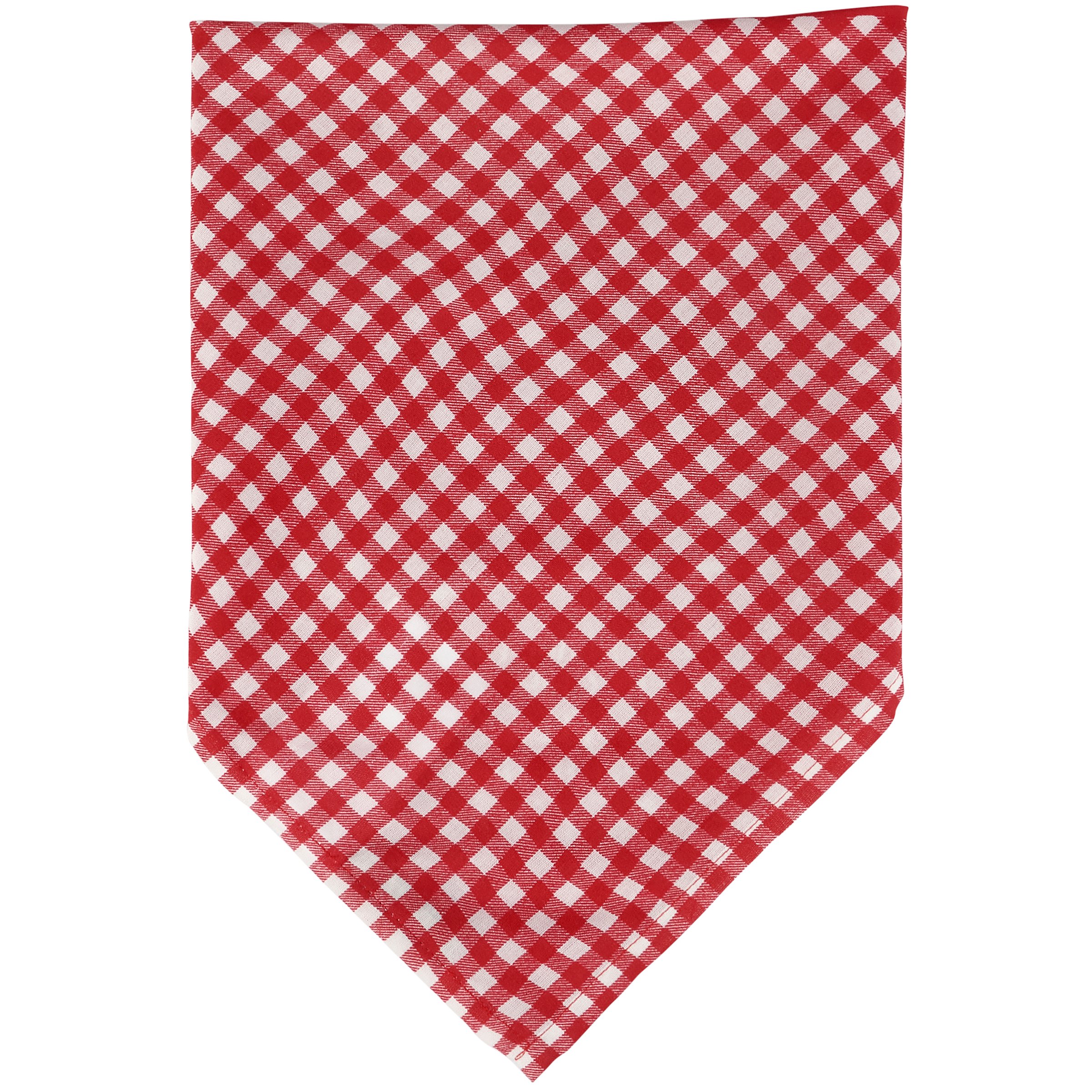 A large reversible pet bandana from our Pet Collection displaying hand illustrated grilling-themed designs on opposite corners for multiple fun style options. Designs include spatula and burger patty with fun food-themed sentiment that reads "Every Burger You Flip, Every Chip You Dip, I'll Be Watching You" on one corner and red check pattern on the other corner. Bandana features soft rayon material to resist dirt. Our large Every Burger pet bandana is machine-washable for convenient cleaning. Packaged on a cardboard backer with hole to easily display on rack and wash instructions on the back. A stylish grilling-themed accessory perfect for any furry family member. Large size fits up to a 28 inch neck.