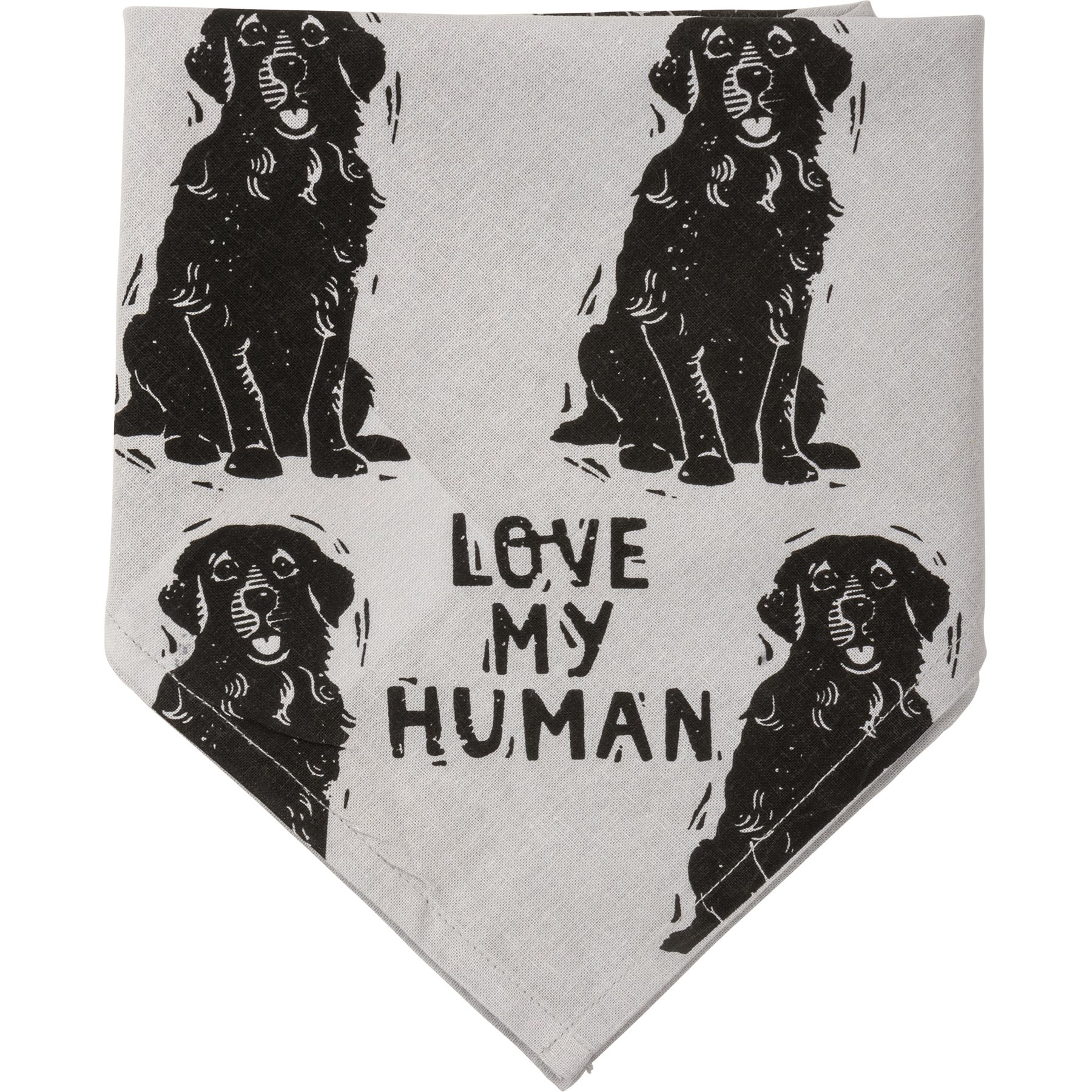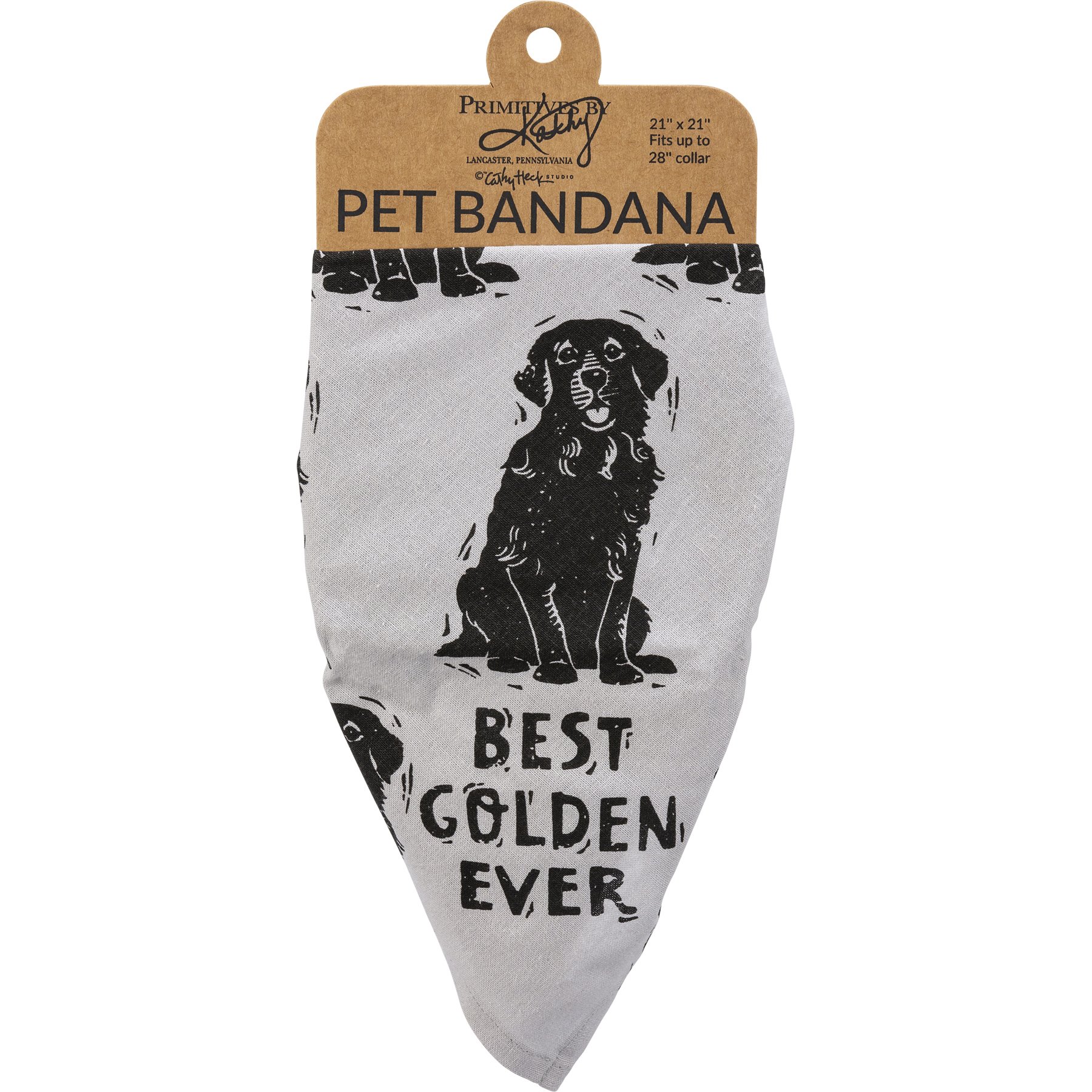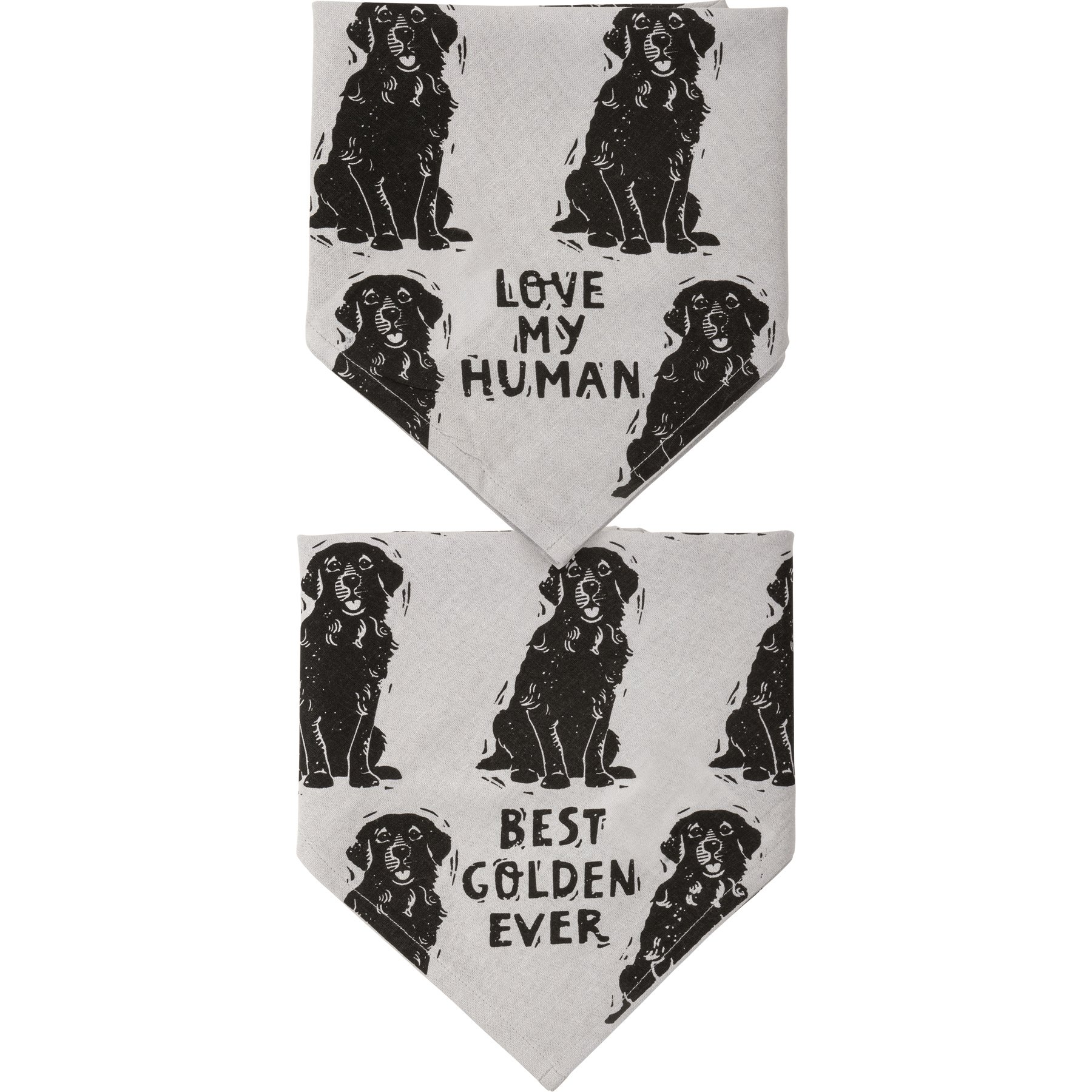 A large reversible pet bandana from our Pet Collection featuring "Best Golden Ever" and "Love My Human" sentiments on opposite corners with an all-over block print golden retriever design. Bandana is made of cotton and is machine-washable. Best Golden Ever pet bandana coordinates with our Love My Golden Baseball Cap for matching dog and owner outfits.