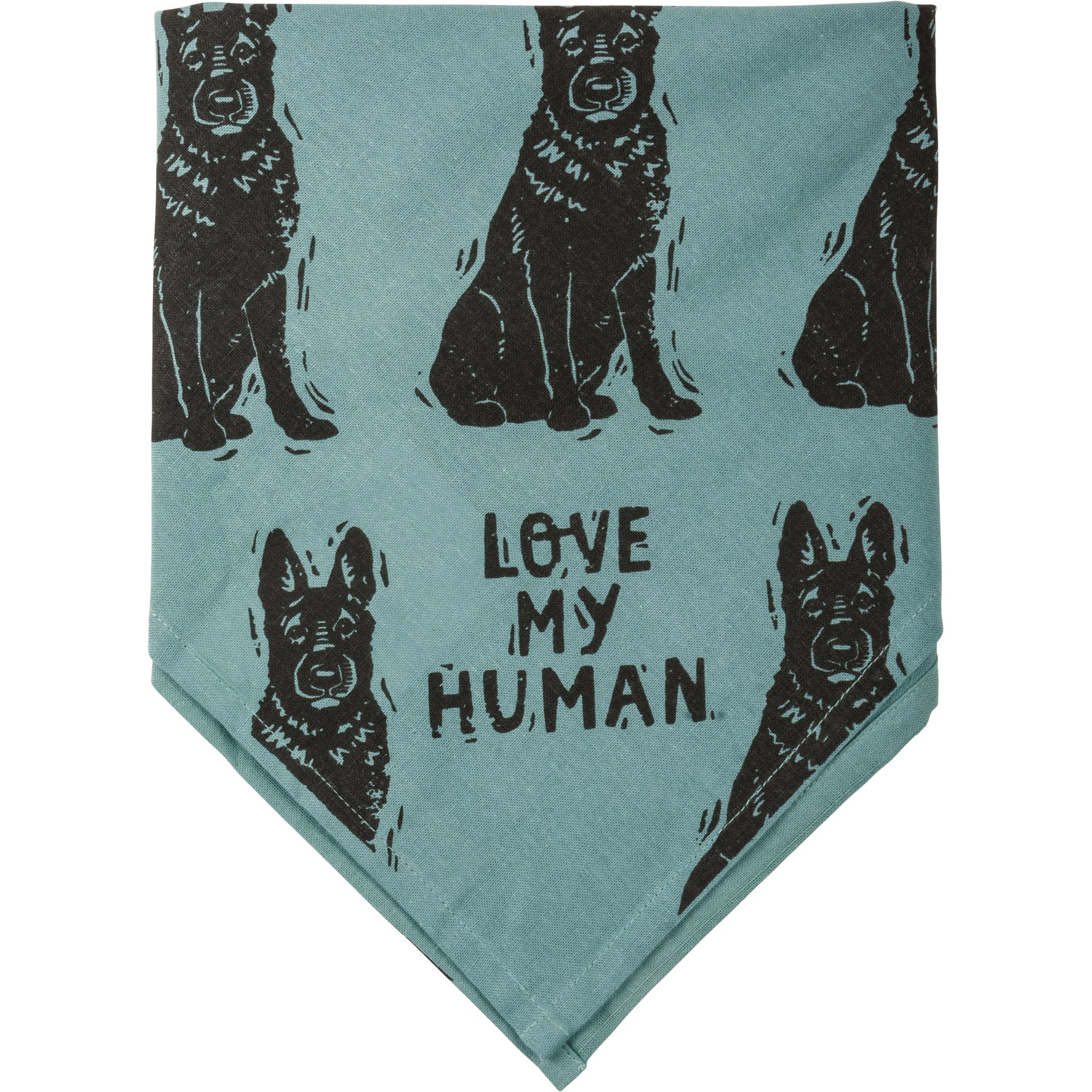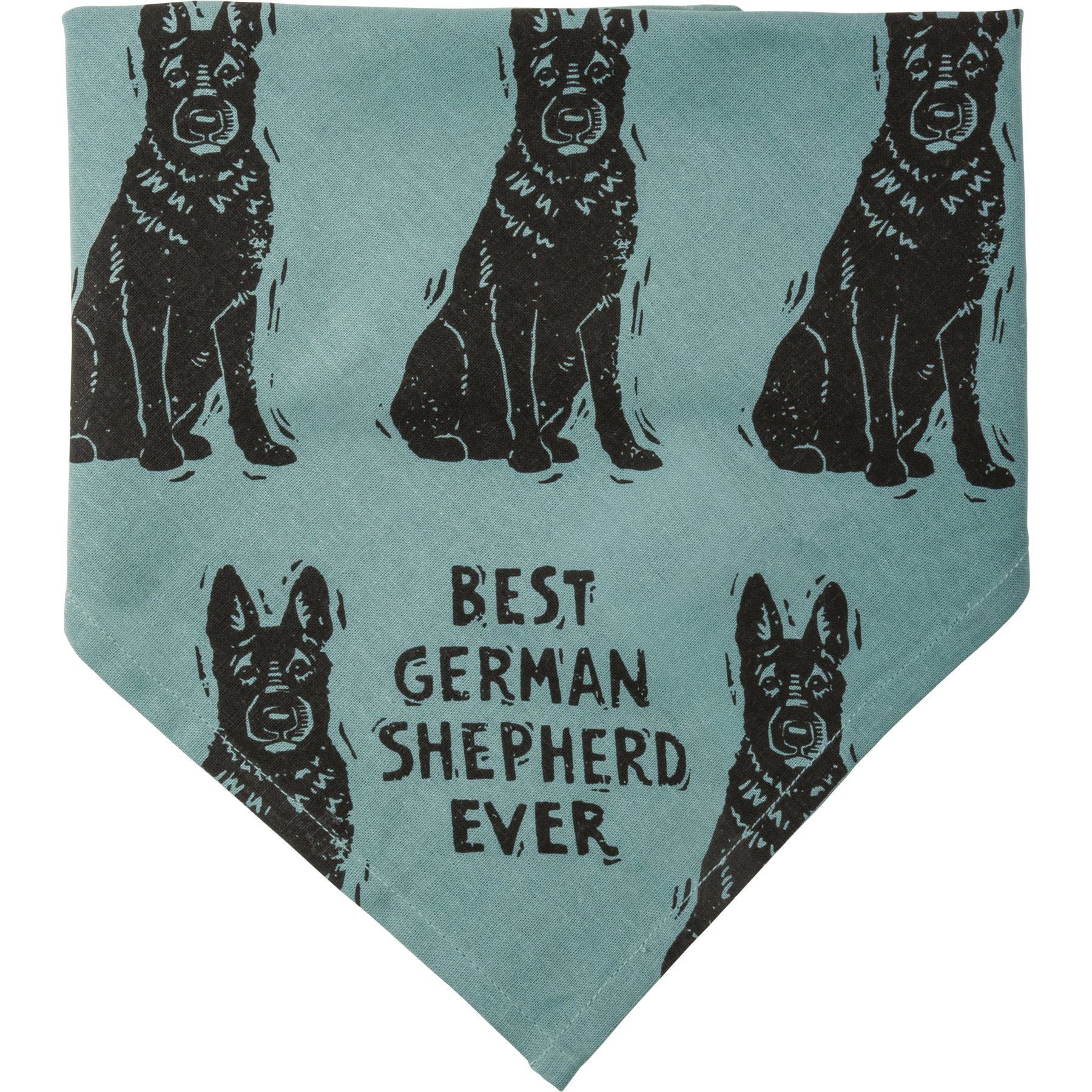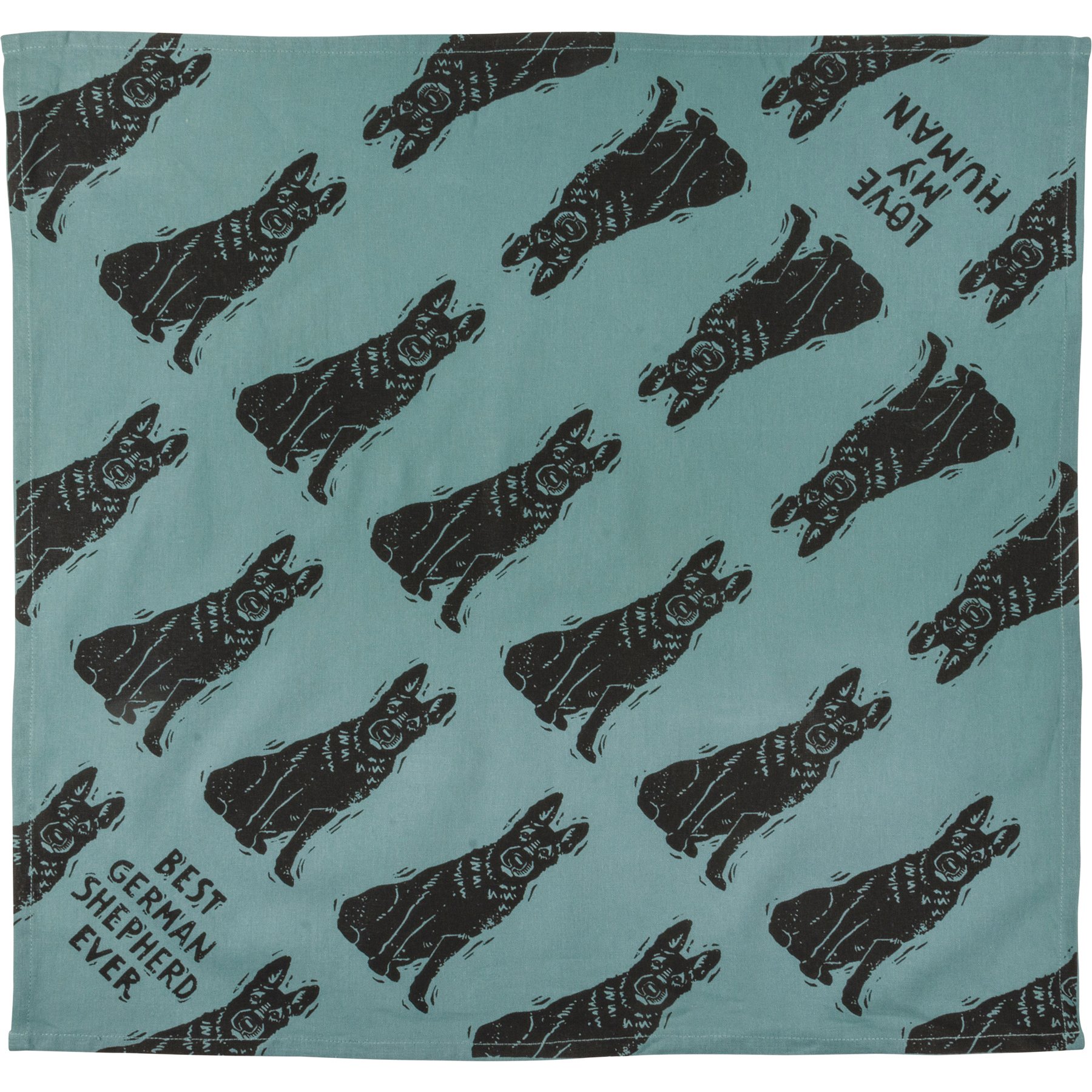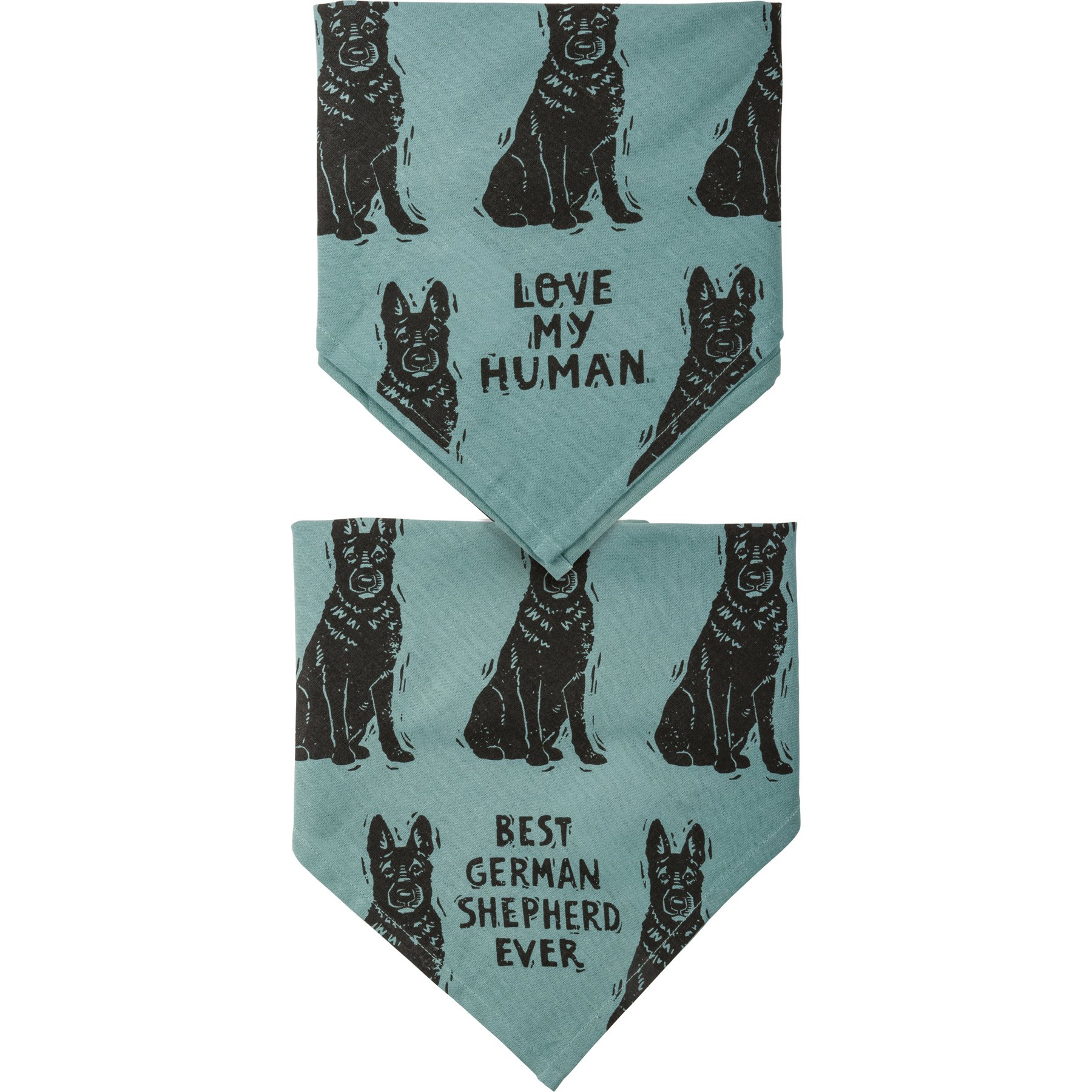 A large reversible pet bandana from our Pet Collection featuring "Best German Shepherd Ever" and "Love My Human" sentiments on opposite corners with an all-over block print german shepherd design. Bandana is made of cotton and is machine-washable. Best German Shepherd Ever pet bandana coordinates with our Love My German Shepherd Baseball Cap for matching dog and owner outfits.