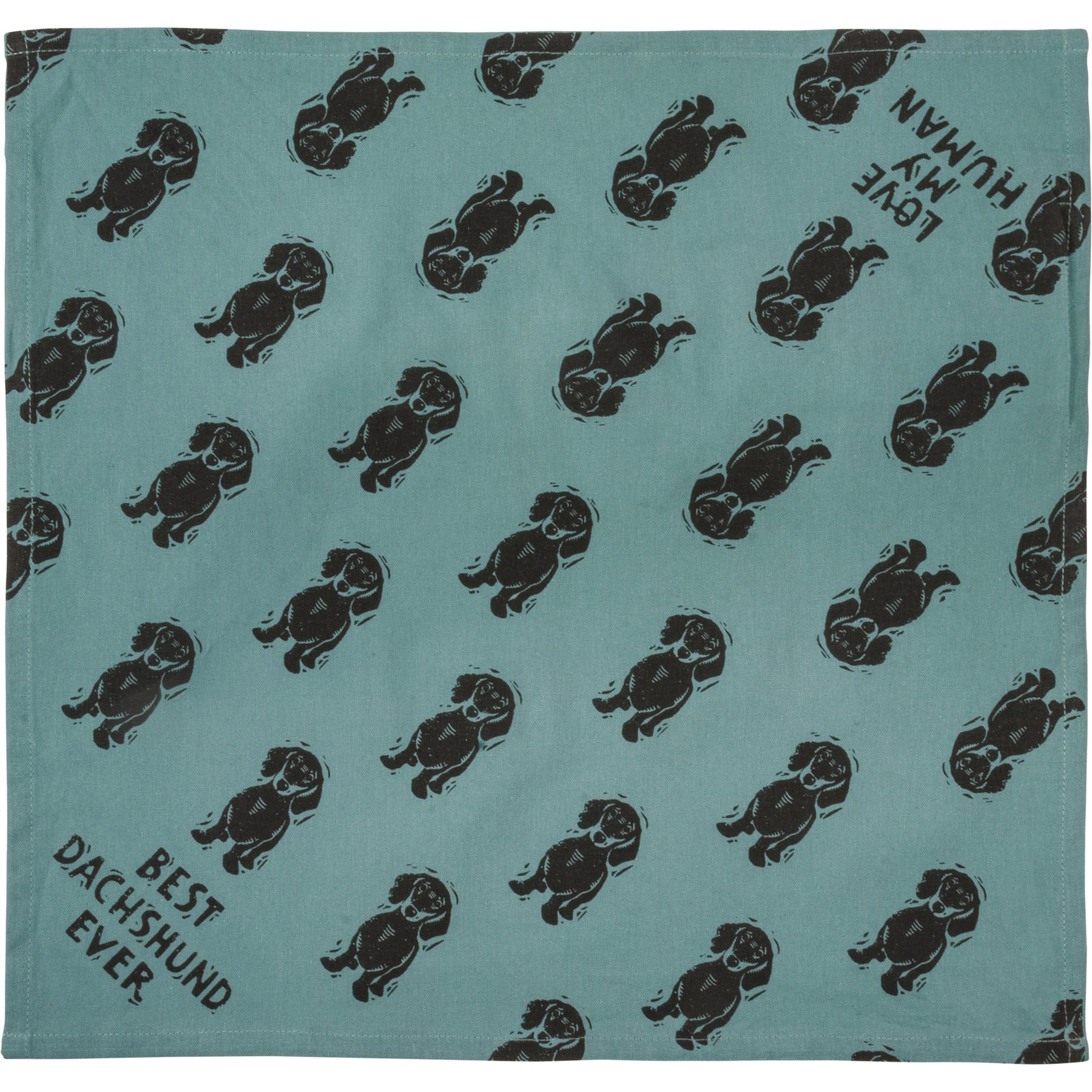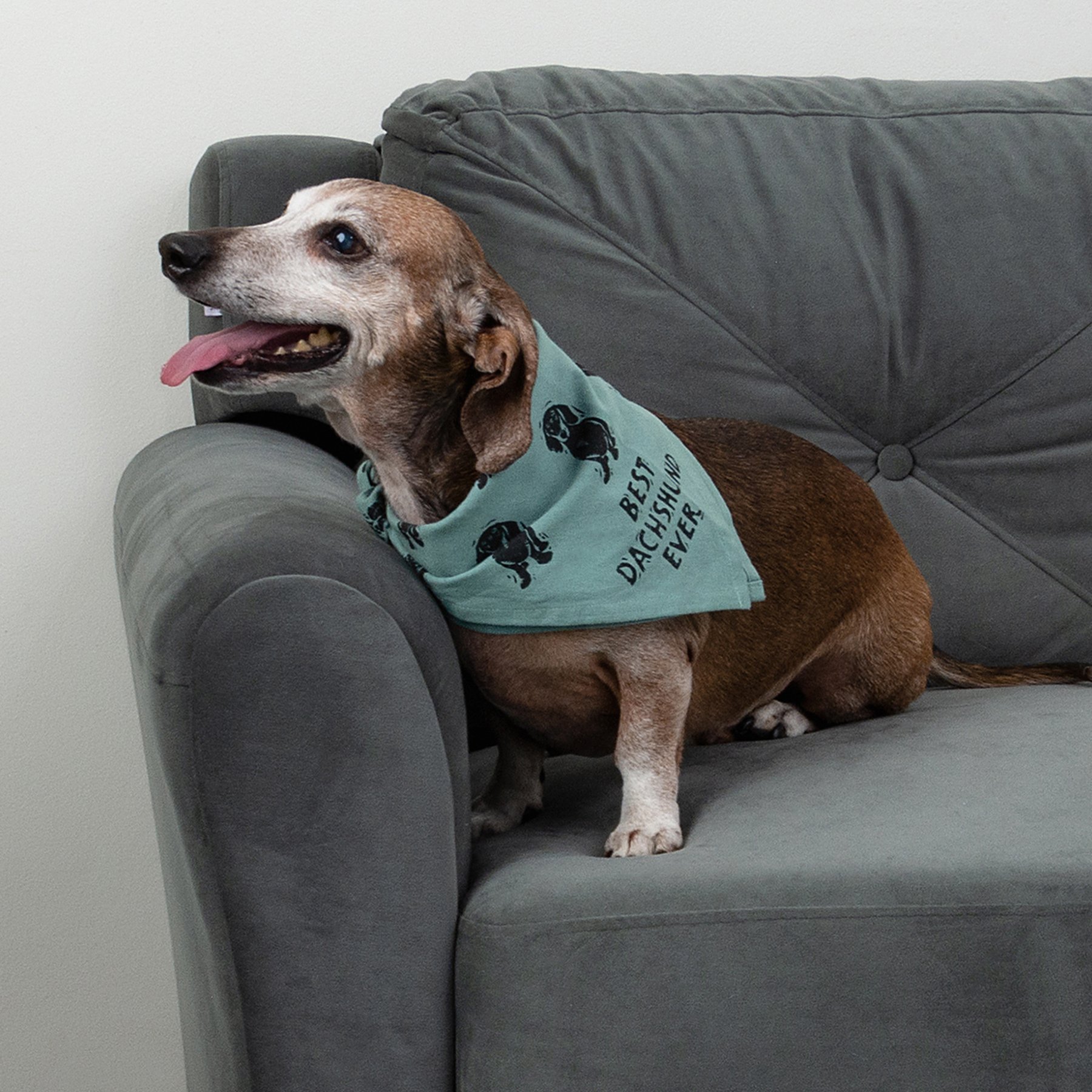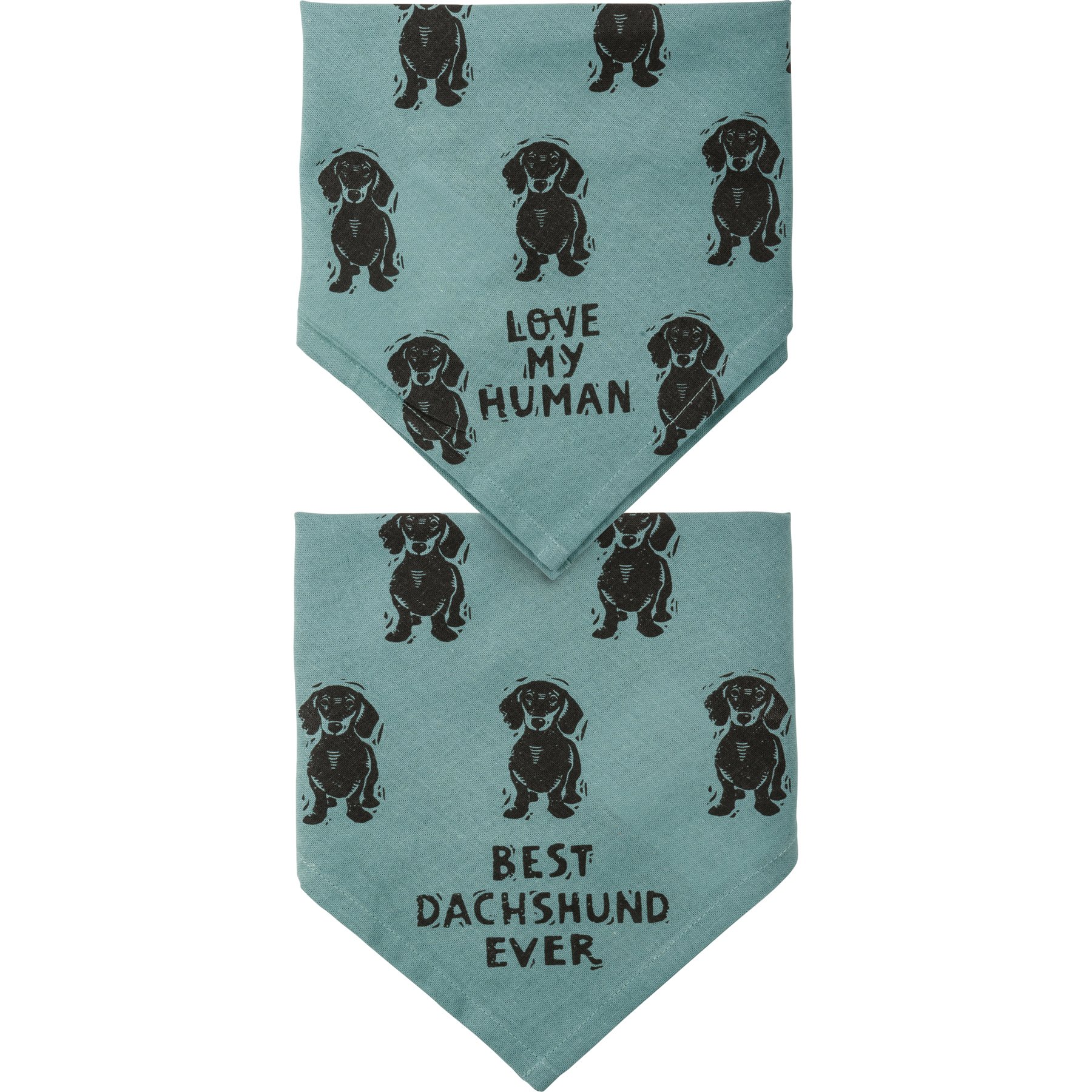 A small reversible pet bandana from our Pet Collection featuring "Best Dachshund Ever" and "Love My Human" sentiments on opposite corners with an all-over block print dachshund design. Bandana is made of cotton and is machine-washable. Best Dachshund Ever pet bandana coordinates with our Love My Dachshund Baseball Cap for matching dog and owner outfits.