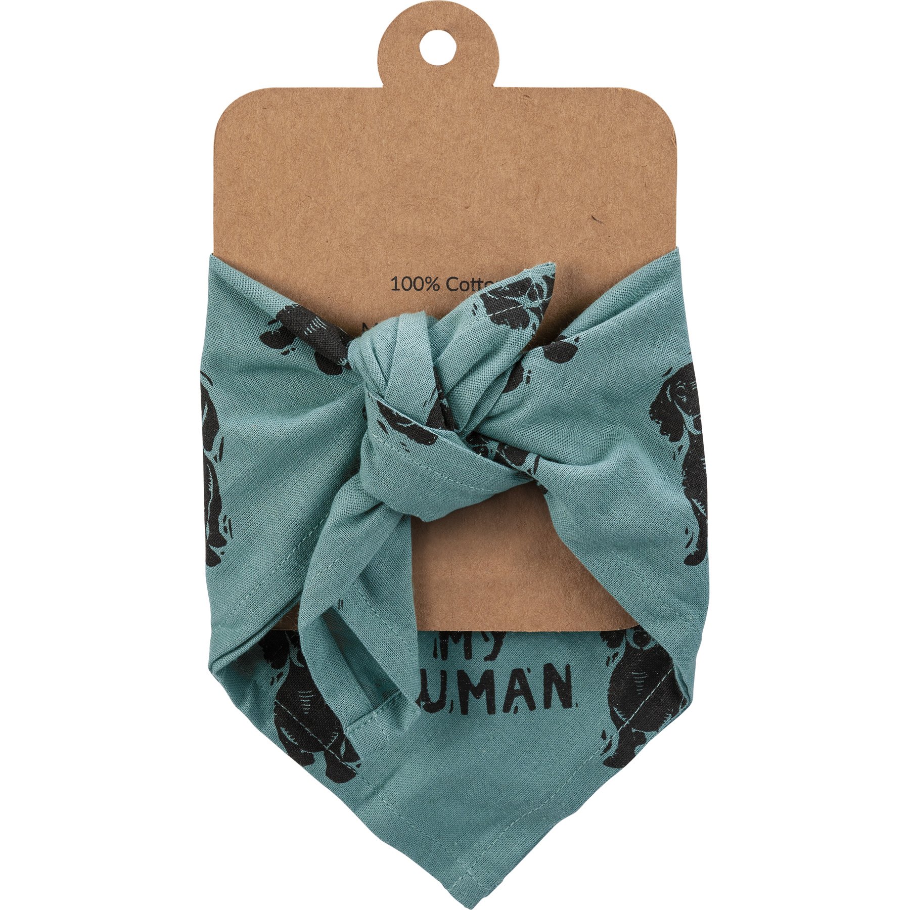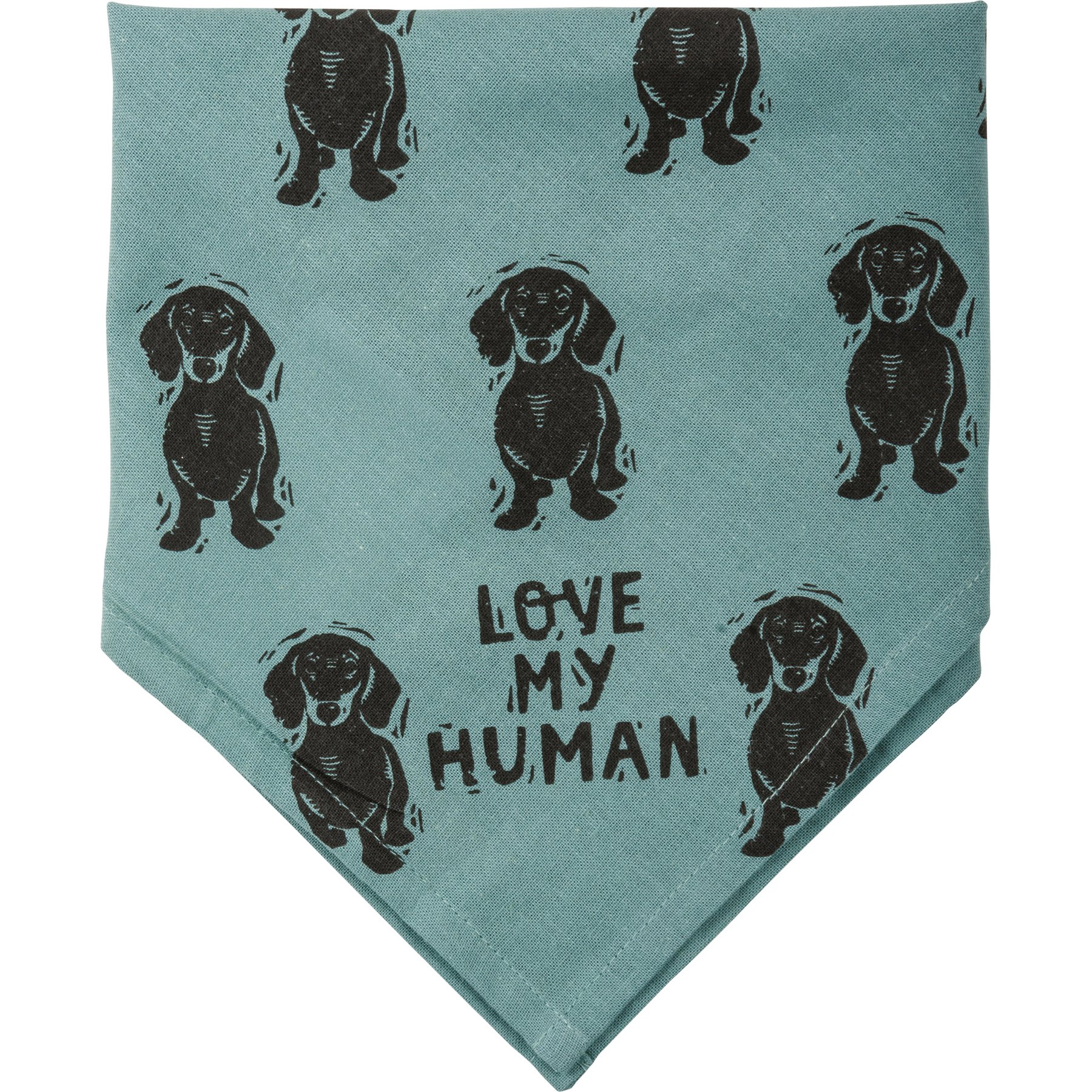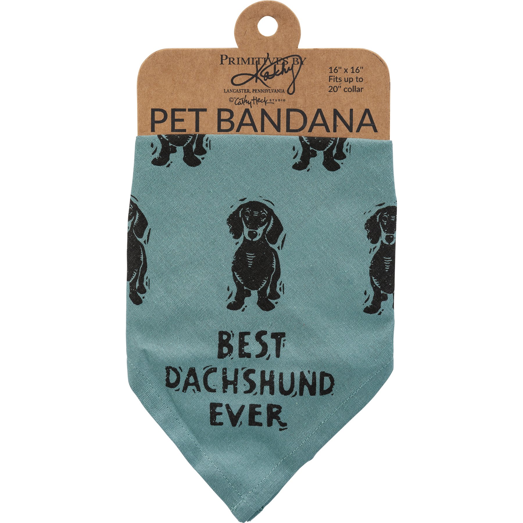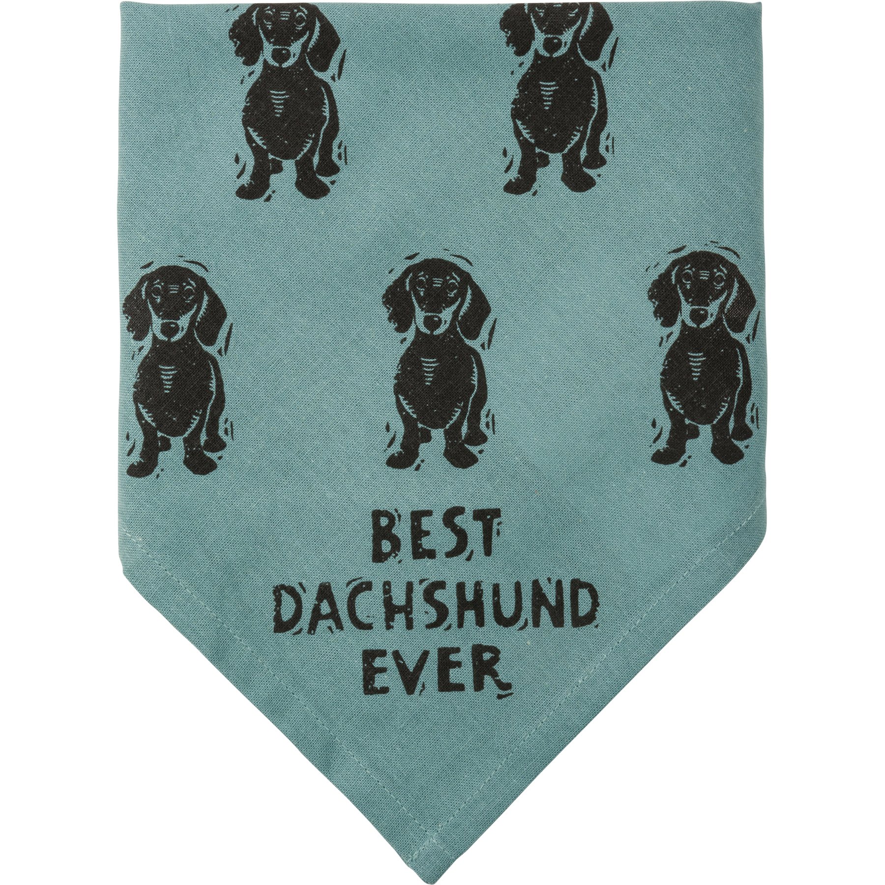 A small reversible pet bandana from our Pet Collection featuring "Best Dachshund Ever" and "Love My Human" sentiments on opposite corners with an all-over block print dachshund design. Bandana is made of cotton and is machine-washable. Best Dachshund Ever pet bandana coordinates with our Love My Dachshund Baseball Cap for matching dog and owner outfits.