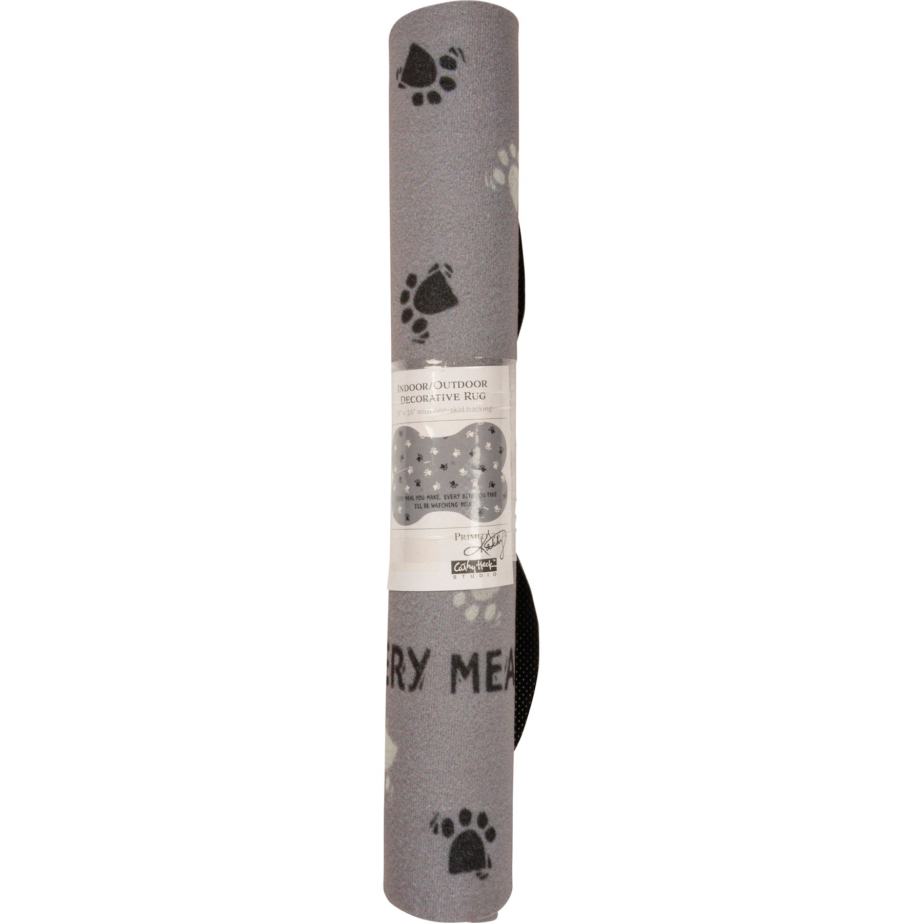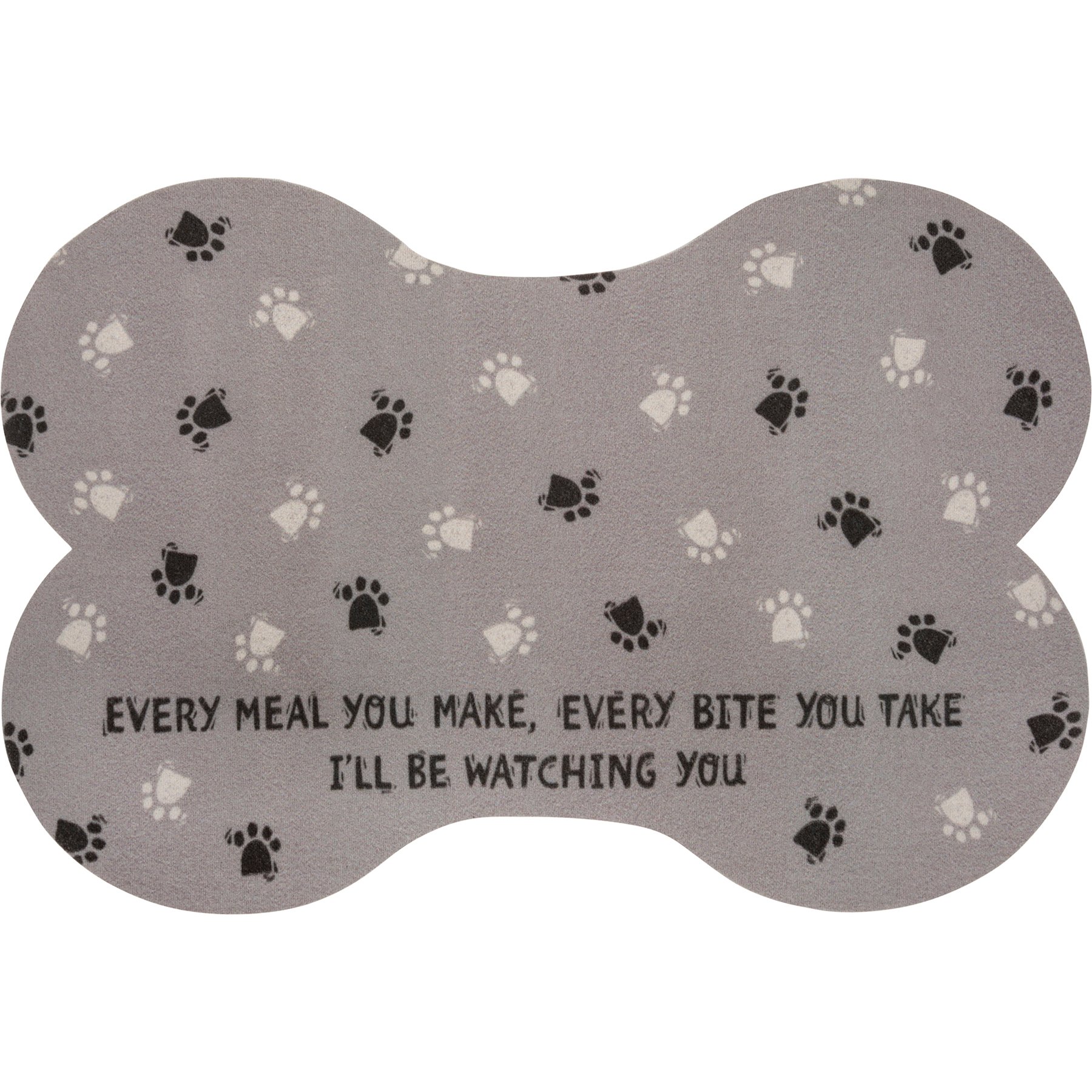 A large dog bone shaped polyester pet mat from our Pet Collection featuring a block print paw print design, and "Every Meal You Make, Every Bite You Take I'll Be Watching You" sentiment. Features skid-resistant backing. Comes neatly rolled with tag displaying full design. Our Dog Food Mat is perfect for placing food and water bowls to lessen floor mess.