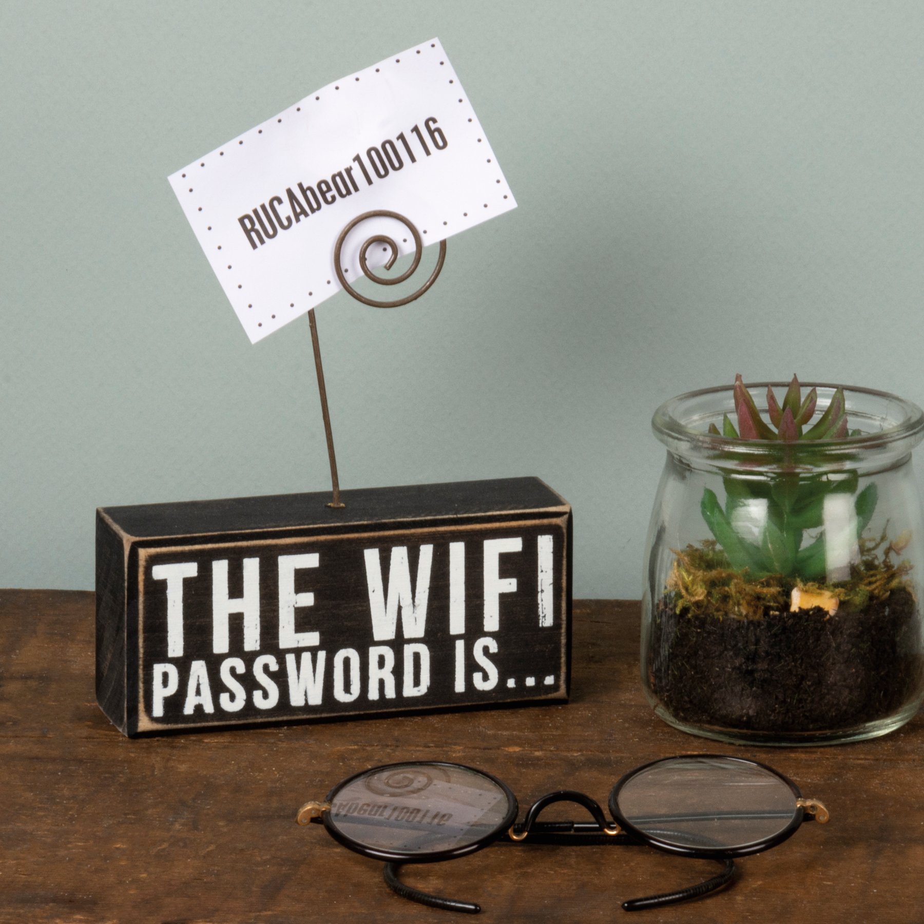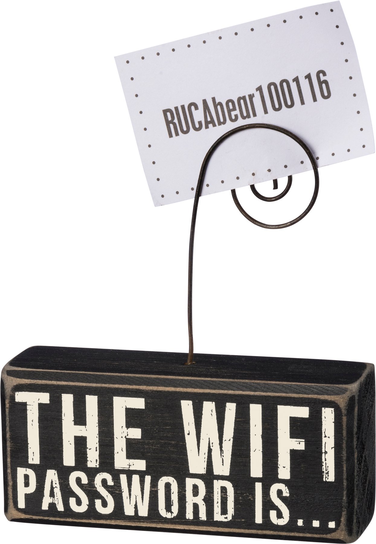 A classic black and white photo block featuring a distressed "The Wifi Password Is..." sentiment with top spiral wire holder to display password to guests. Not eligible for discounting.